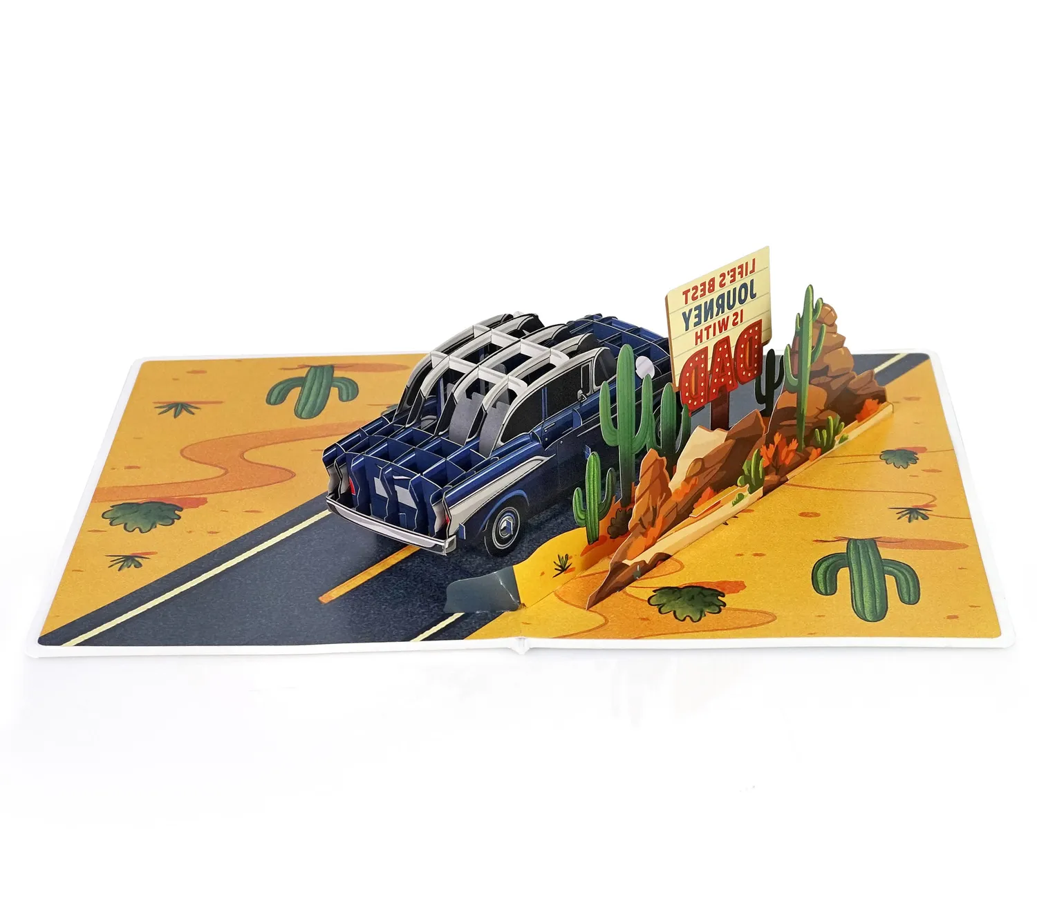 3D Model Vintage Car To Happy Father’s Day designed with a nostalgic road trip theme to celebrate Father’s Day. At the center of the card is a classic vintage blue car, beautifully detailed with chrome accents and a two-tone paint job, evoking the spirit of old-school adventures. In the background, desert scenery unfolds with tall green cacti, orange rock formations, and a road stretching into the horizon. A large retro-style sign reads: “LIFE’S BEST JOURNEY IS WITH DAD”, emphasizing the deep bond and cherished memories created while traveling or simply spending time with one’s father.