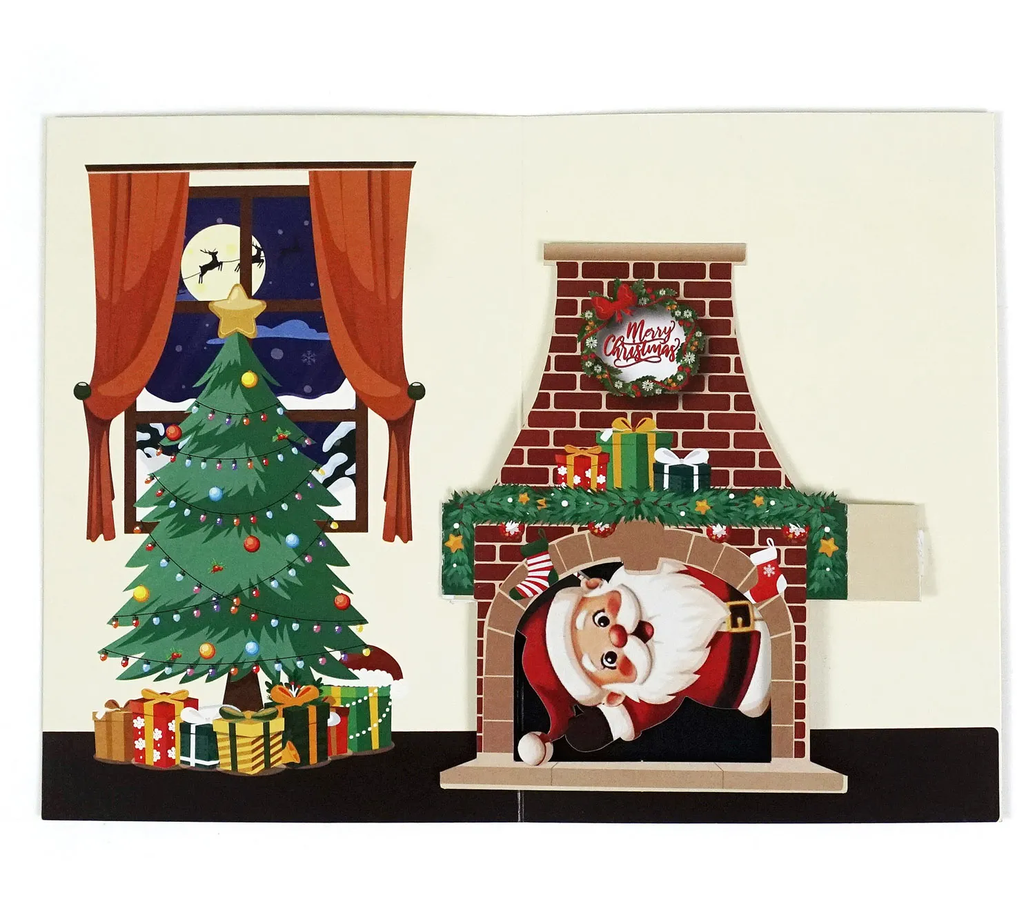 The special highlight and interesting thing about the card is that it can create movement in the image of Santa Claus in the chimney sticking his head out of the fireplace, creating more interaction for the user. He wears a familiar red outfit, a fluffy white beard and a smiling face, his eyes sparkle mischievously. The big gift bag on his back seems to contain countless surprises. On both sides of the fireplace, there are two Christmas stockings hanging, reminiscent of the small gifts that Santa Claus will put in there.