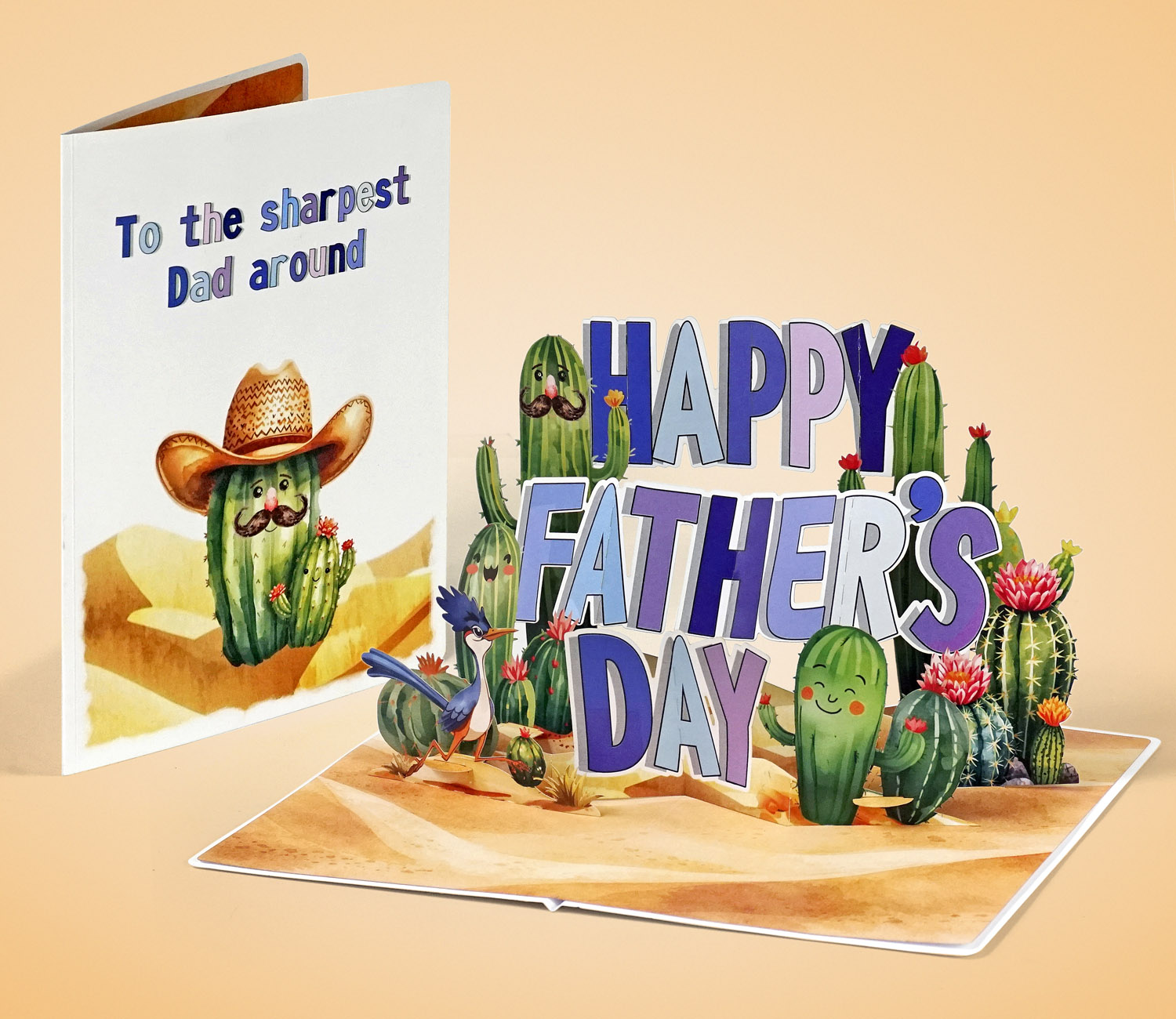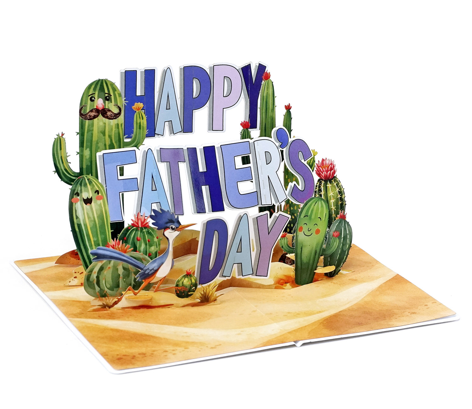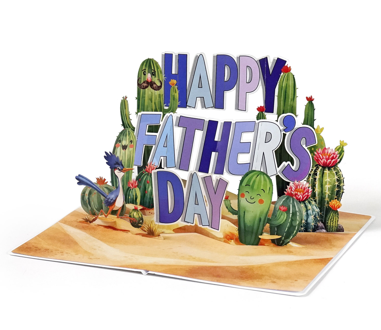 3D Pop-Up Father’s Day Card with Cute Cactus is a playful pop-up card designed for Father’s Day, with bold “HAPPY FATHER’S DAY” lettering surrounded by adorable cartoon cacti in a desert setting. The cacti have cheerful expressions, some with mustaches, adding a fun and lighthearted touch. Bright colors and layered elements create an engaging 3D effect that brings the scene to life.