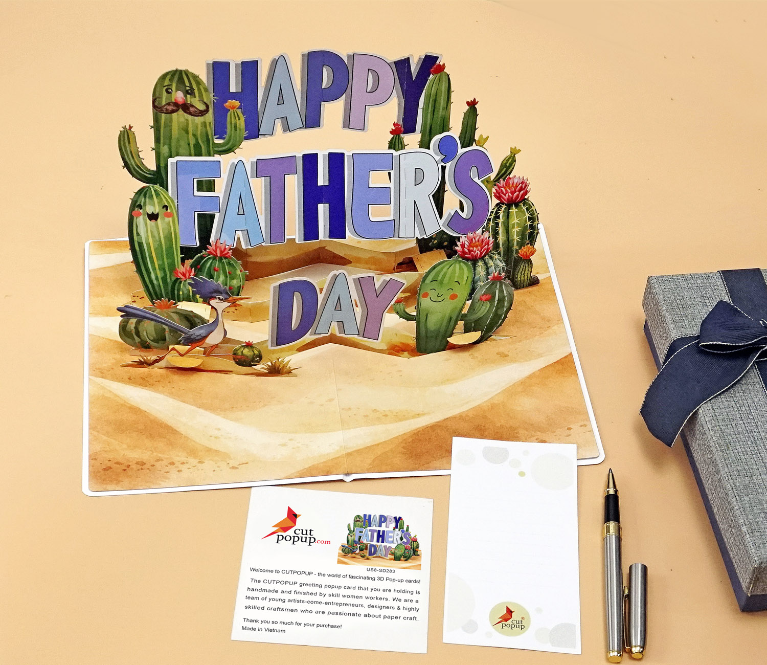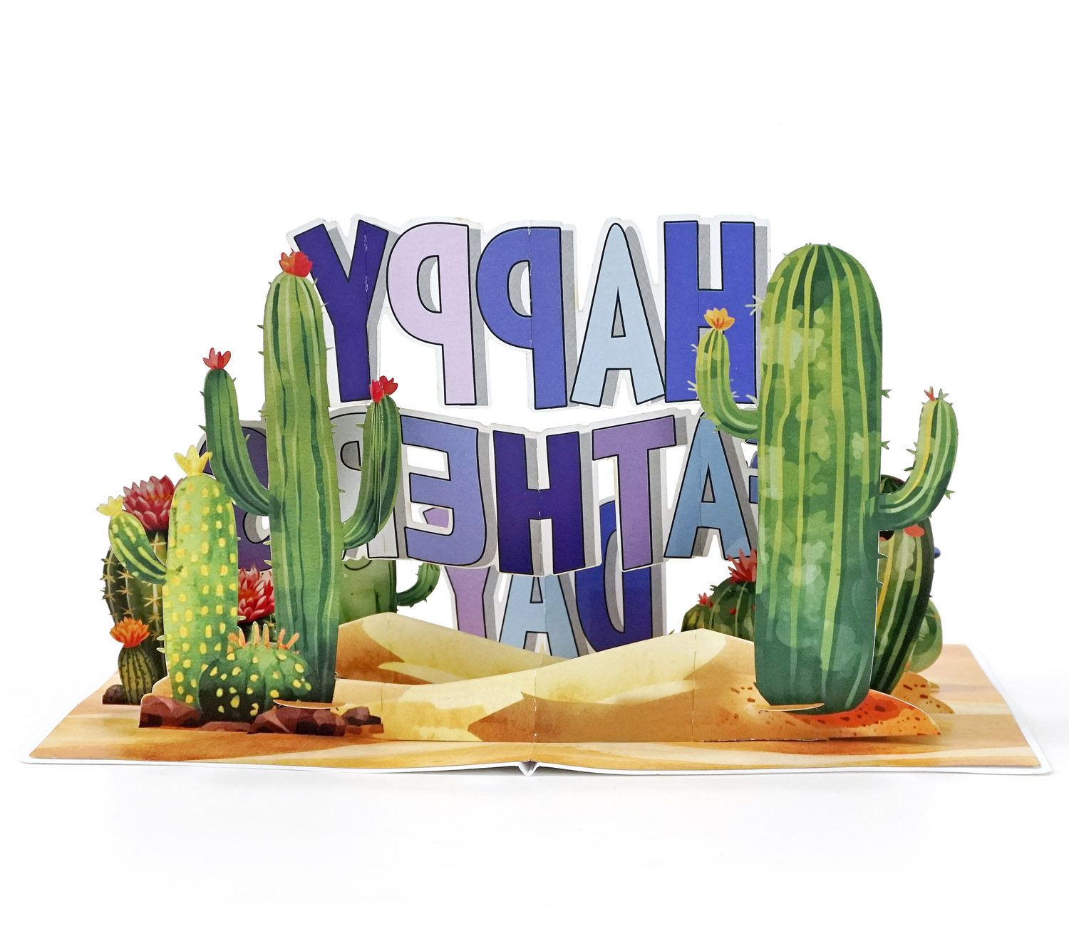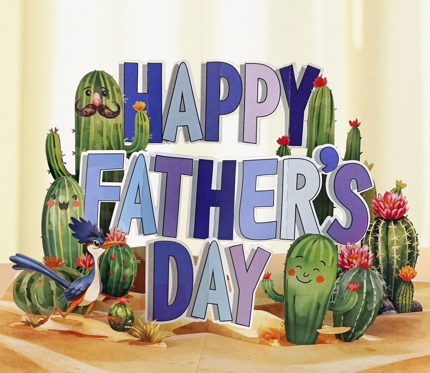 3D Pop-Up Father’s Day Card with Cute Cactus is a playful pop-up card designed for Father’s Day, with bold “HAPPY FATHER’S DAY” lettering surrounded by adorable cartoon cacti in a desert setting. The cacti have cheerful expressions, some with mustaches, adding a fun and lighthearted touch. Bright colors and layered elements create an engaging 3D effect that brings the scene to life.