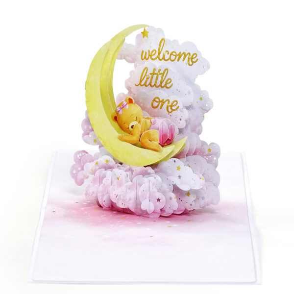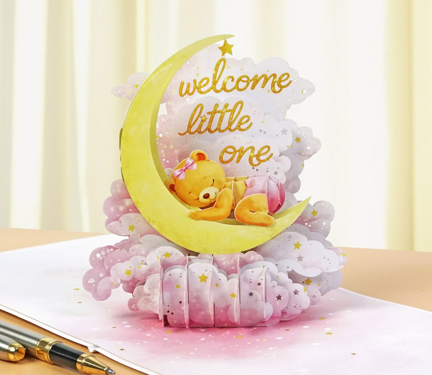 3D Pop-up Greeting Card for Newborn with Moon & Teddy Bear (Pink) captures the peaceful magic of welcoming a newborn. At the center, a sweet sleeping teddy bear rests gently on a glowing crescent moon, surrounded by soft clouds and tiny golden stars. The message “Welcome Little One” is elegantly displayed above, adding a warm and loving touch to the design.