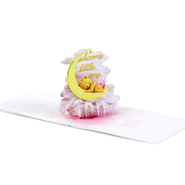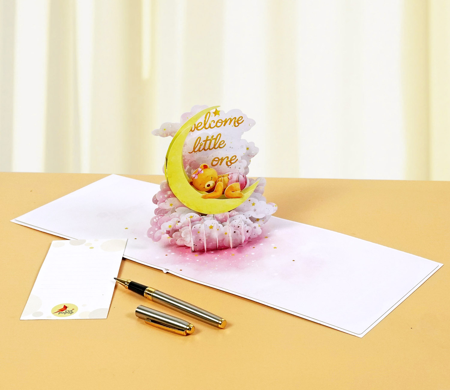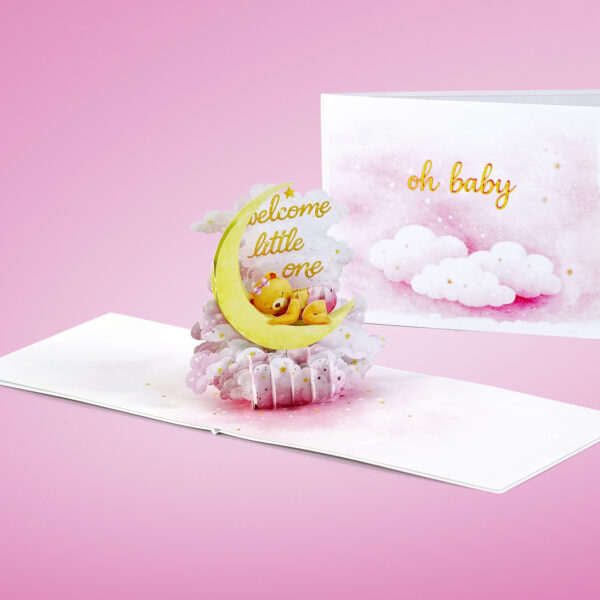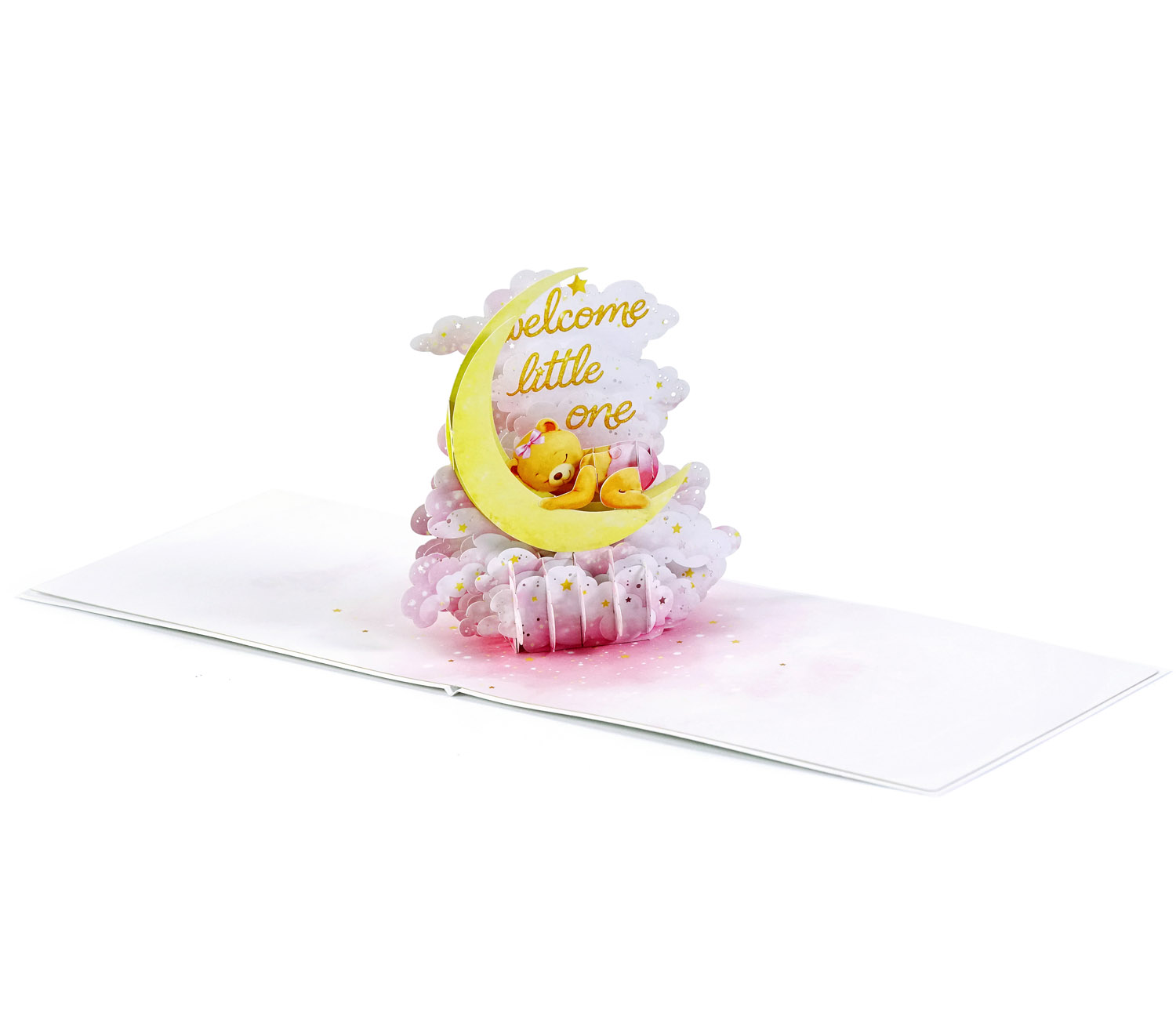 3D Pop-up Greeting Card for Newborn with Moon & Teddy Bear (Pink)