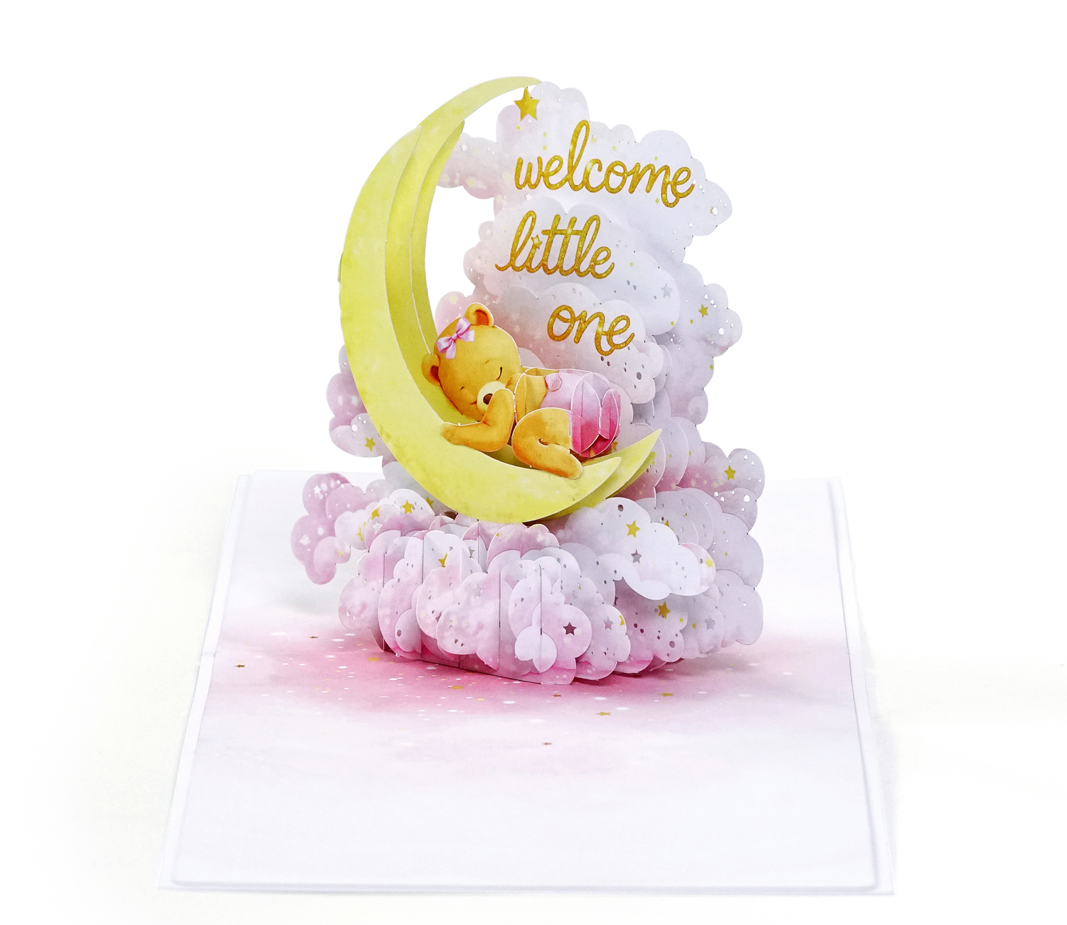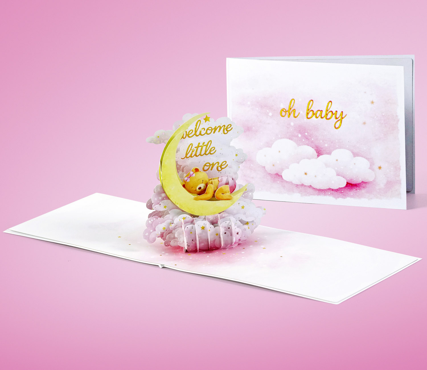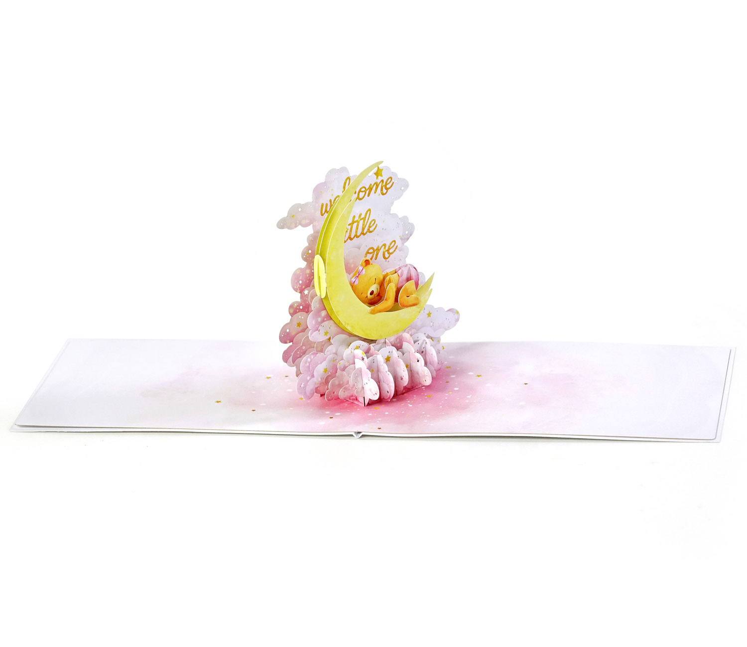 3D Pop-up Greeting Card for Newborn with Moon & Teddy Bear (Pink)