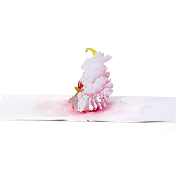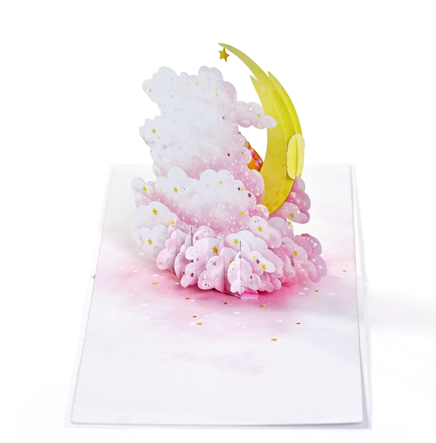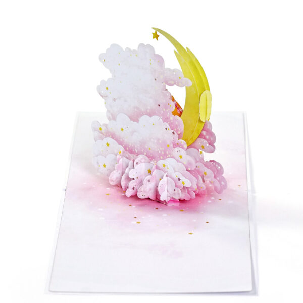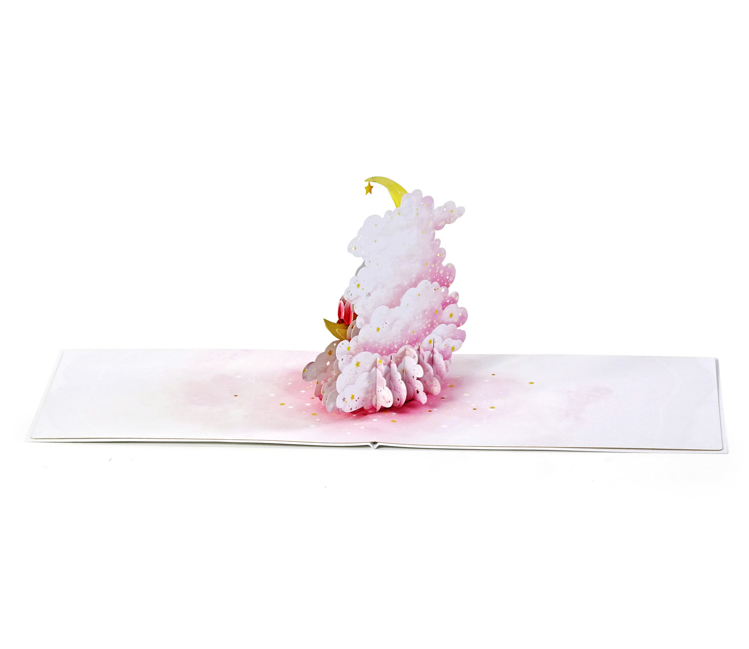 The calming color palette of pink, gentle yellows, and soft whites creates a soothing nighttime scene, symbolizing comfort and protection. As the card opens, the layered paper structure brings the dreamy sky to life, creating a delightful surprise and a truly memorable visual experience. Carefully crafted with fine details and smooth contours, this card is both a greeting and a keepsake that parents will cherish.