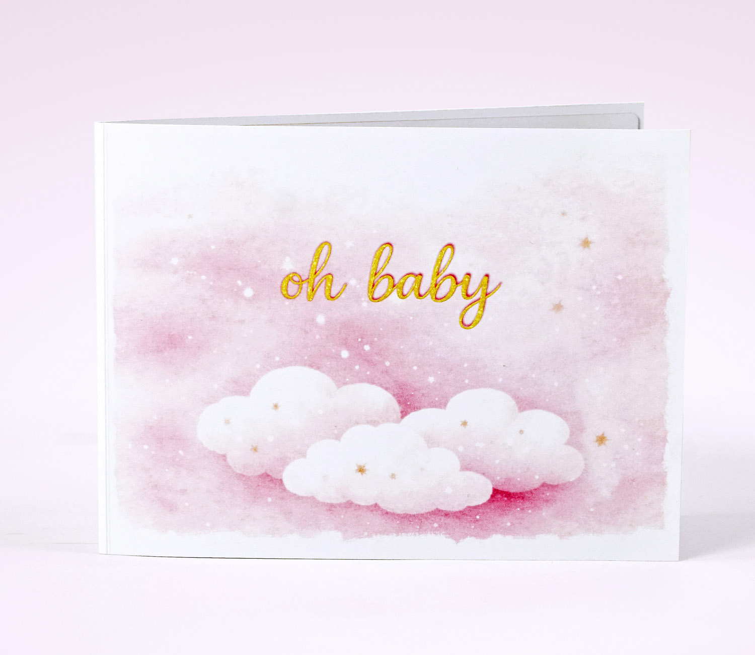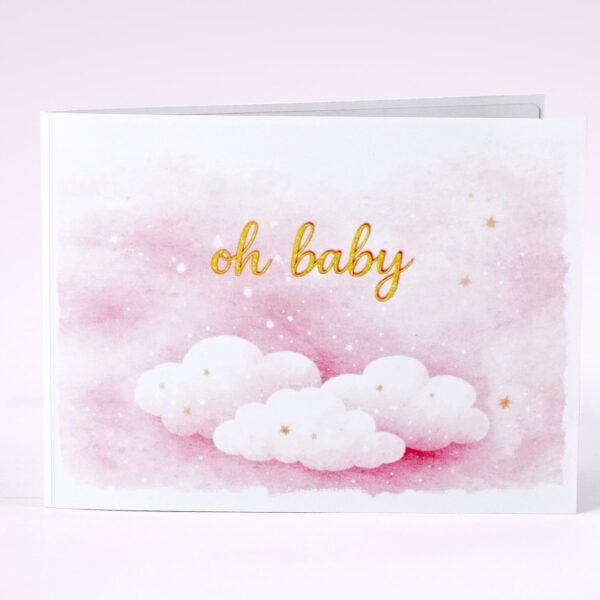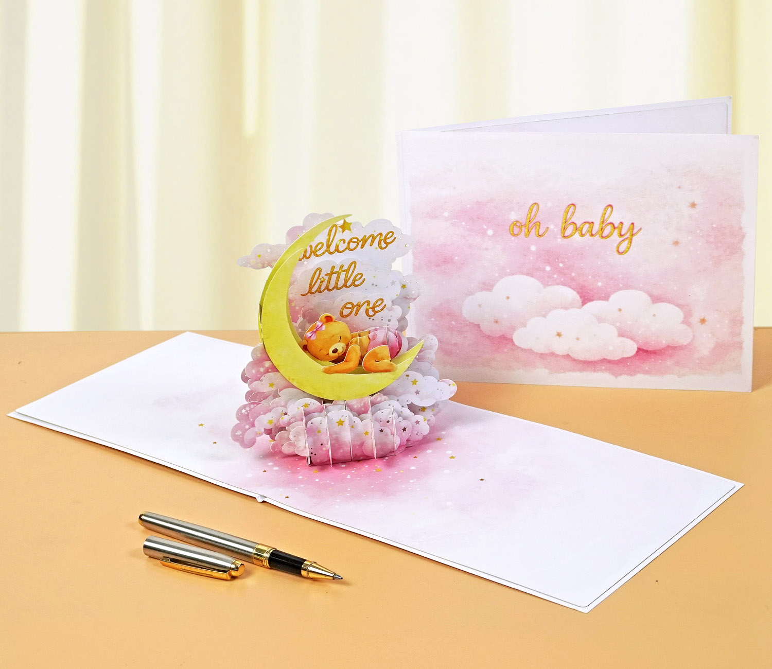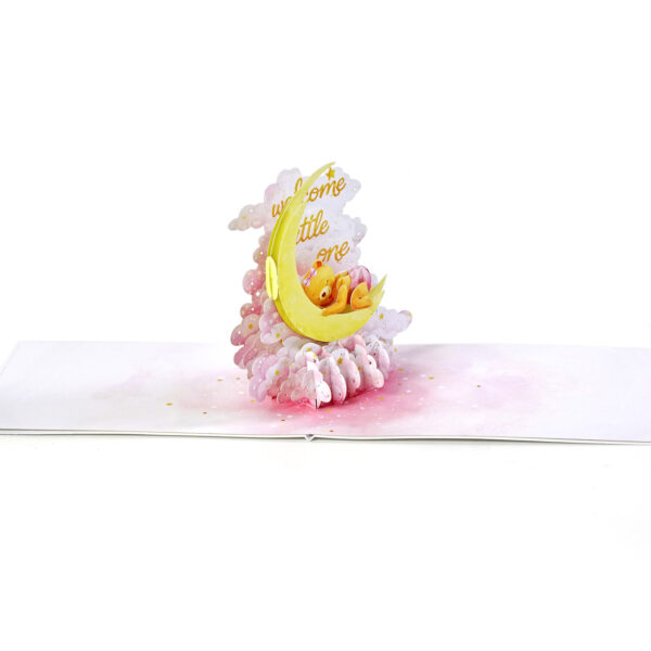The calming color palette of pink, gentle yellows, and soft whites creates a soothing nighttime scene, symbolizing comfort and protection. As the card opens, the layered paper structure brings the dreamy sky to life, creating a delightful surprise and a truly memorable visual experience. Carefully crafted with fine details and smooth contours, this card is both a greeting and a keepsake that parents will cherish.