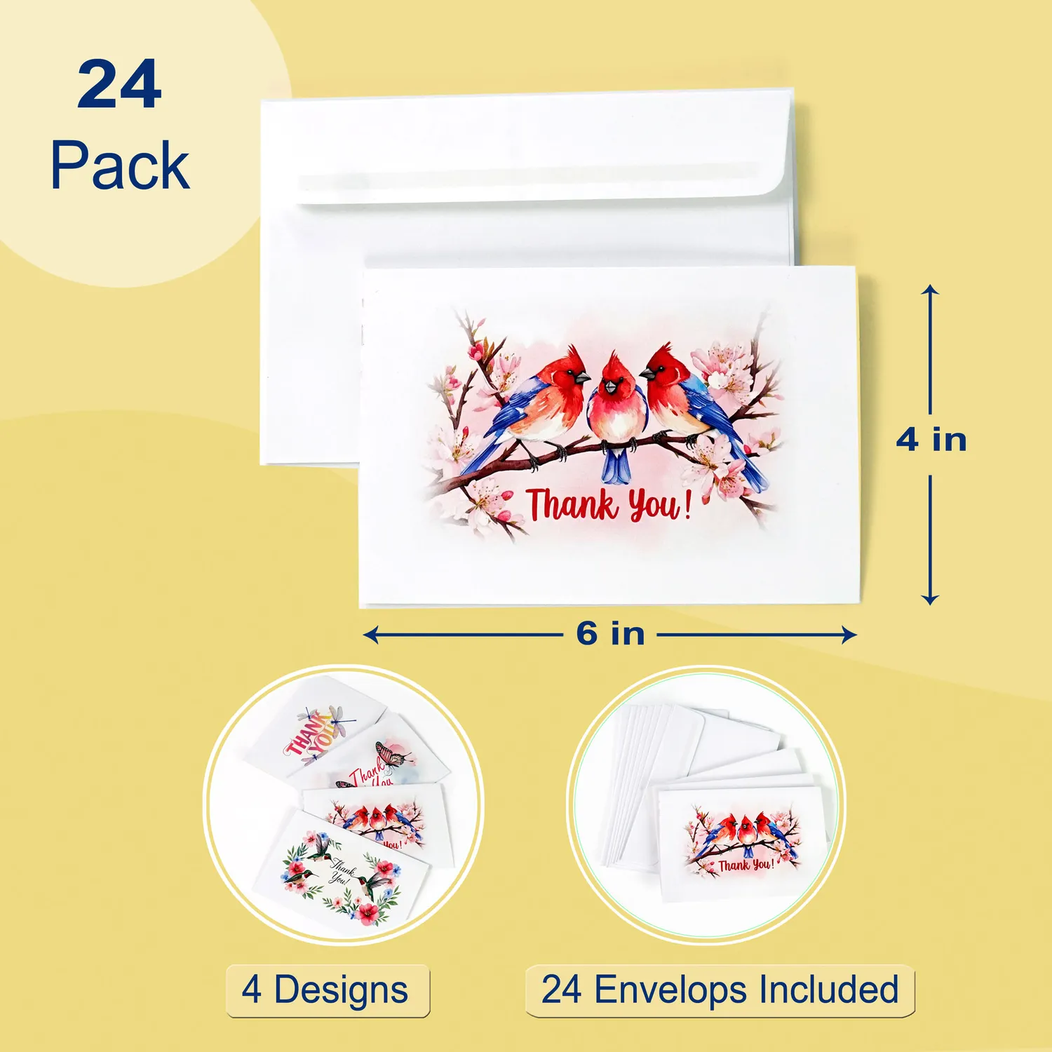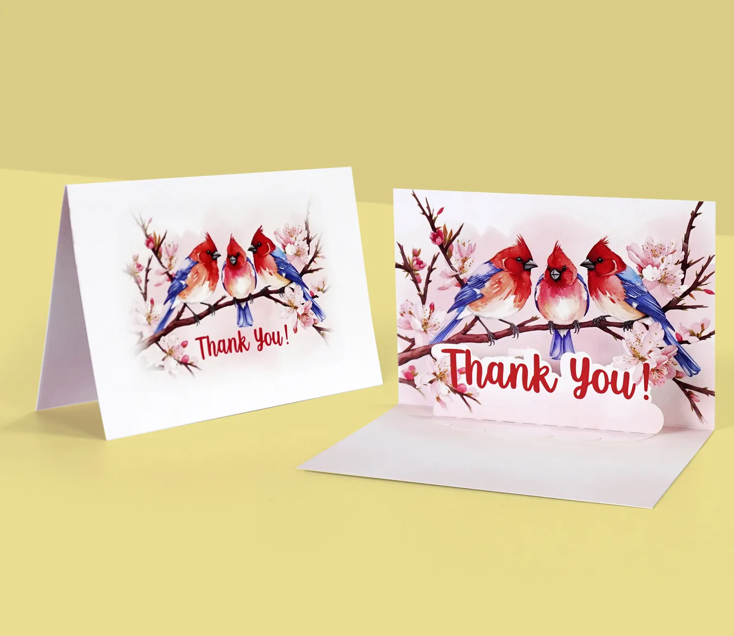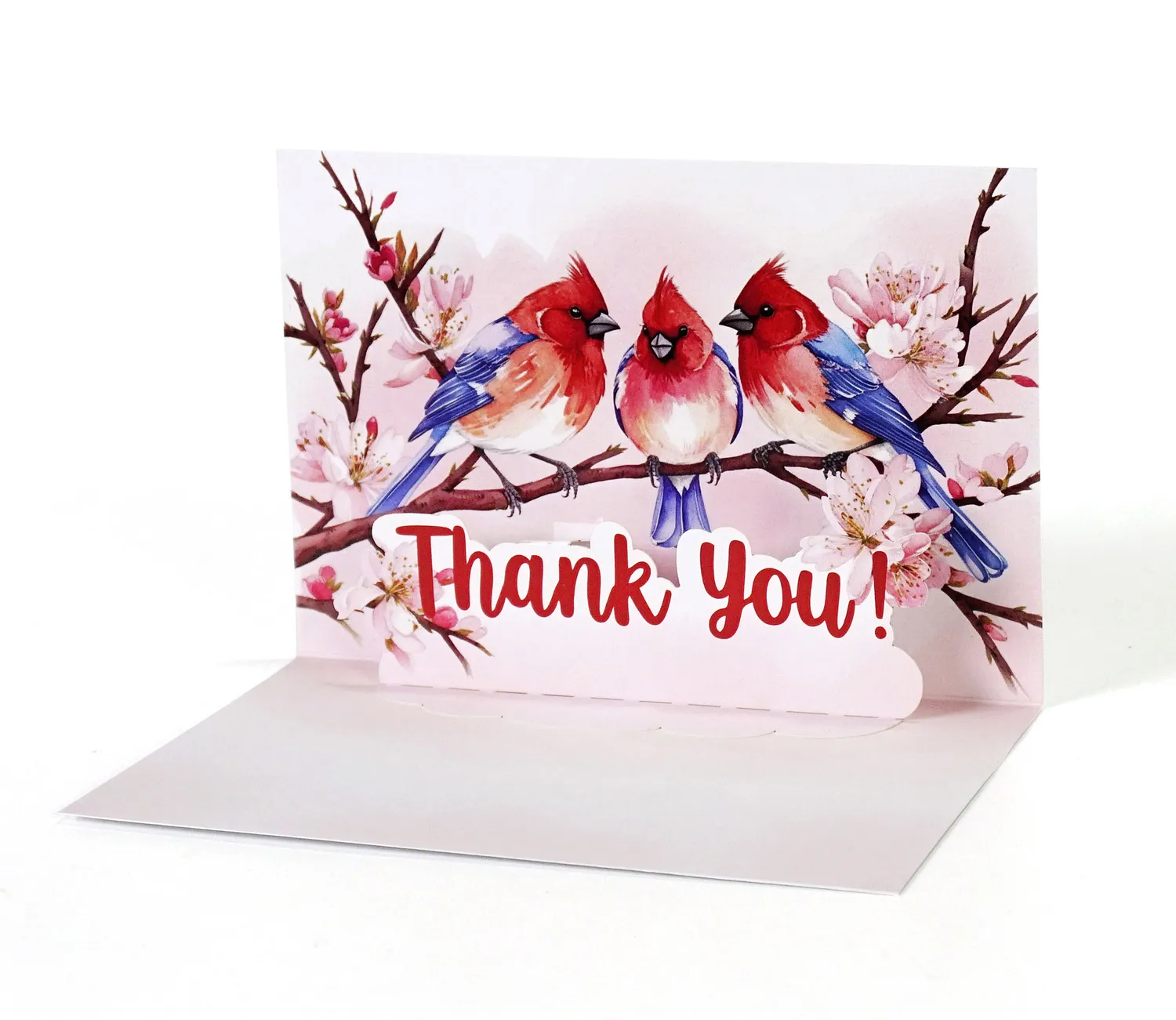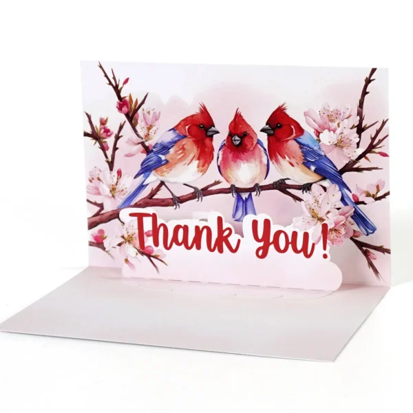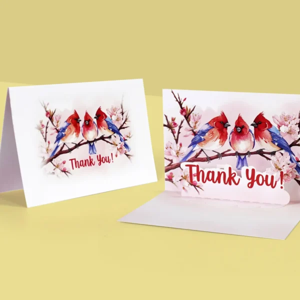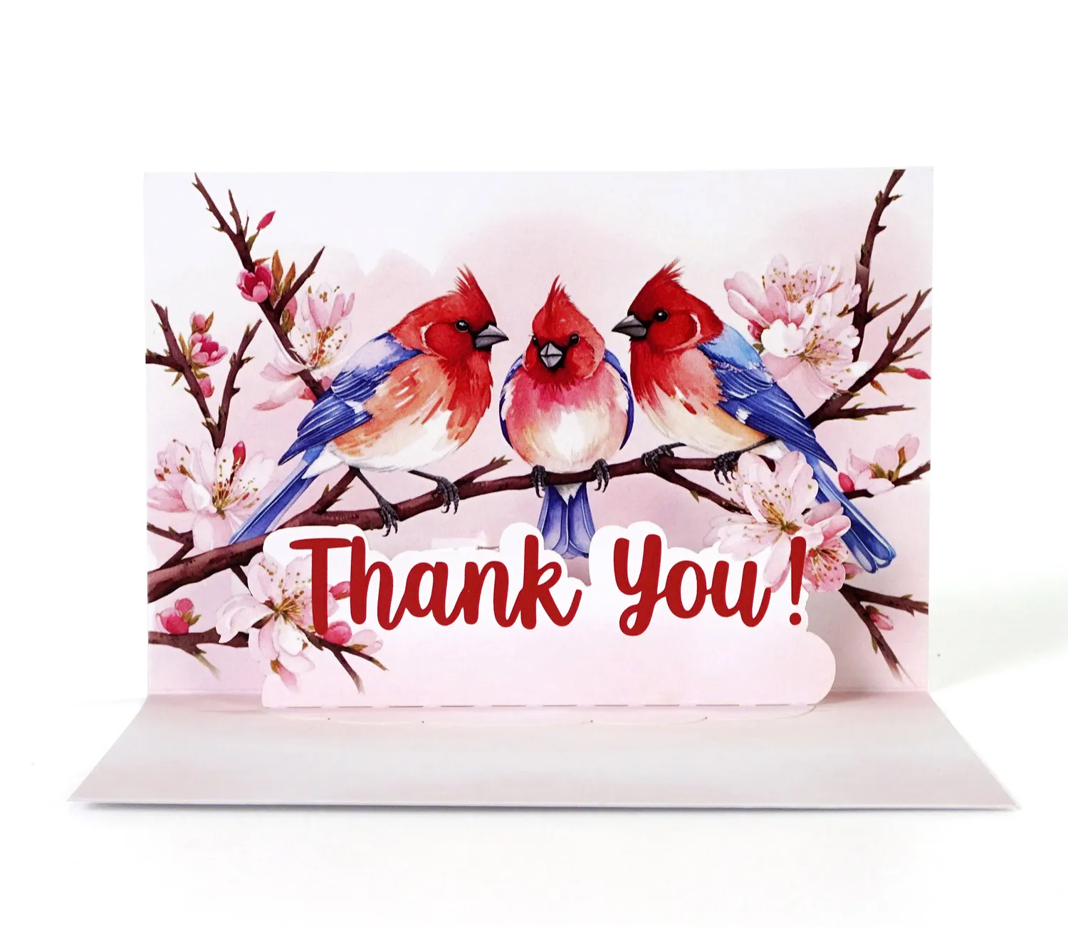 Design: Features three vibrant red cardinals perched on cherry blossom branches. The background is soft and pink, complementing the red “Thank You!” text.