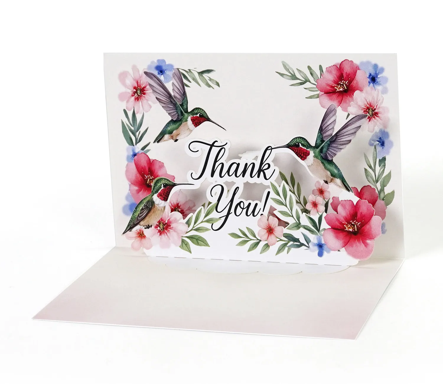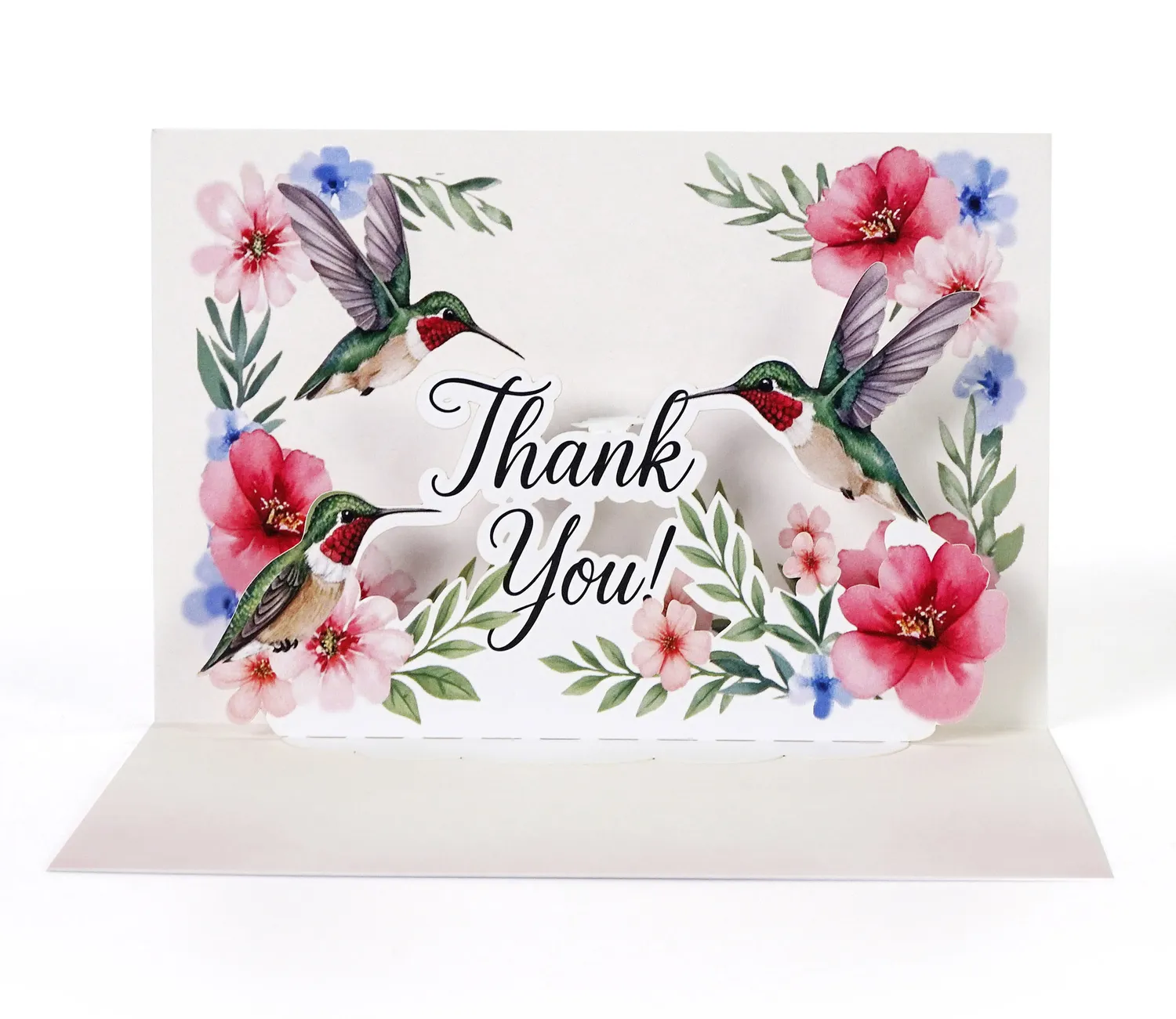Shows two colorful hummingbirds hovering among pink and red flowers with the elegant text “Thank You!” in cursive.