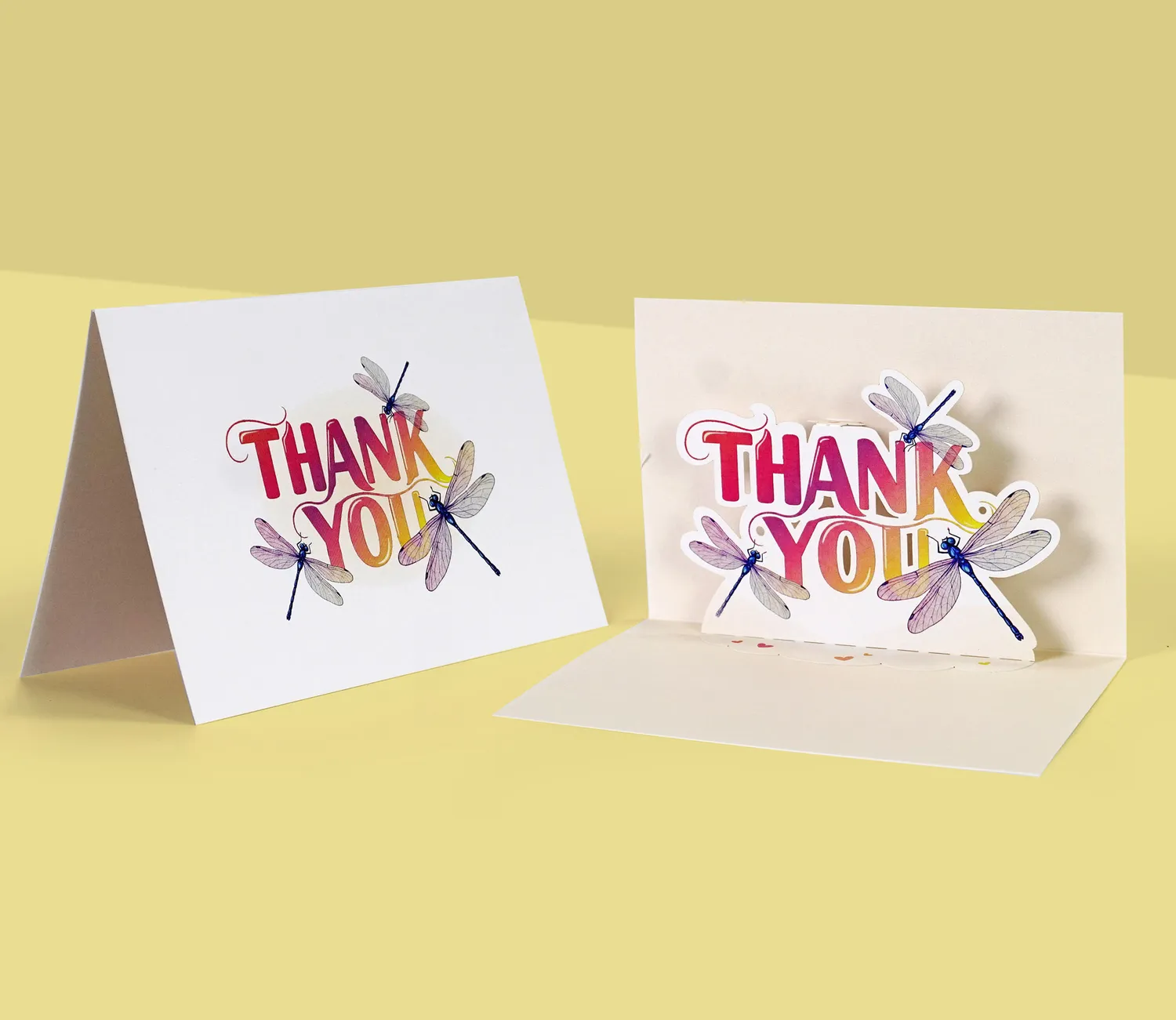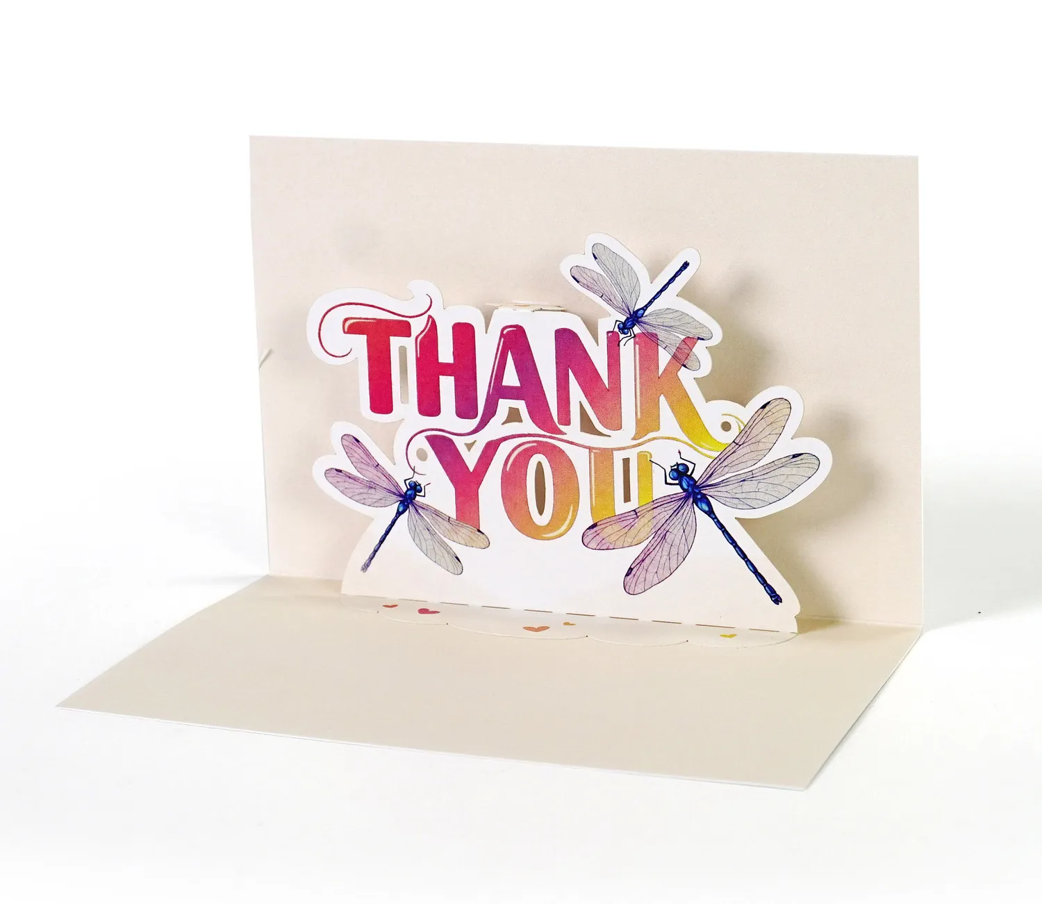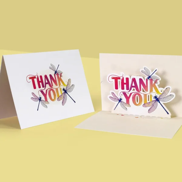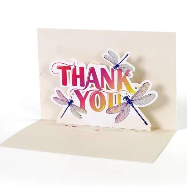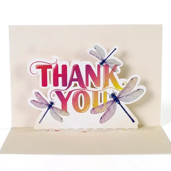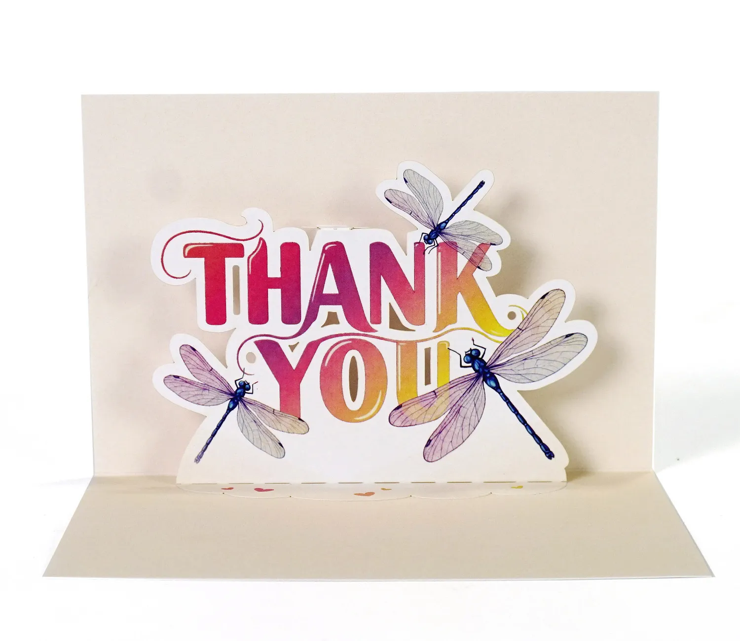 Includes three dragonflies surrounding bold, playful “THANK YOU!” text in red, orange, and yellow tones.