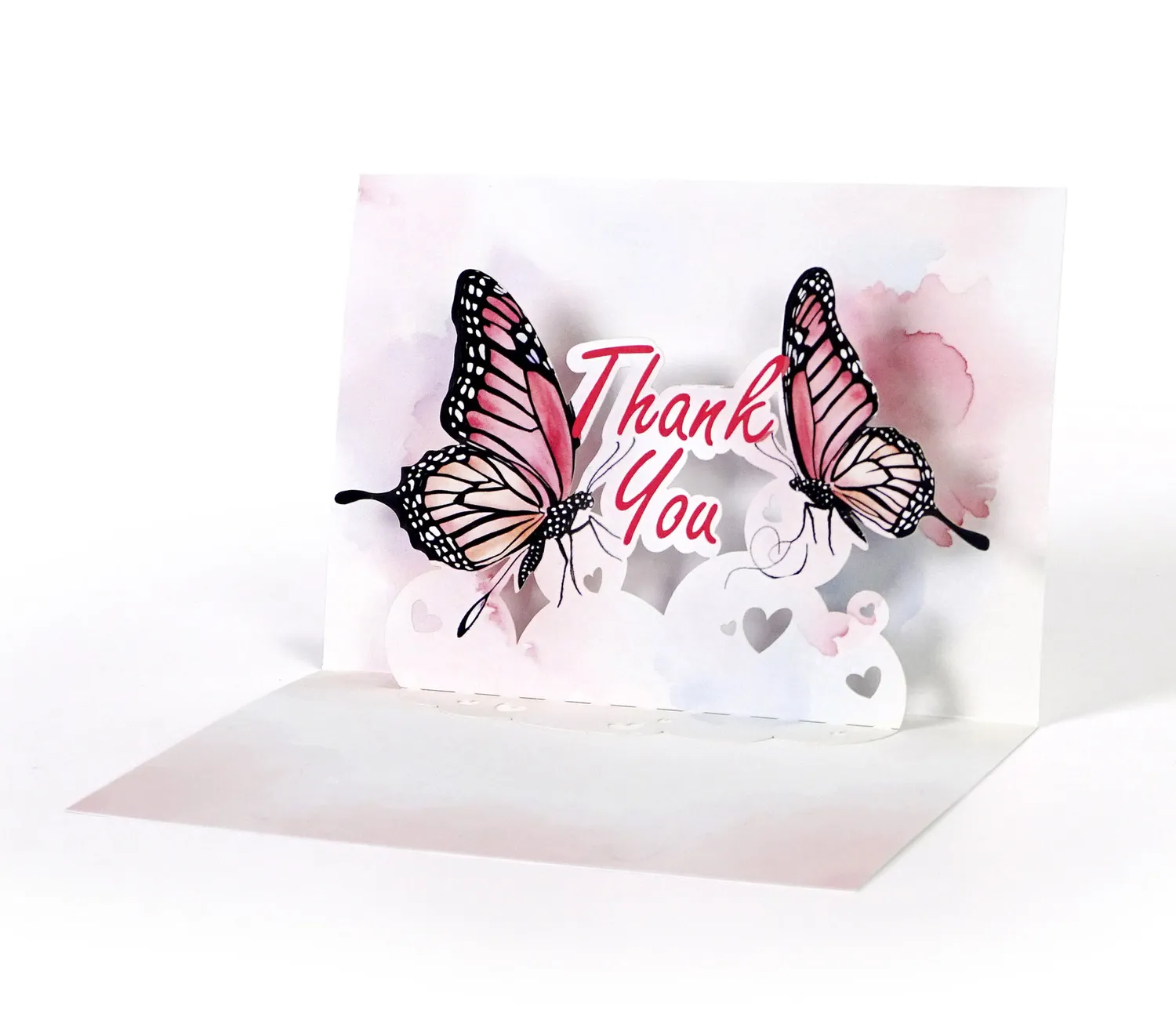Displays two soft pink butterflies with a delicate heart motif and red cursive text reading “Thank You”.