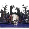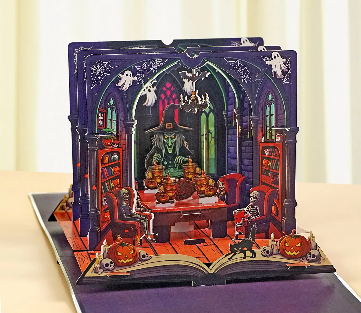 3D Skyline greeting cards to happy Halloween reimagined in a 3D Skyline style, where the haunted scene rises in layered dimensions like a stage brought to life. The gothic arches of the dark castle tower above, casting long shadows, while shelves of spell books and glowing pumpkins fill the space with eerie detail. In the center, the witch commands attention, her cauldron bubbling with golden light, as skeletons, mummies, and ghoulish figures gather around in a chilling yet playful celebration.
