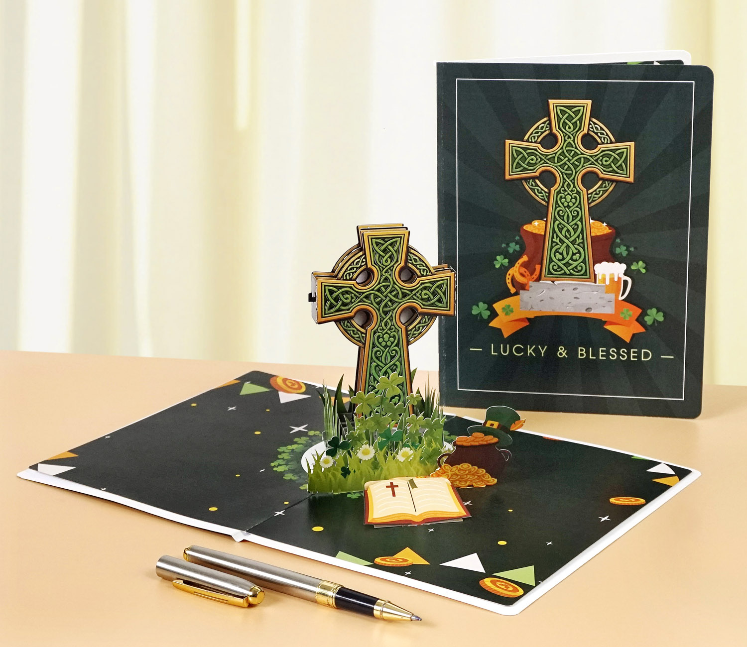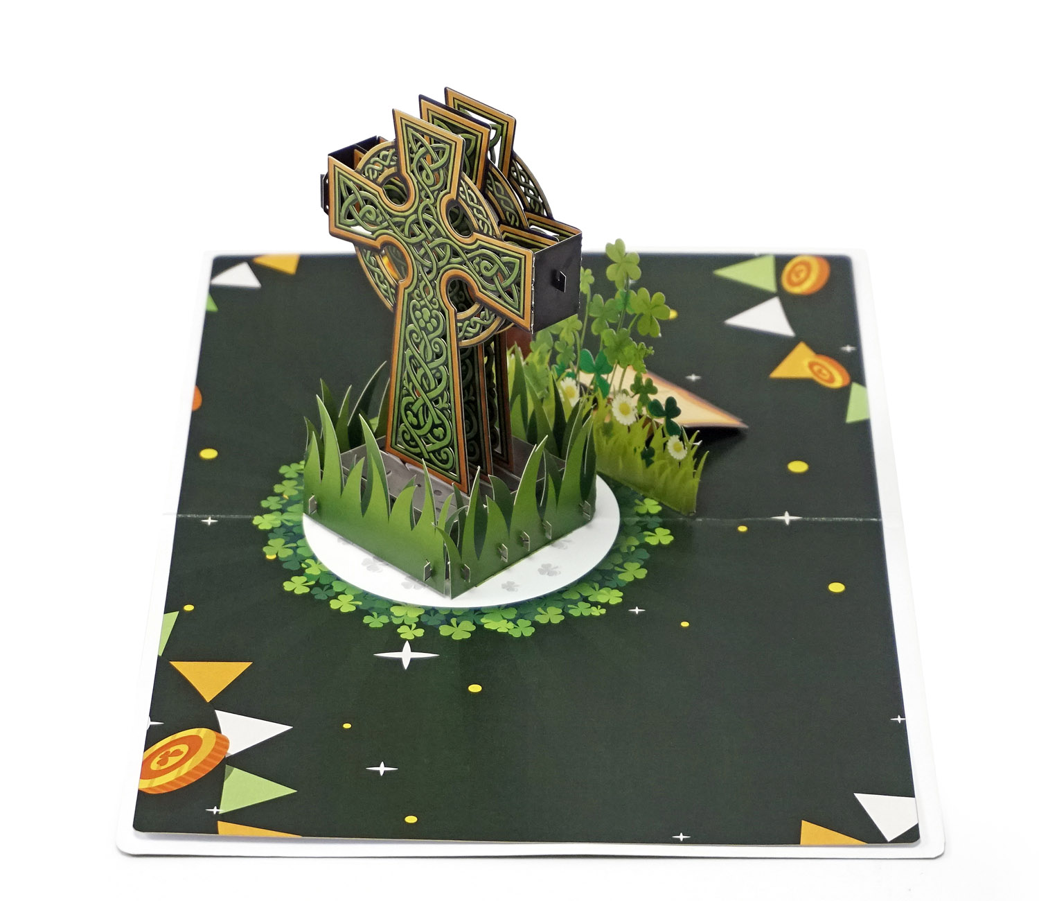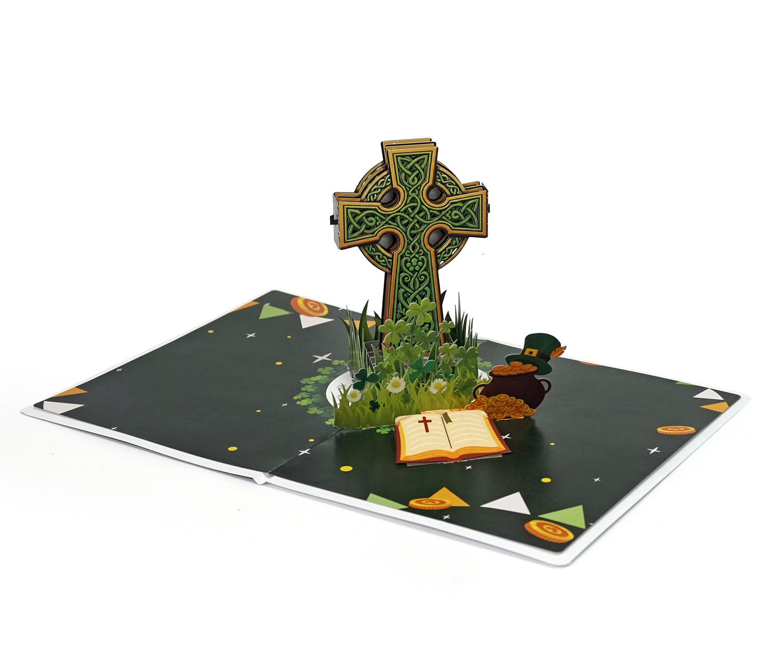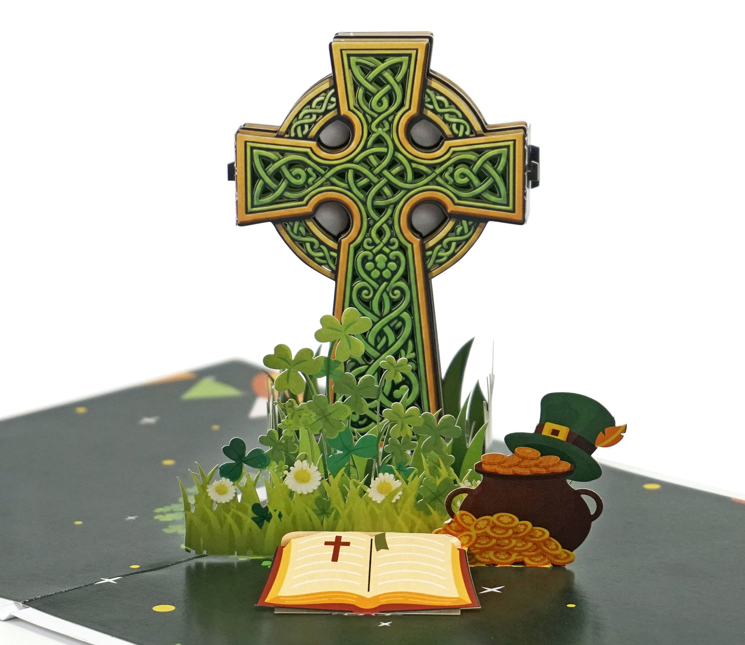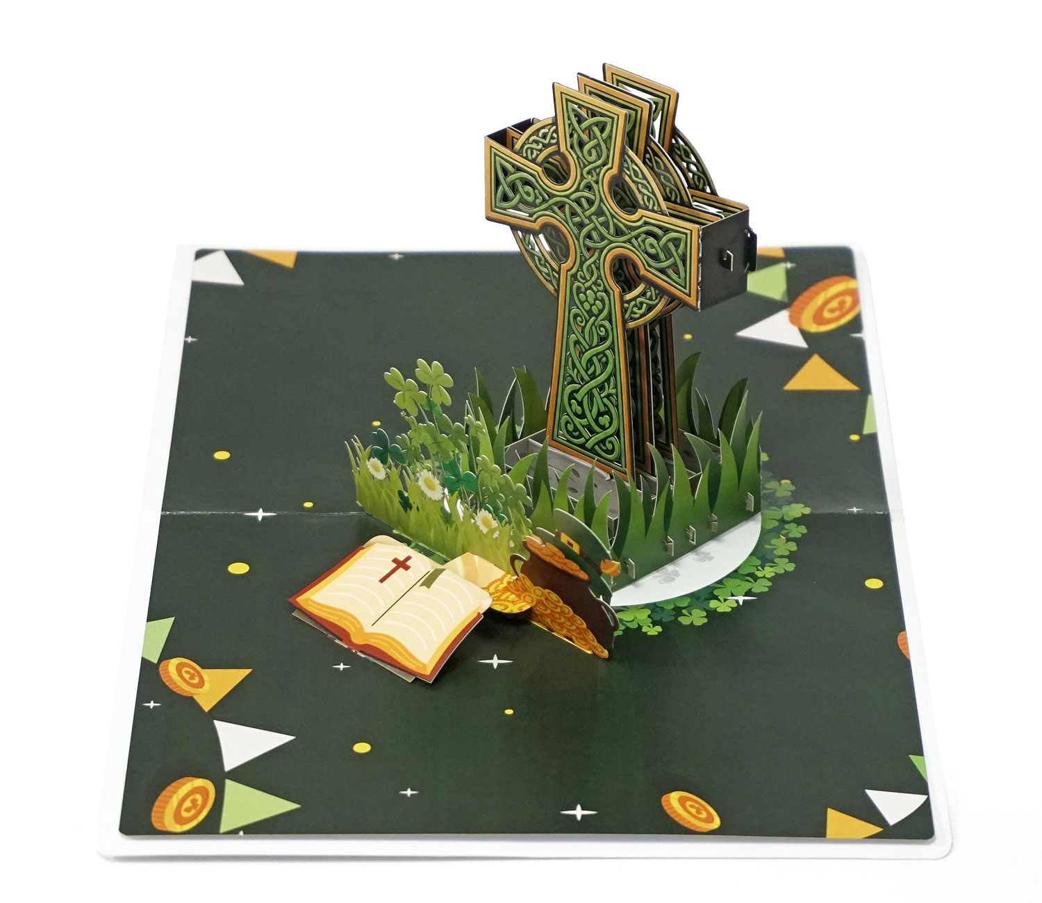 Amazing 3D Pop-Up St. Patrick’s Day Card with Hidden Celtic Cross Surprise Inside is a beautifully crafted pop-up card centered around a detailed Celtic cross in vibrant green and gold tones. Surrounding it are lucky shamrocks, small white flowers, a pot of gold, and an open book, creating a festive and meaningful scene. The intricate design gives the card depth and a sense of discovery when opened.