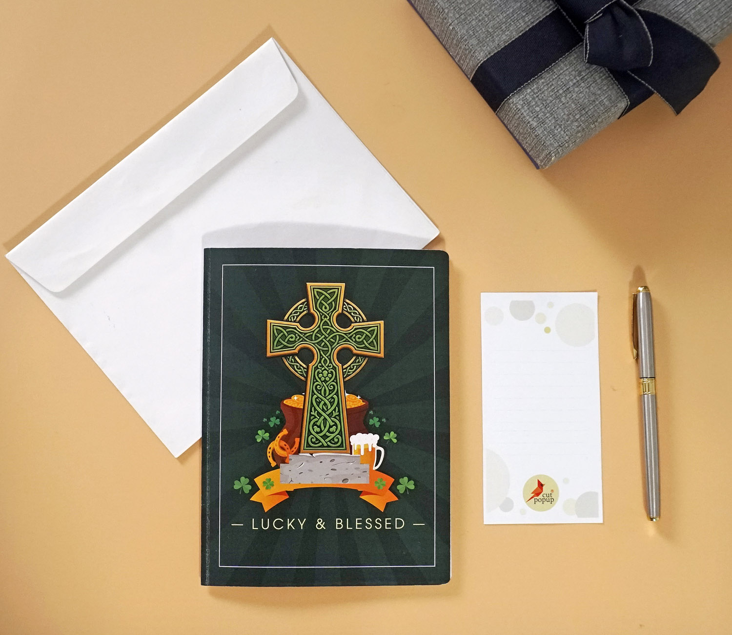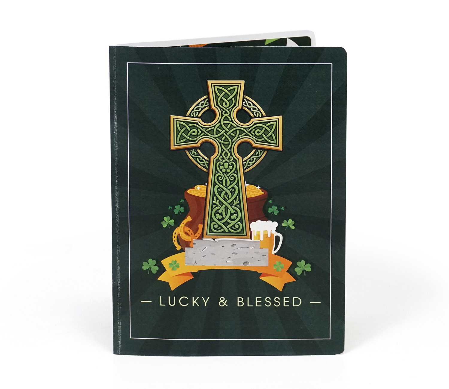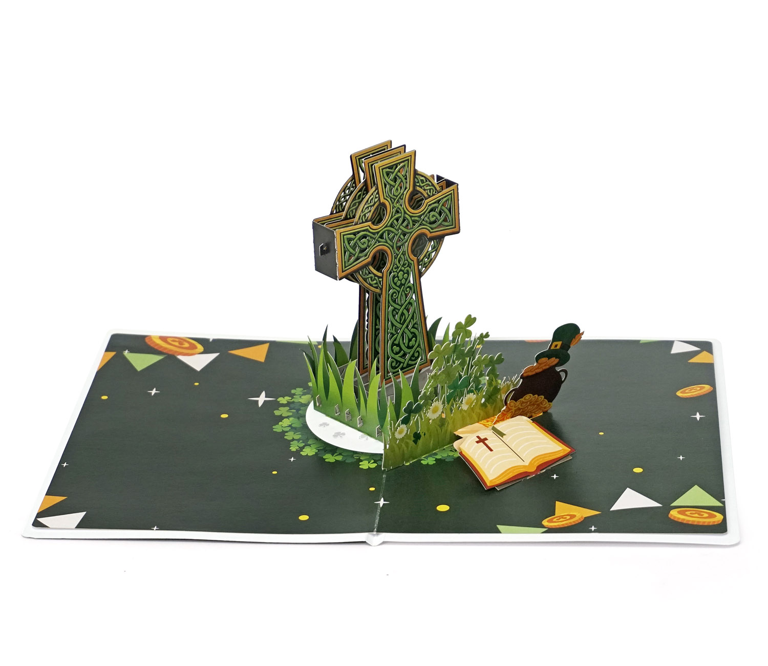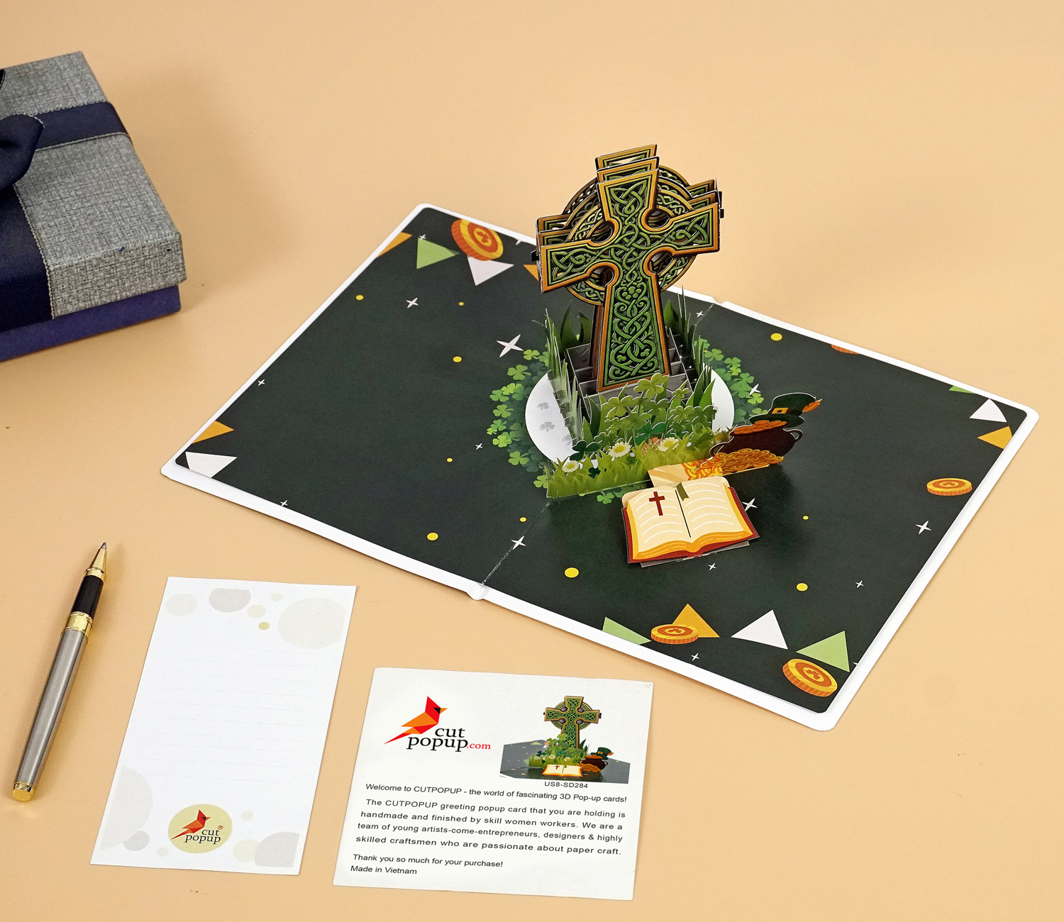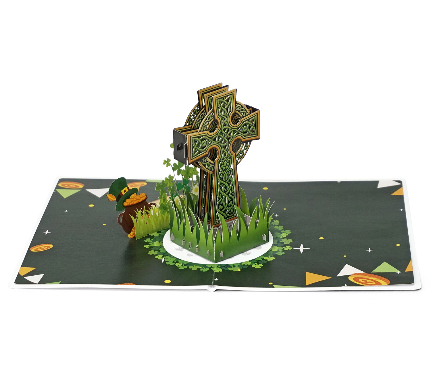 Amazing 3D Pop-Up St. Patrick’s Day Card with Hidden Celtic Cross Surprise Inside is a beautifully crafted pop-up card centered around a detailed Celtic cross in vibrant green and gold tones. Surrounding it are lucky shamrocks, small white flowers, a pot of gold, and an open book, creating a festive and meaningful scene. The intricate design gives the card depth and a sense of discovery when opened.