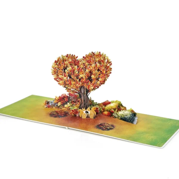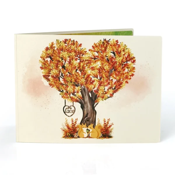 Autumn Love 3D Tree Heart Anniversary Popup Card For Valentine’s Day simulates a heart-shaped autumn tree with vibrant yellow, orange, and red leaves. The tree’s trunk and branches are detailed, supporting the colorful foliage that symbolizes the warmth and beauty of fall. At the base of the tree, two squirrels are depicted holding an acorn together, adding a playful and adorable touch. A small heart-shaped ornament with the word “Love” hangs delicately from the branches, emphasizing themes of affection and togetherness. The card is set against a background resembling a natural autumn landscape, enhancing the overall seasonal charm.