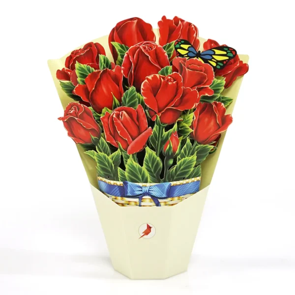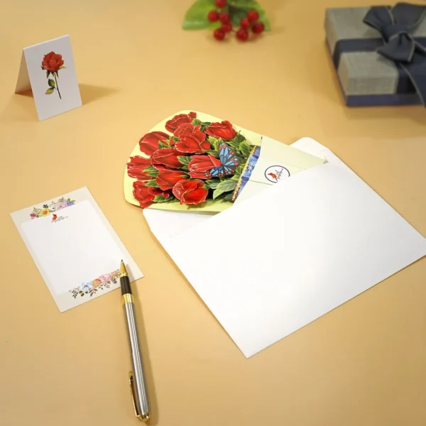 The bouquet flower set Autumn Valentine is a beautifully designed collection of intricately crafted 3D pop-up cards, each showcasing a stunning bouquet of red roses paired with delicate white blossoms and fluttering butterflies. These handmade floral designs are presented in a variety of formats – from elegant basket-shaped bases to envelope-style wraps tied with charming bows. Each card also comes with a coordinating flat card, ideal for writing personalized messages.