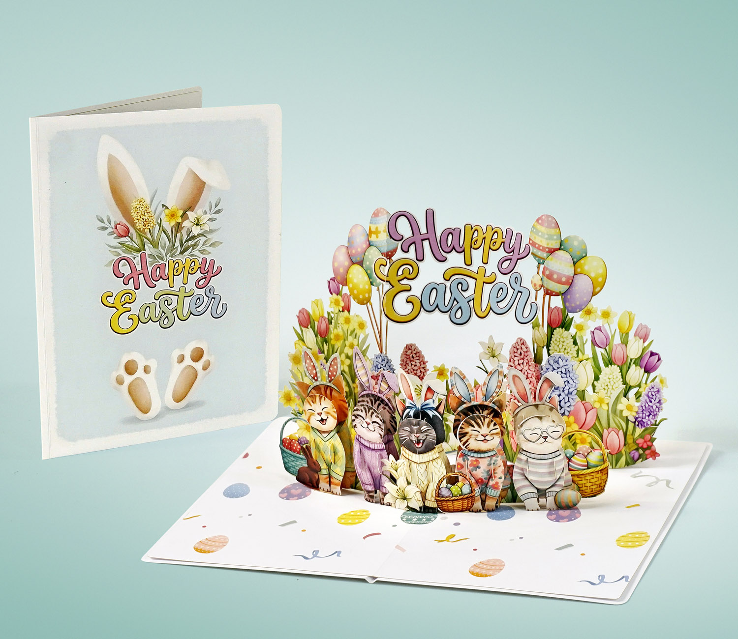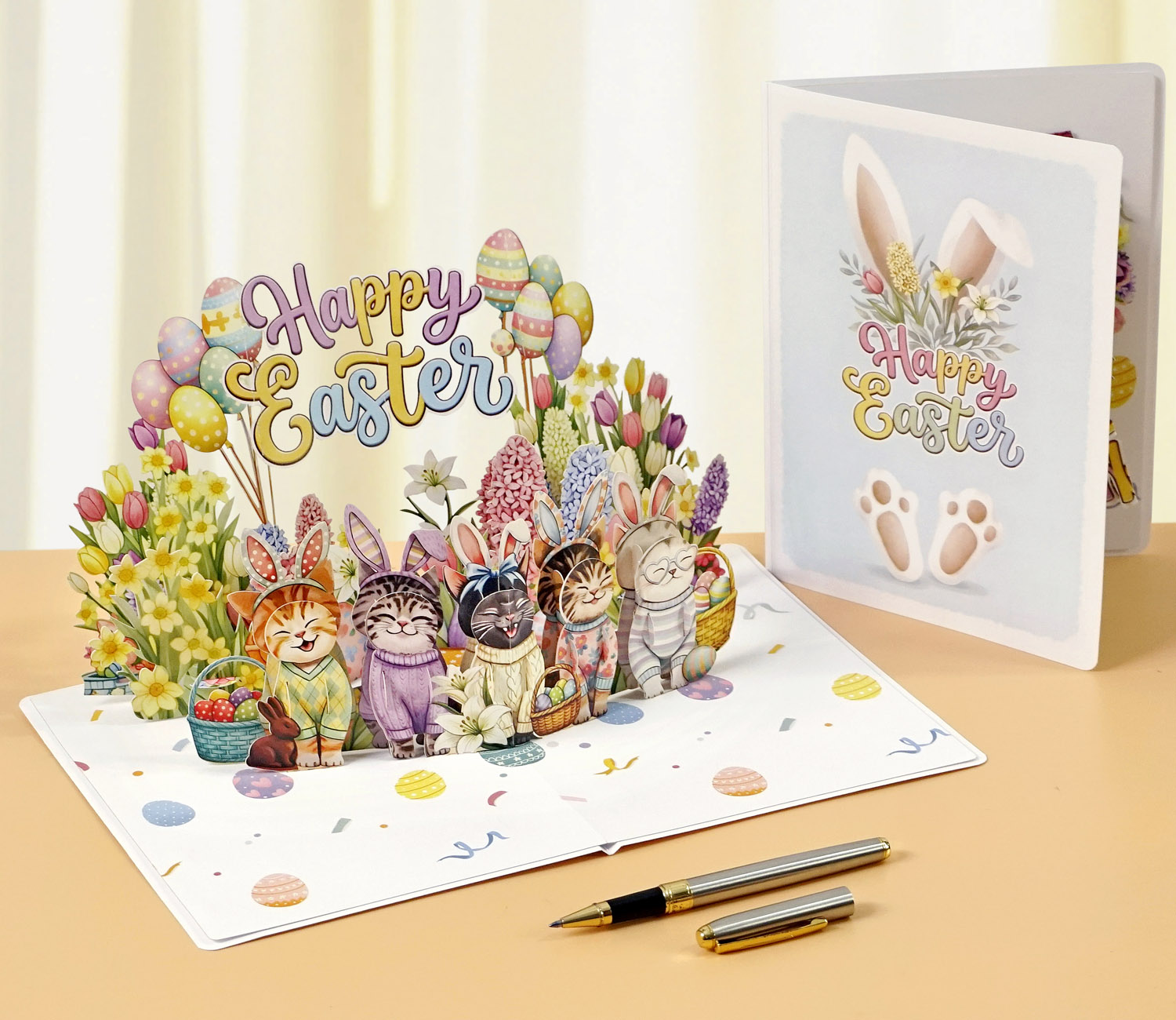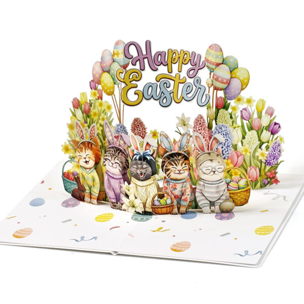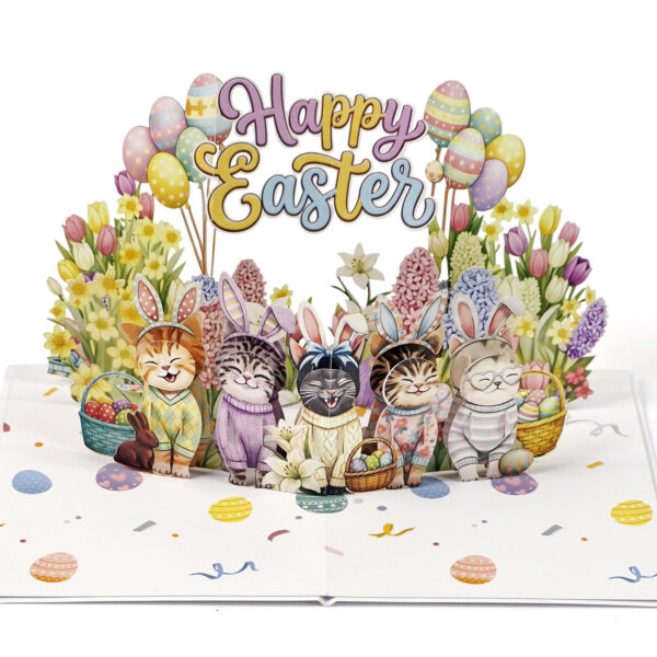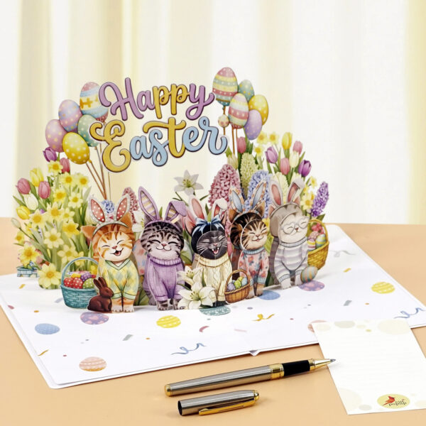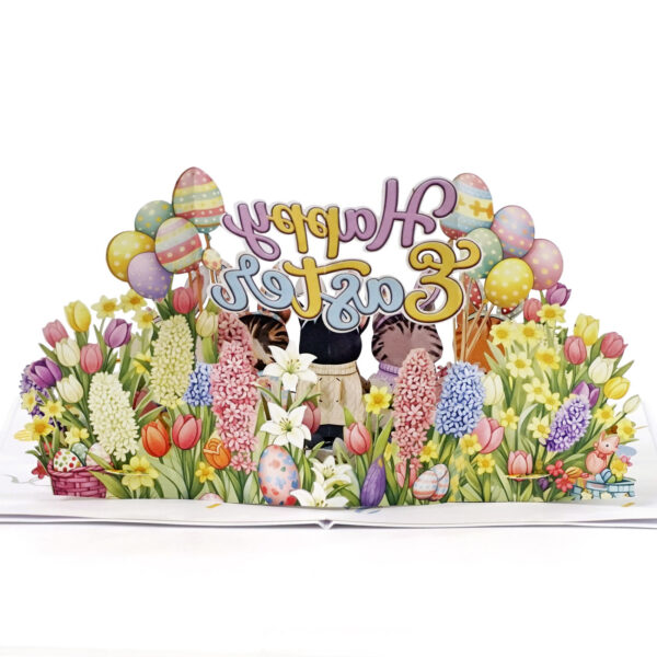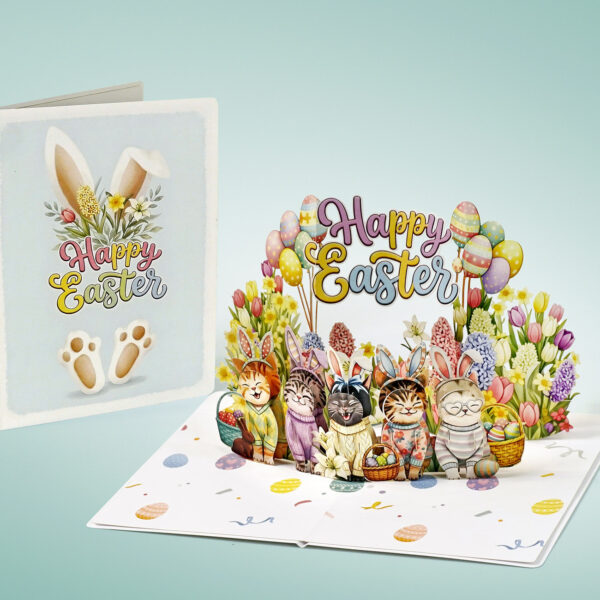Cute Happy Easter 3D Pop-Up Card with Bunnies, Eggs and Spring Flowers brings a joyful Easter scene filled with adorable bunnies, colorful eggs, and blooming spring flowers. At the center, a playful “Happy Easter” message rises in vibrant pastel tones, surrounded by cheerful decorations that capture the spirit of the season. The cute animal figures, dressed in cozy outfits and bunny ears, add a whimsical and heartwarming touch, while baskets of Easter eggs and bright floral details create a lively, festive atmosphere. Expertly crafted with intricate layers and vivid colors, this card offers a delightful surprise when opened, making it both a greeting and a decorative keepsake.