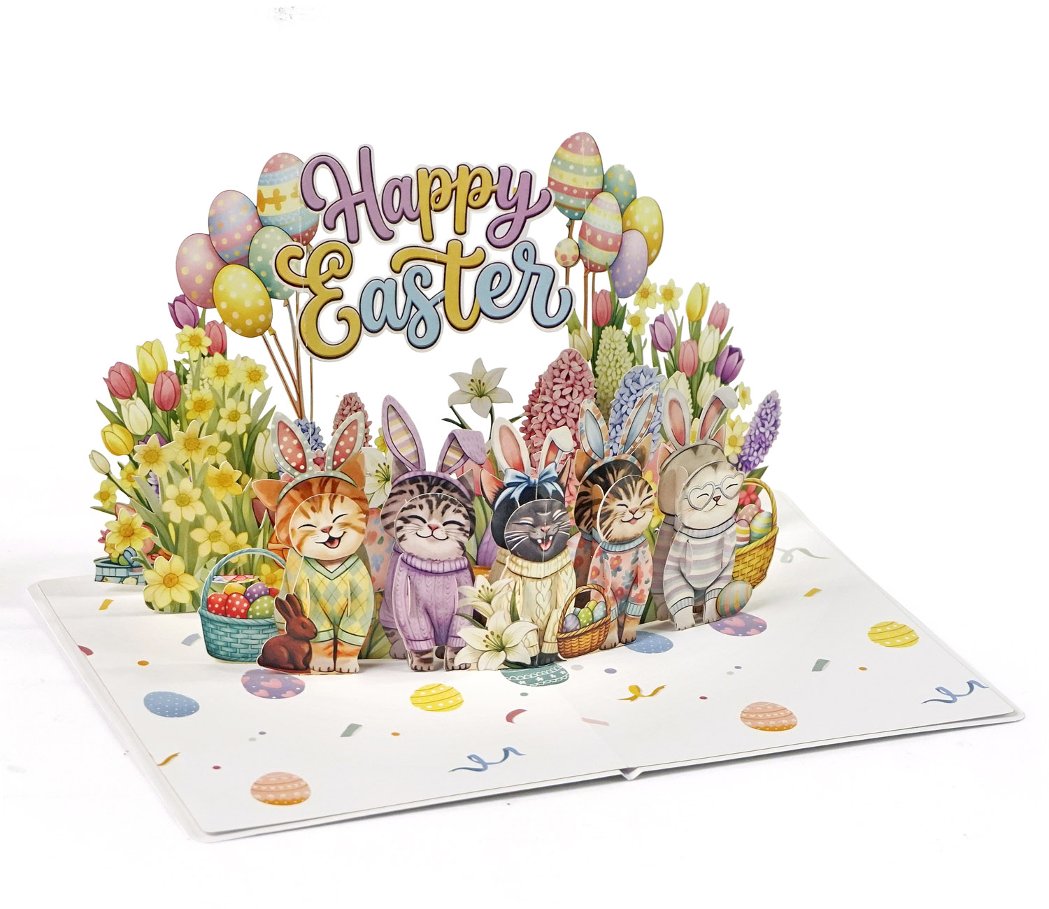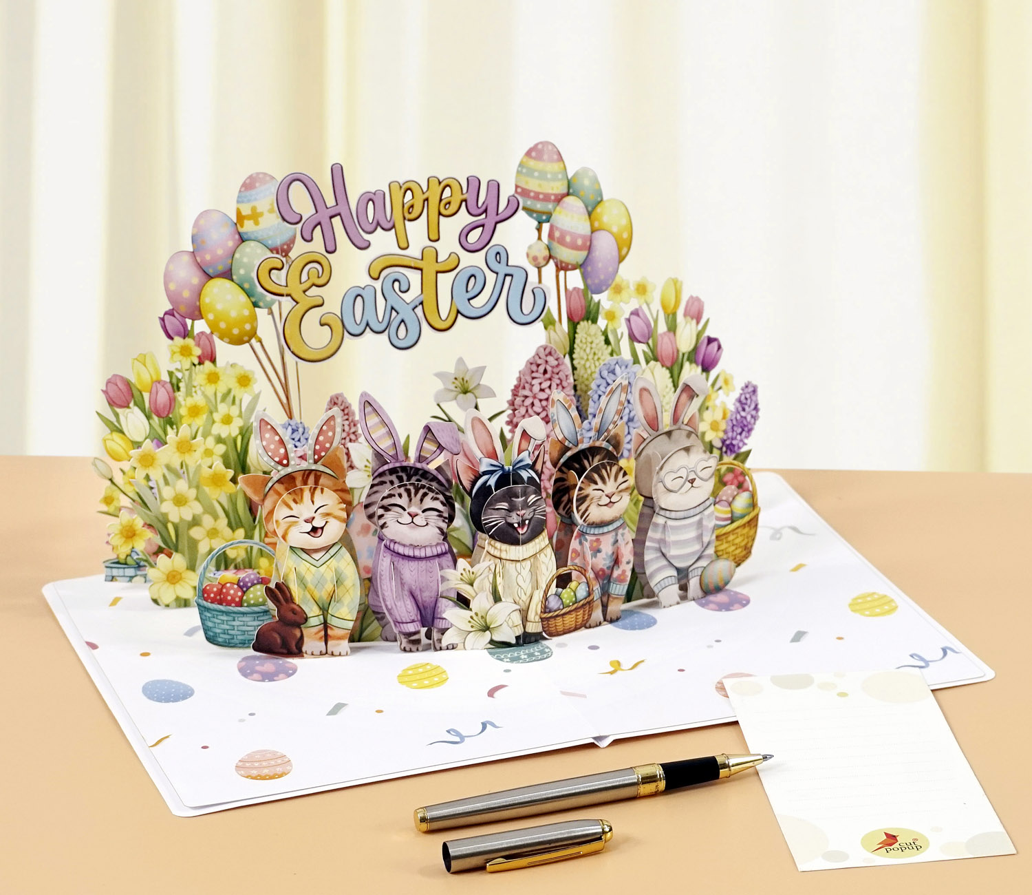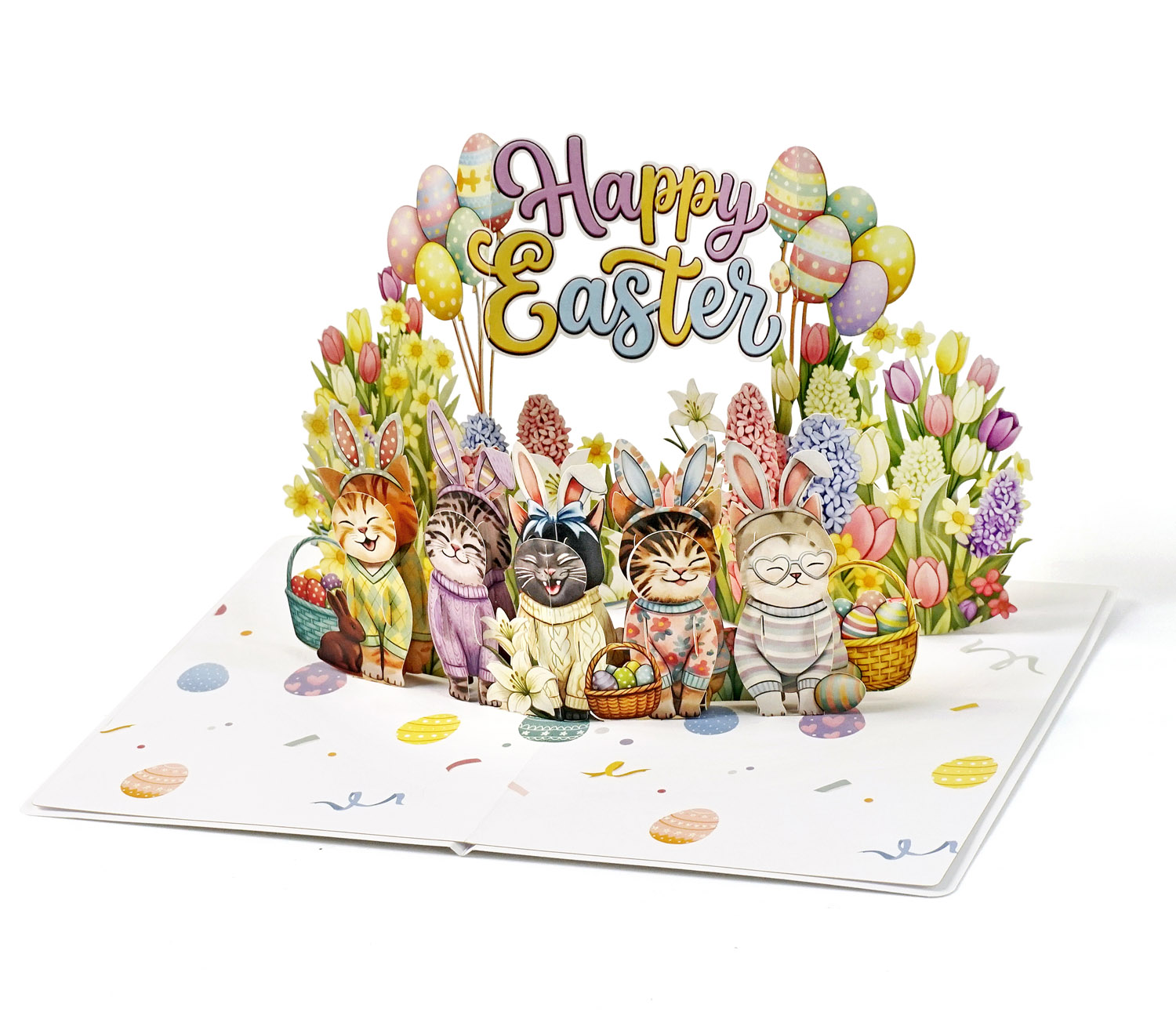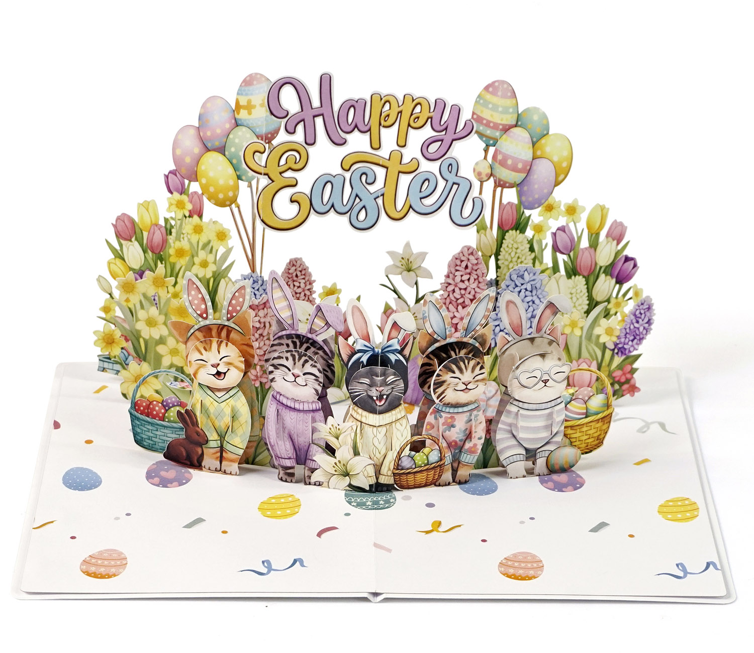 Cute Happy Easter 3D Pop-Up Card with Bunnies, Eggs and Spring Flowers brings a joyful Easter scene filled with adorable bunnies, colorful eggs, and blooming spring flowers. At the center, a playful “Happy Easter” message rises in vibrant pastel tones, surrounded by cheerful decorations that capture the spirit of the season. The cute animal figures, dressed in cozy outfits and bunny ears, add a whimsical and heartwarming touch, while baskets of Easter eggs and bright floral details create a lively, festive atmosphere. Expertly crafted with intricate layers and vivid colors, this card offers a delightful surprise when opened, making it both a greeting and a decorative keepsake.