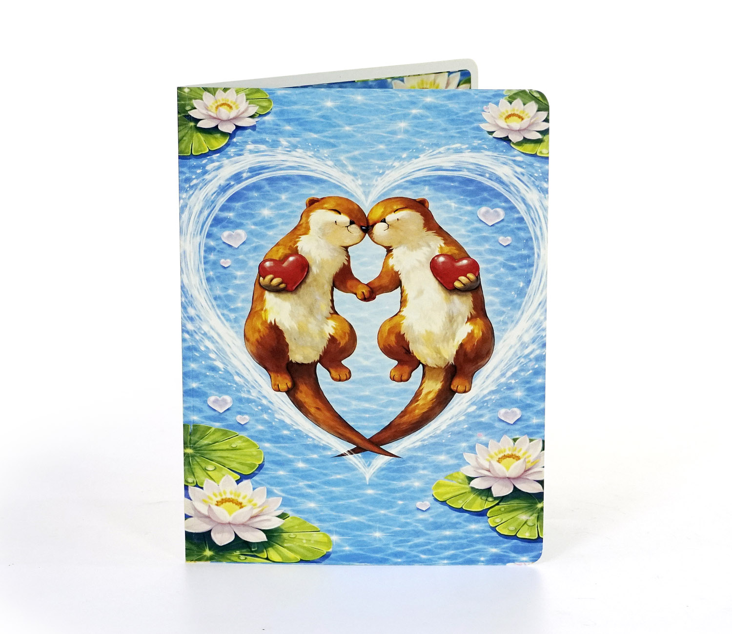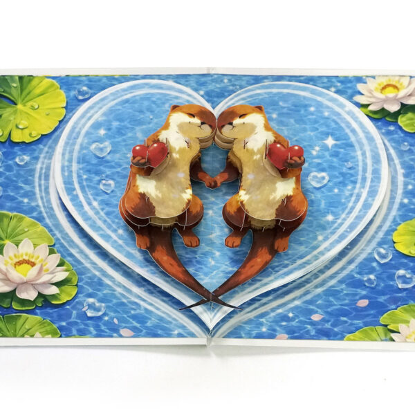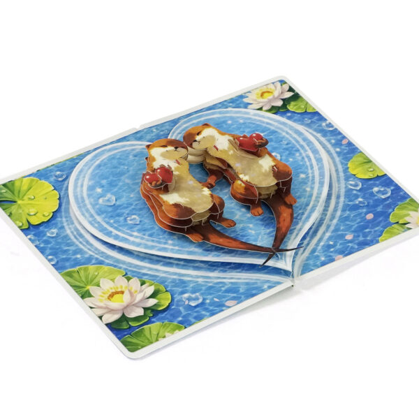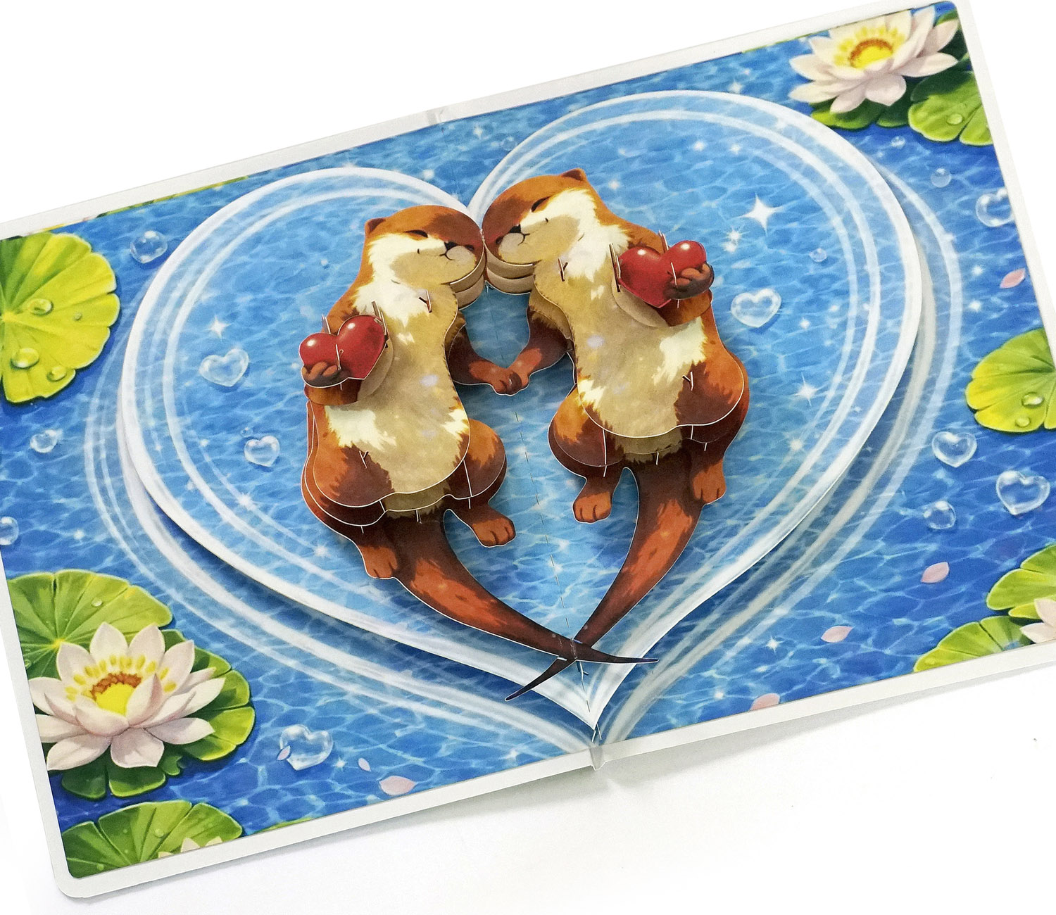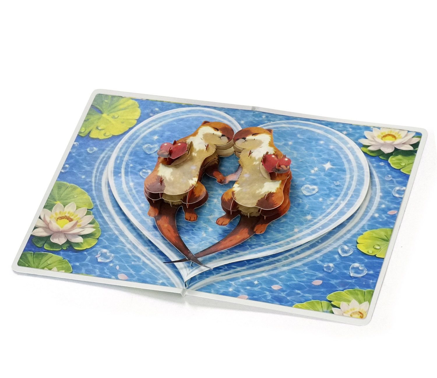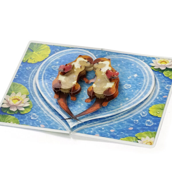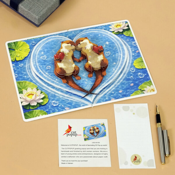 Carefully crafted with layered paper details, the otters appear to gently rise from the card when opened, creating a delightful surprise. The combination of vibrant colors, charming characters, and thoughtful composition makes this card not only a greeting but also a keepsake that captures a special moment of love.