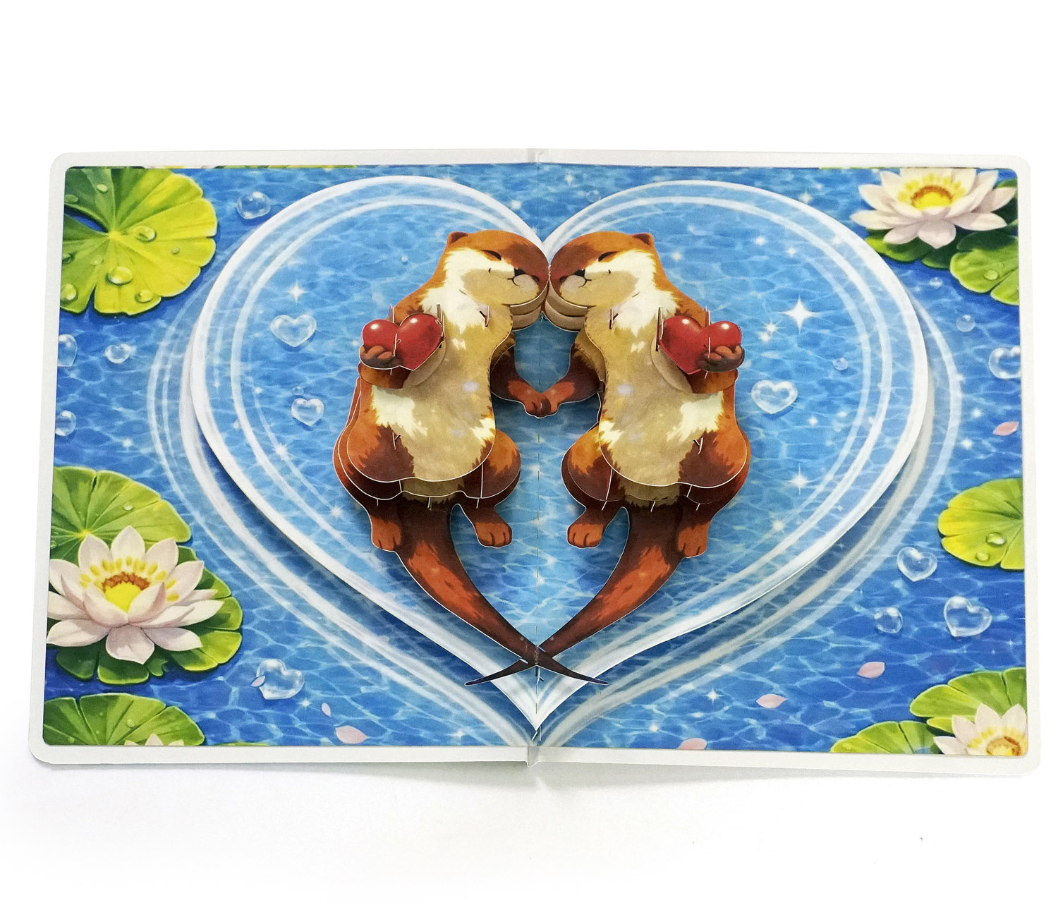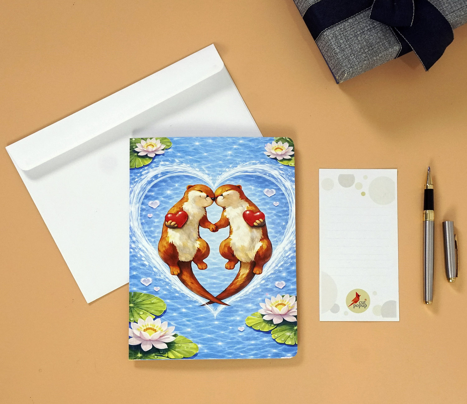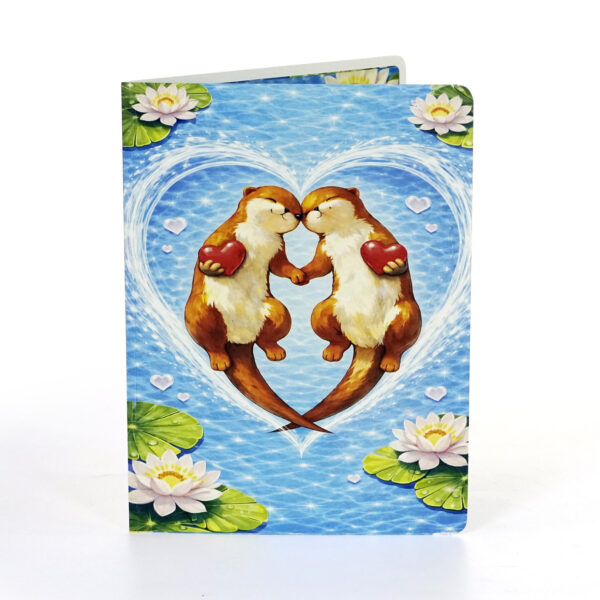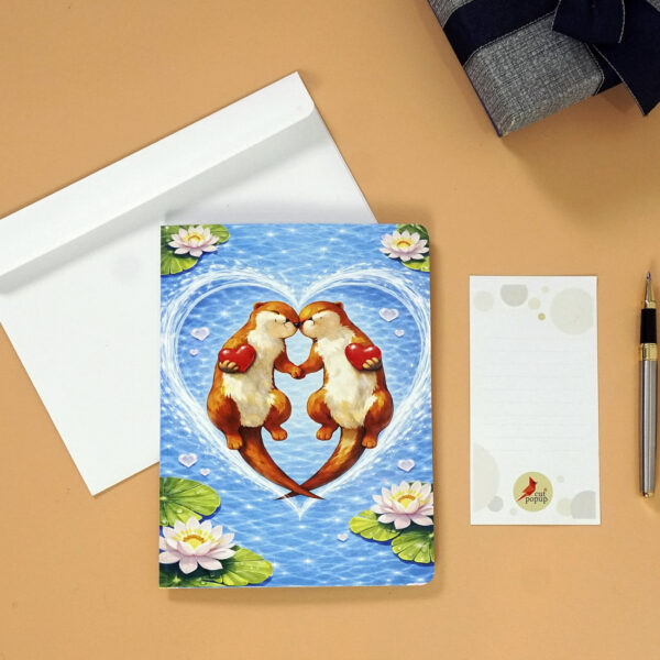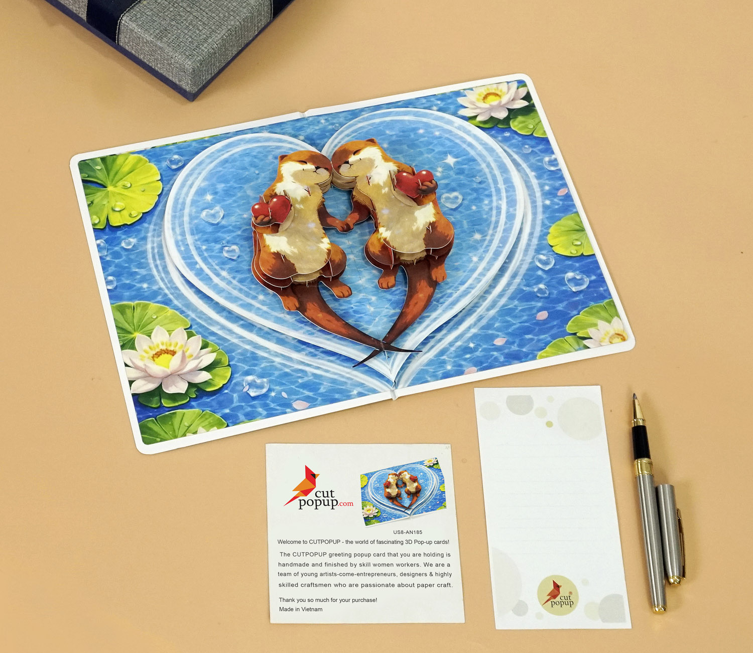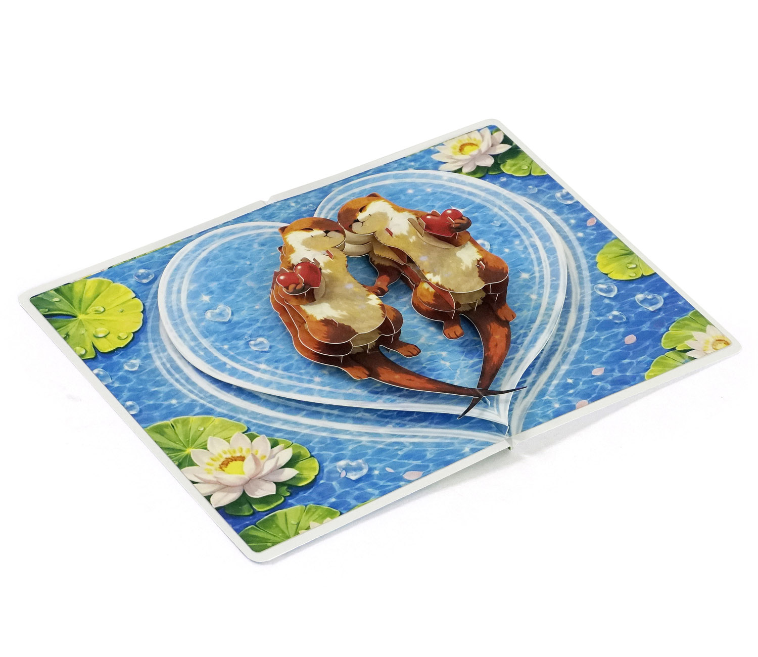 Carefully crafted with layered paper details, the otters appear to gently rise from the card when opened, creating a delightful surprise. The combination of vibrant colors, charming characters, and thoughtful composition makes this card not only a greeting but also a keepsake that captures a special moment of love.