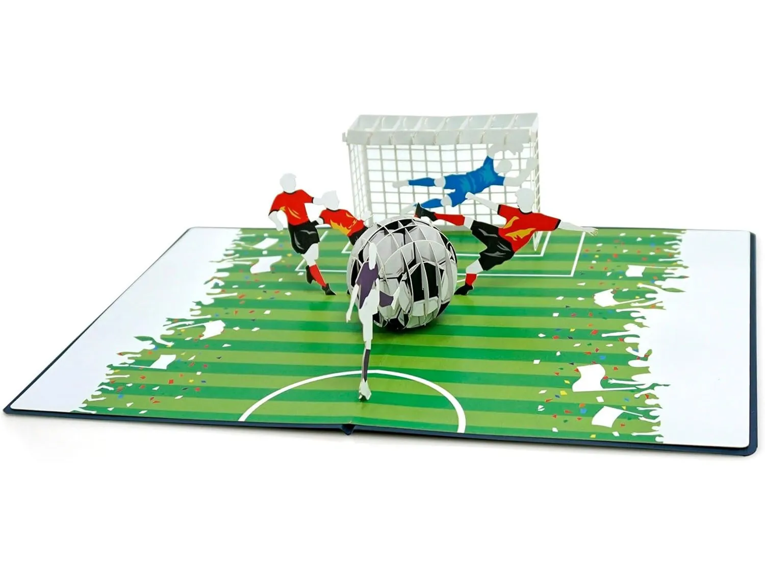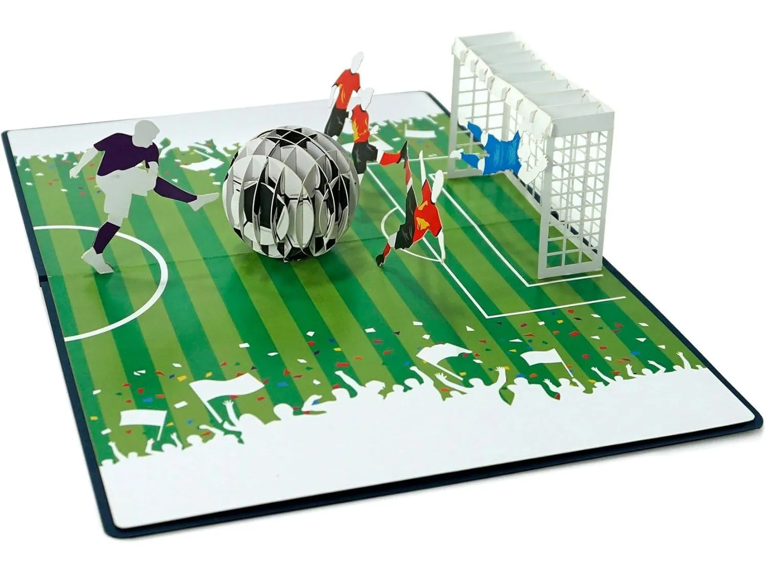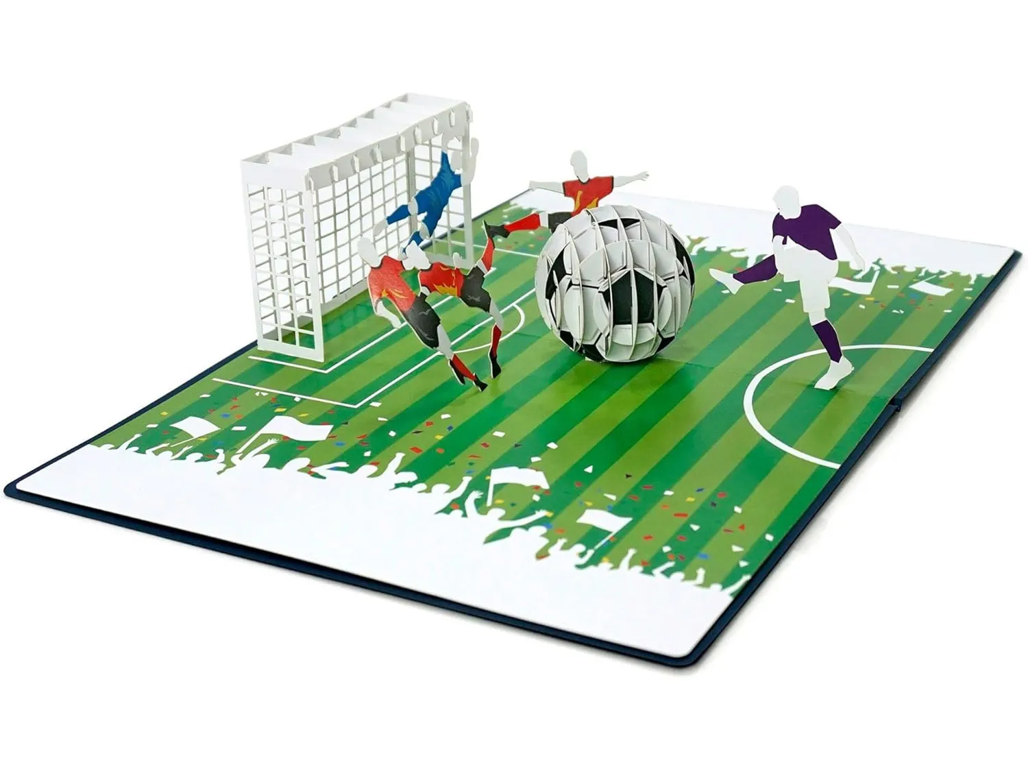 Football 3d Model Cut Popup For Him or Dad simulates a small soccer match with a large ball as the center image, a decorated field with a full goal, green grass, a striker preparing to kick the ball towards the goal and other players blocking the goal.