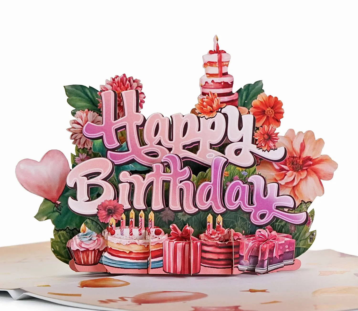 Happy Birthday 3D pop up to anniversary or invite card simulates the main focus is the large, playful text that reads “Happy Birthday” in shades of pink and purple. Surrounding the text are beautiful flowers in full bloom, heart-shaped balloons, and delicious birthday treats including cupcakes, layered cakes with lit candles, and neatly wrapped presents. The bright colors and festive details create a joyful and celebratory atmosphere, making this card a perfect choice to bring smiles and birthday cheer to someone special.