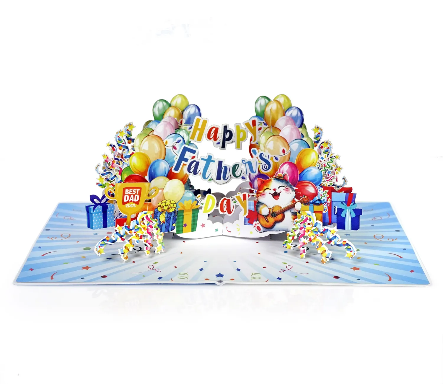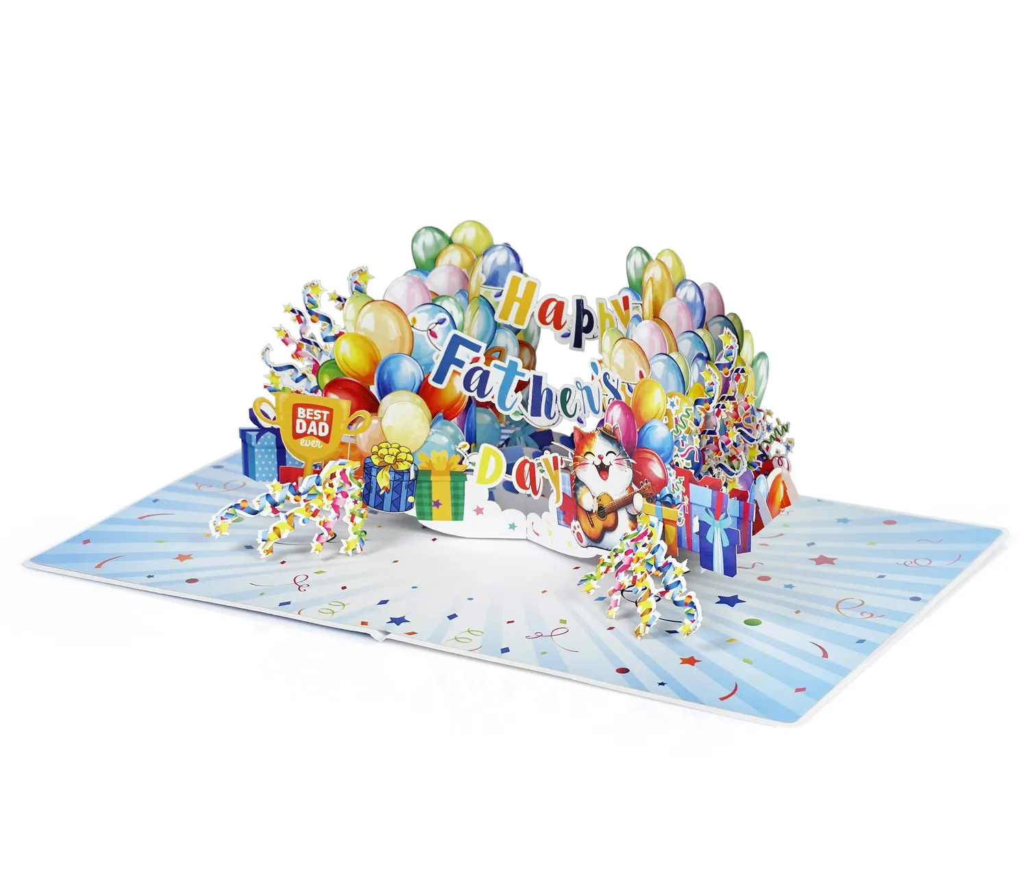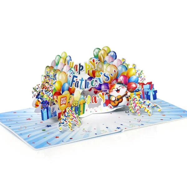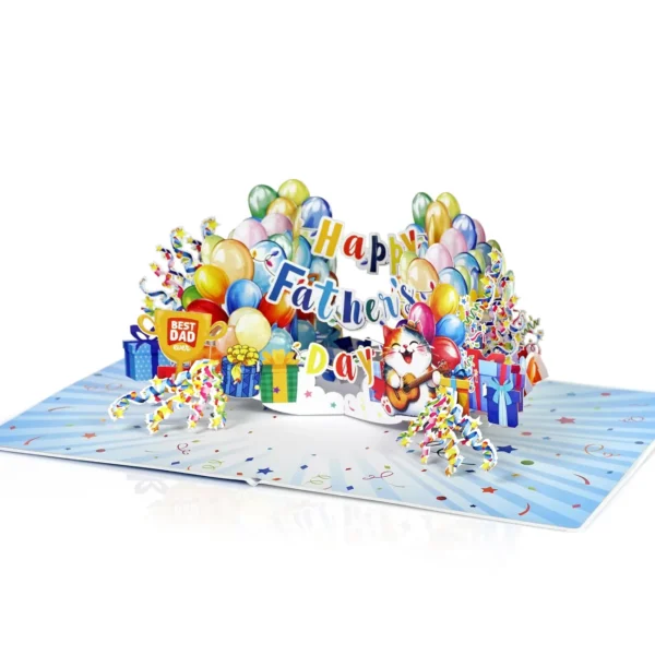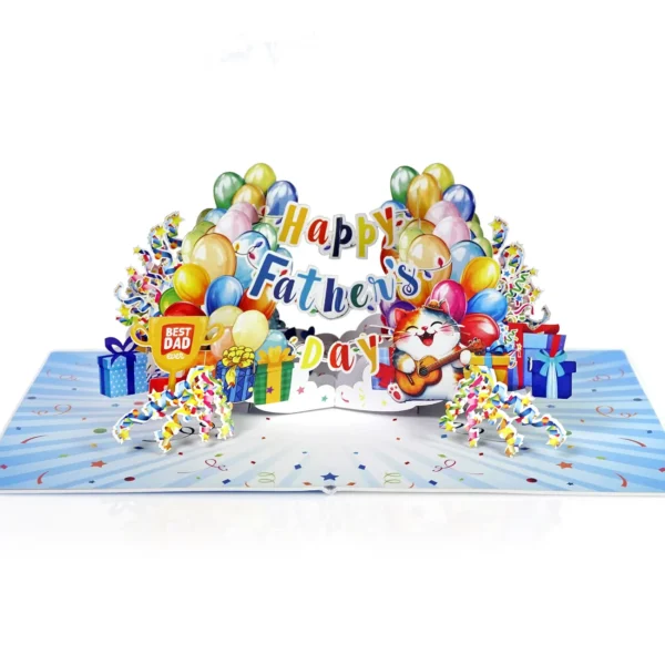 Happy Dather’s Day Banner Text 3D Pop up Cards simulates colorful display of balloons, gift boxes, and festive streamers. In the center, a joyful cat is playing a guitar while wearing a party hat, adding a playful and loving touch. Above the cat, the message “Happy Father’s Day” is spelled out in a mix of bright, multicolored letters. On the left side, a golden trophy with the words “Best Dad Ever” stands proudly among the decorations. The entire scene is set against a background filled with stars, confetti, and celebration-themed elements, creating a warm and festive atmosphere perfect for honoring dads.