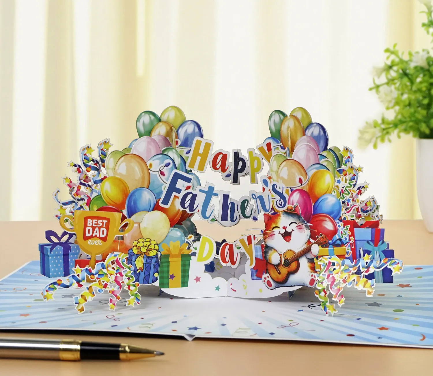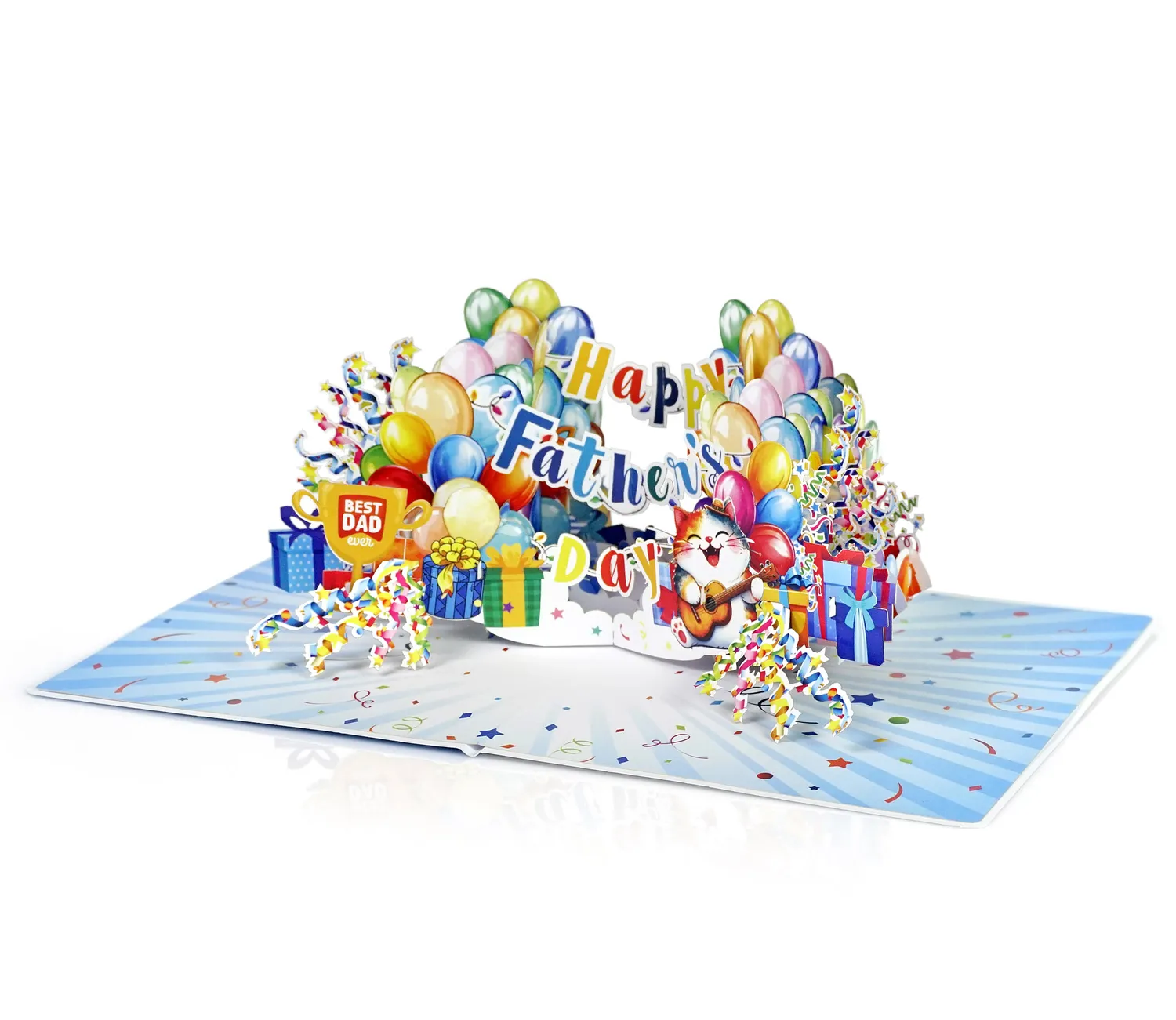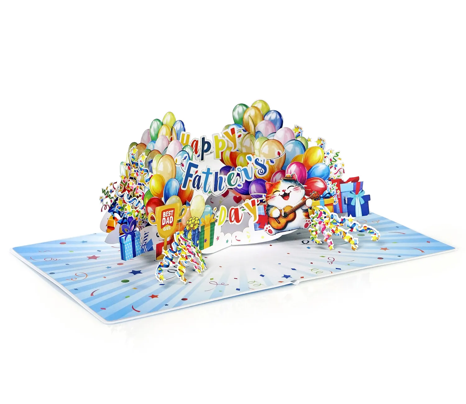 Happy Dather’s Day Banner Text 3D Pop up Cards simulates colorful display of balloons, gift boxes, and festive streamers. In the center, a joyful cat is playing a guitar while wearing a party hat, adding a playful and loving touch. Above the cat, the message “Happy Father’s Day” is spelled out in a mix of bright, multicolored letters. On the left side, a golden trophy with the words “Best Dad Ever” stands proudly among the decorations. The entire scene is set against a background filled with stars, confetti, and celebration-themed elements, creating a warm and festive atmosphere perfect for honoring dads.