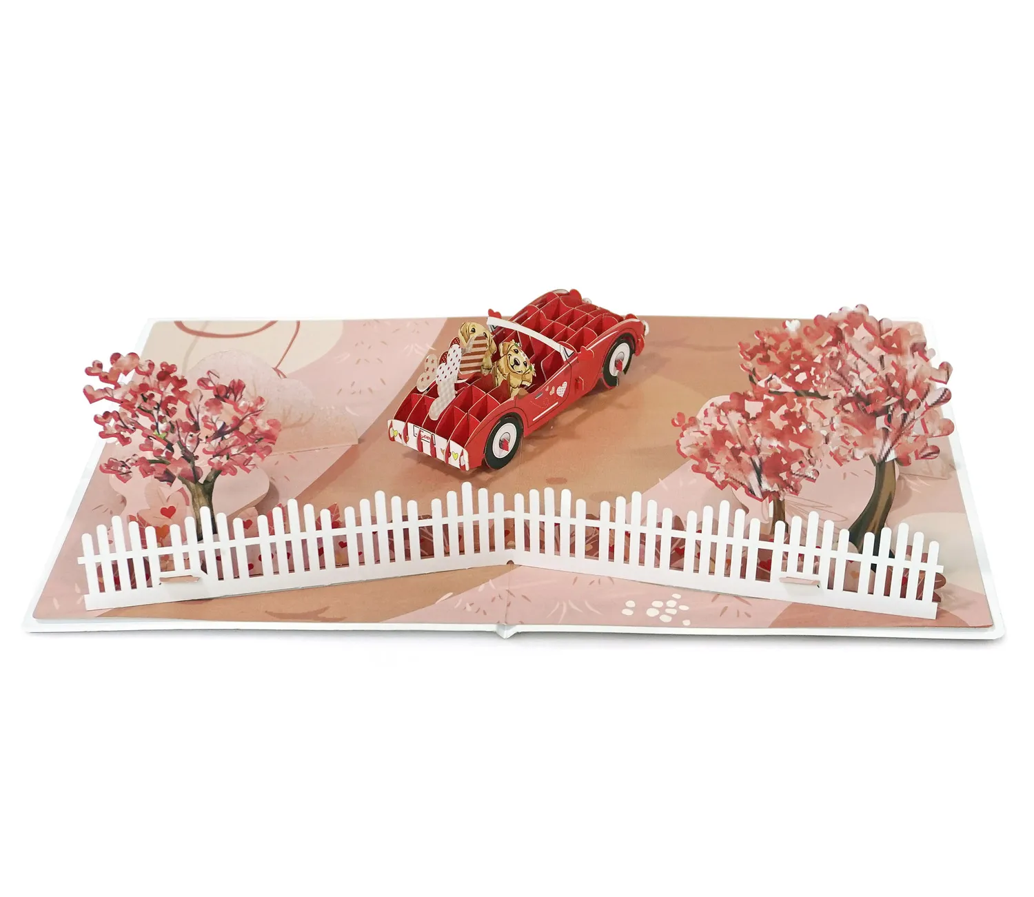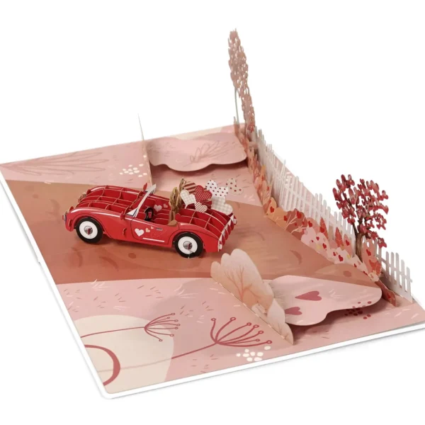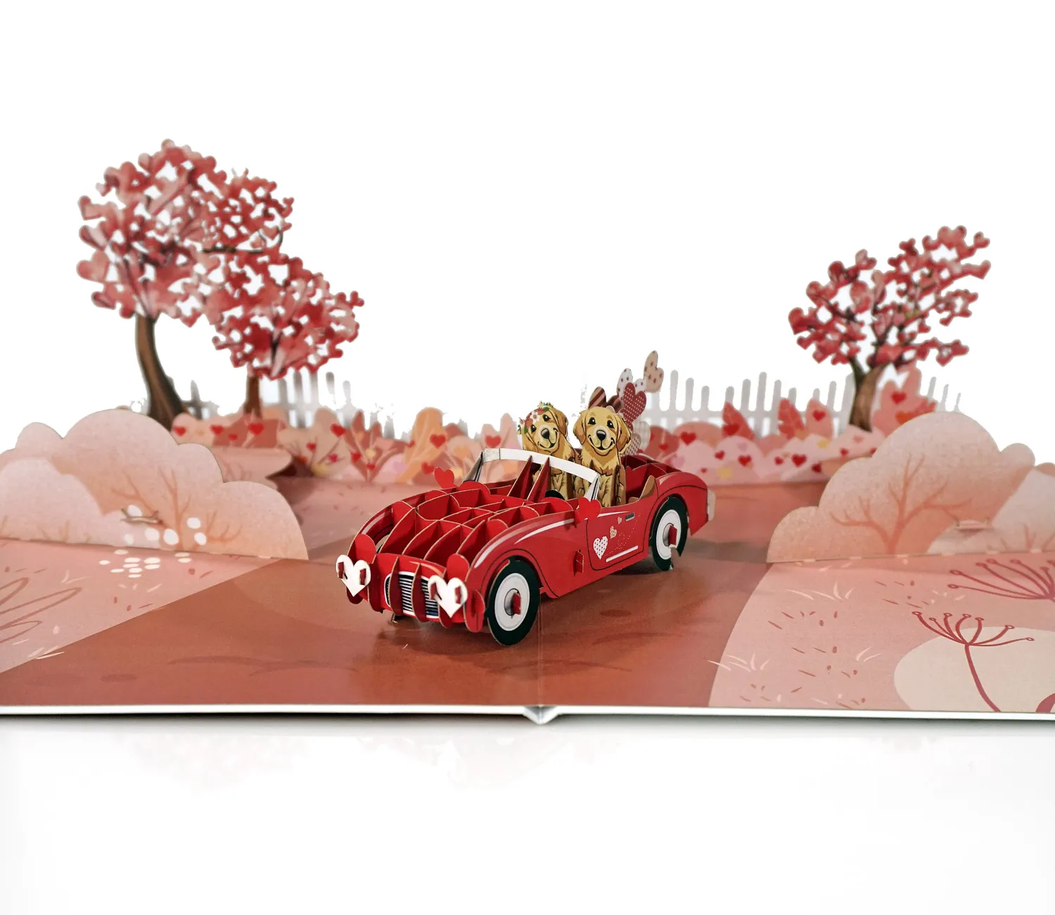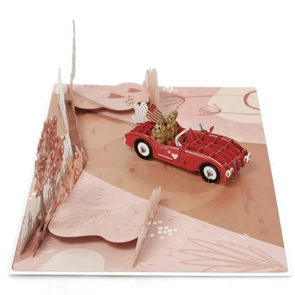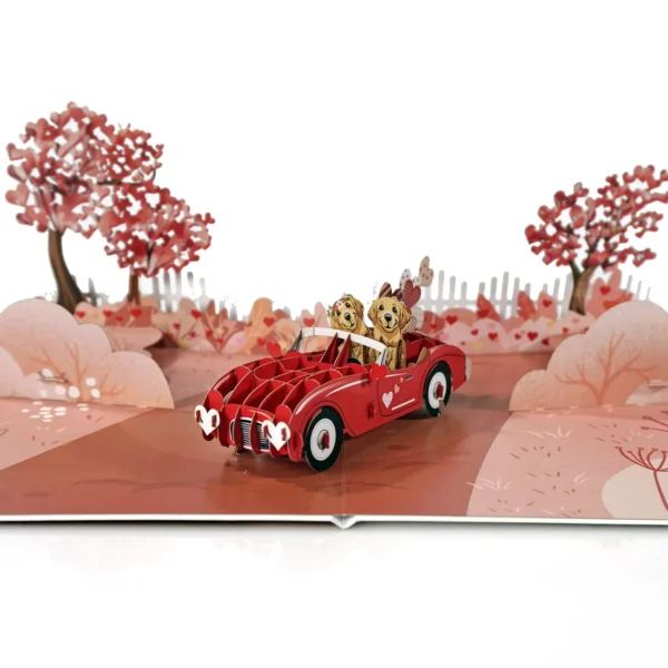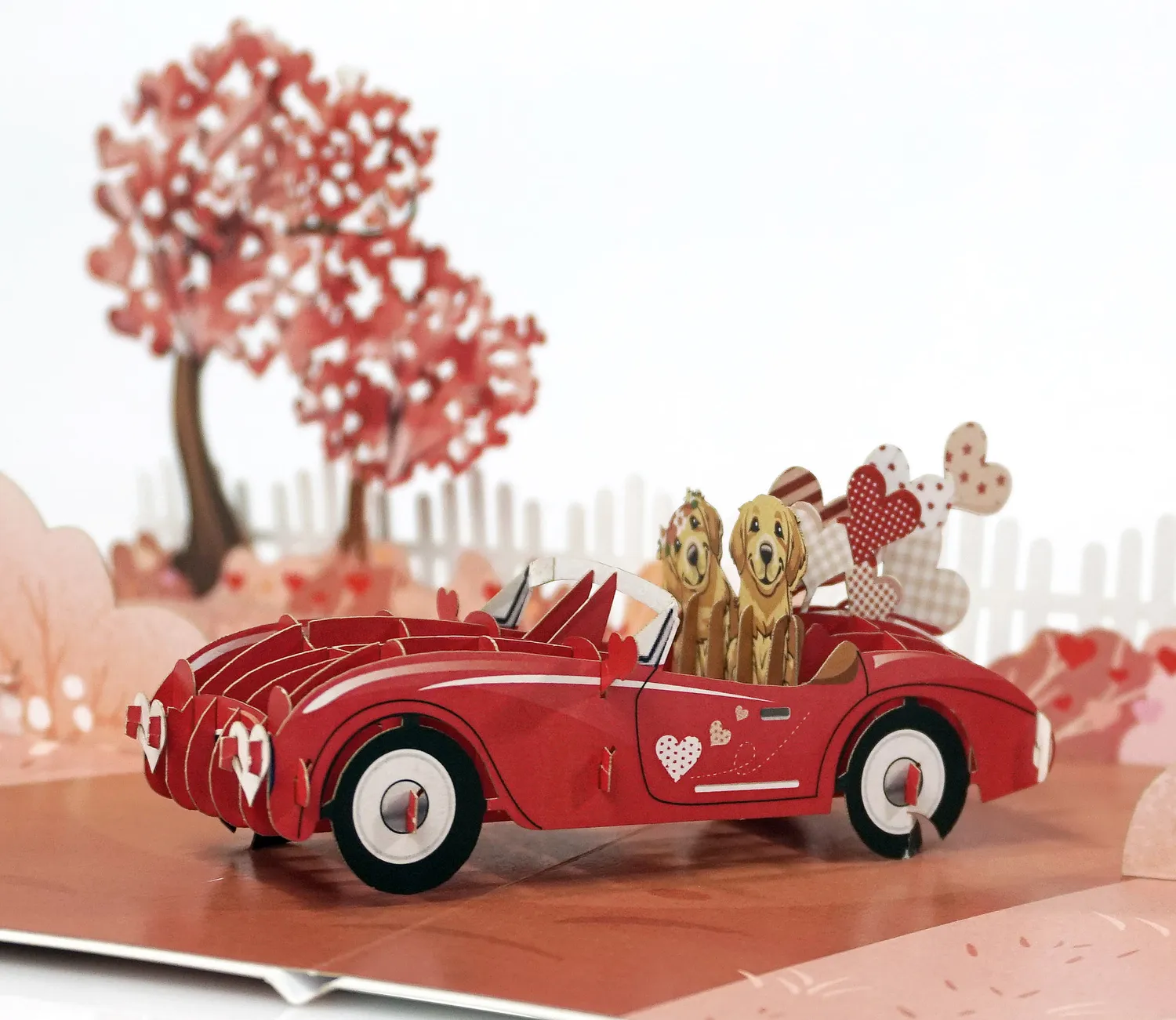 Happy Valentine Anniversary 3D popup greeting cards simulates a playful and romantic scene, the center is a red convertible car adorned with heart-shaped decorations, symbolizing love and celebration. Inside the car, two cheerful golden retrievers are seated, adding a sense of joy and companionship. The backdrop includes a romantic setting with a pink tree and a white picket fence, creating a warm, idyllic atmosphere. Balloons in the shape of hearts are tied to the car, enhancing the festive and romantic mood. This design is perfect for Valentine’s Day, anniversaries, or any occasion celebrating love and happiness.
