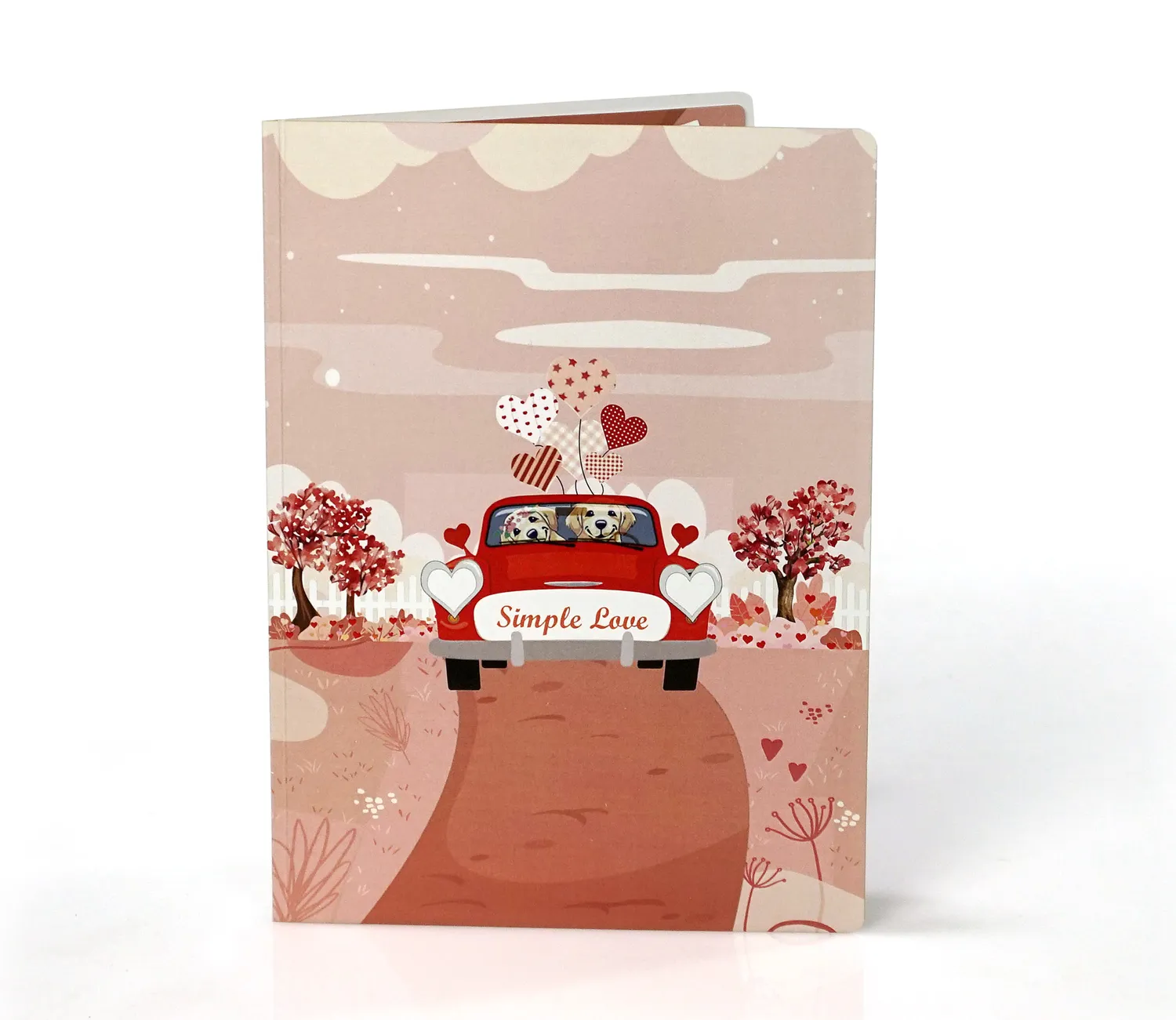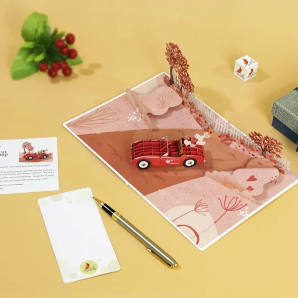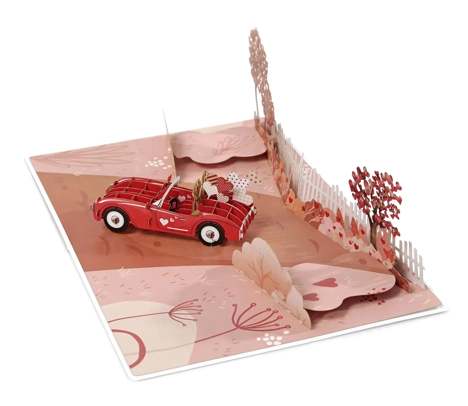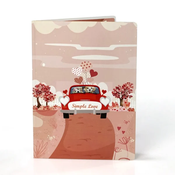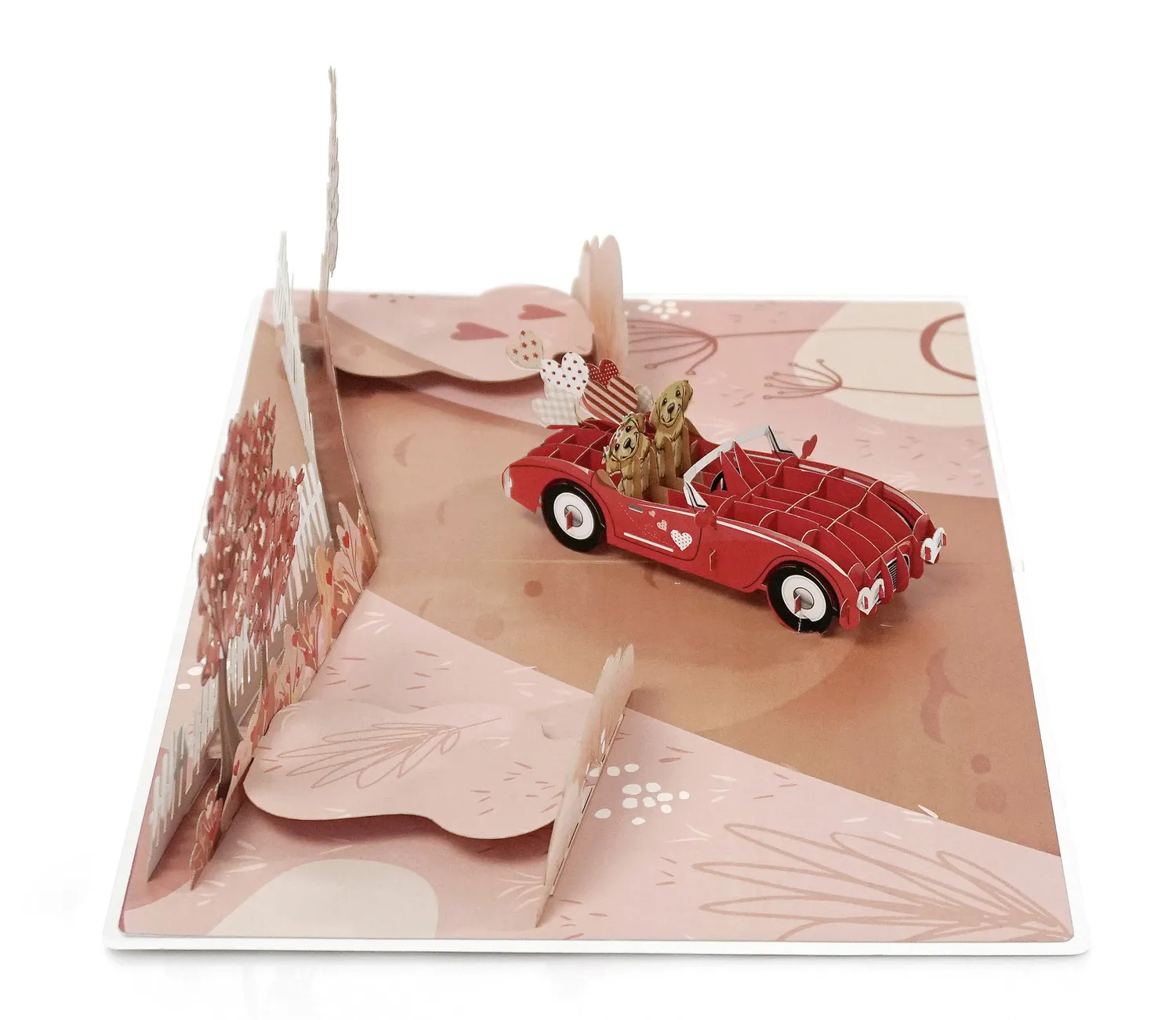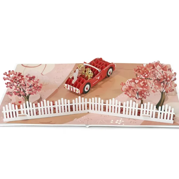 Happy Valentine Anniversary 3D popup greeting cards simulates a playful and romantic scene, the center is a red convertible car adorned with heart-shaped decorations, symbolizing love and celebration. Inside the car, two cheerful golden retrievers are seated, adding a sense of joy and companionship. The backdrop includes a romantic setting with a pink tree and a white picket fence, creating a warm, idyllic atmosphere. Balloons in the shape of hearts are tied to the car, enhancing the festive and romantic mood. This design is perfect for Valentine’s Day, anniversaries, or any occasion celebrating love and happiness.