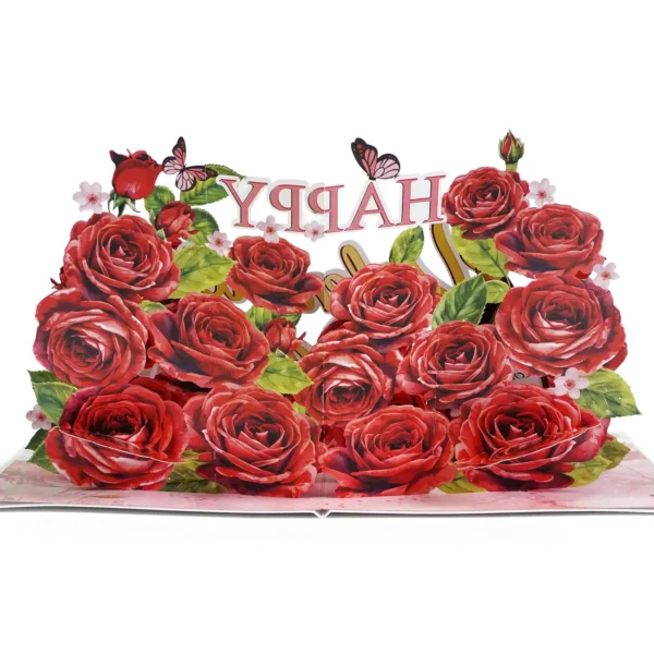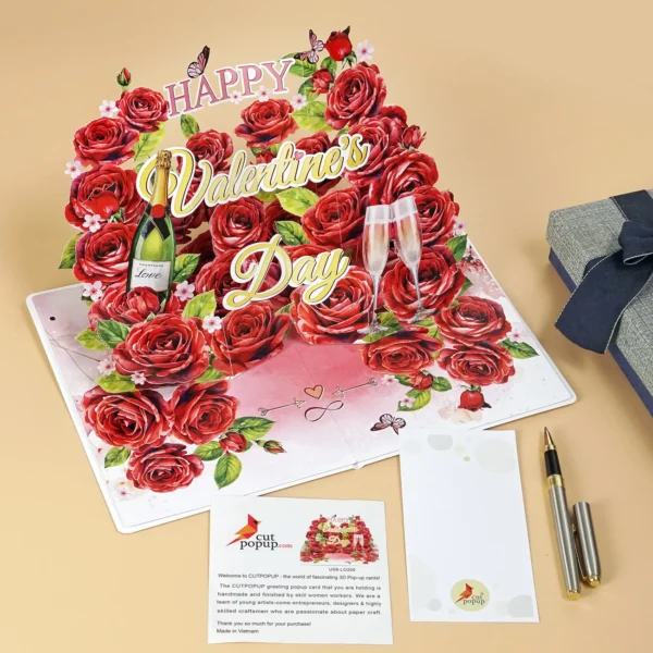 When opening Happy Valentine’s Day 3D Pop-up Cards Gift, a brilliant garden of love suddenly appears, bringing both surprise and passion. The first thing that catches everyone’s eye is the fiery red color of the velvet roses. They are not simply paper petals, but are created with amazing meticulousness. Each petal is soft, smooth like velvet, layered on top of each other to create depth and fullness. Interspersed between the rose branches are lush green leaves, dotted with a bit of natural accent, creating a vivid picture of nature.