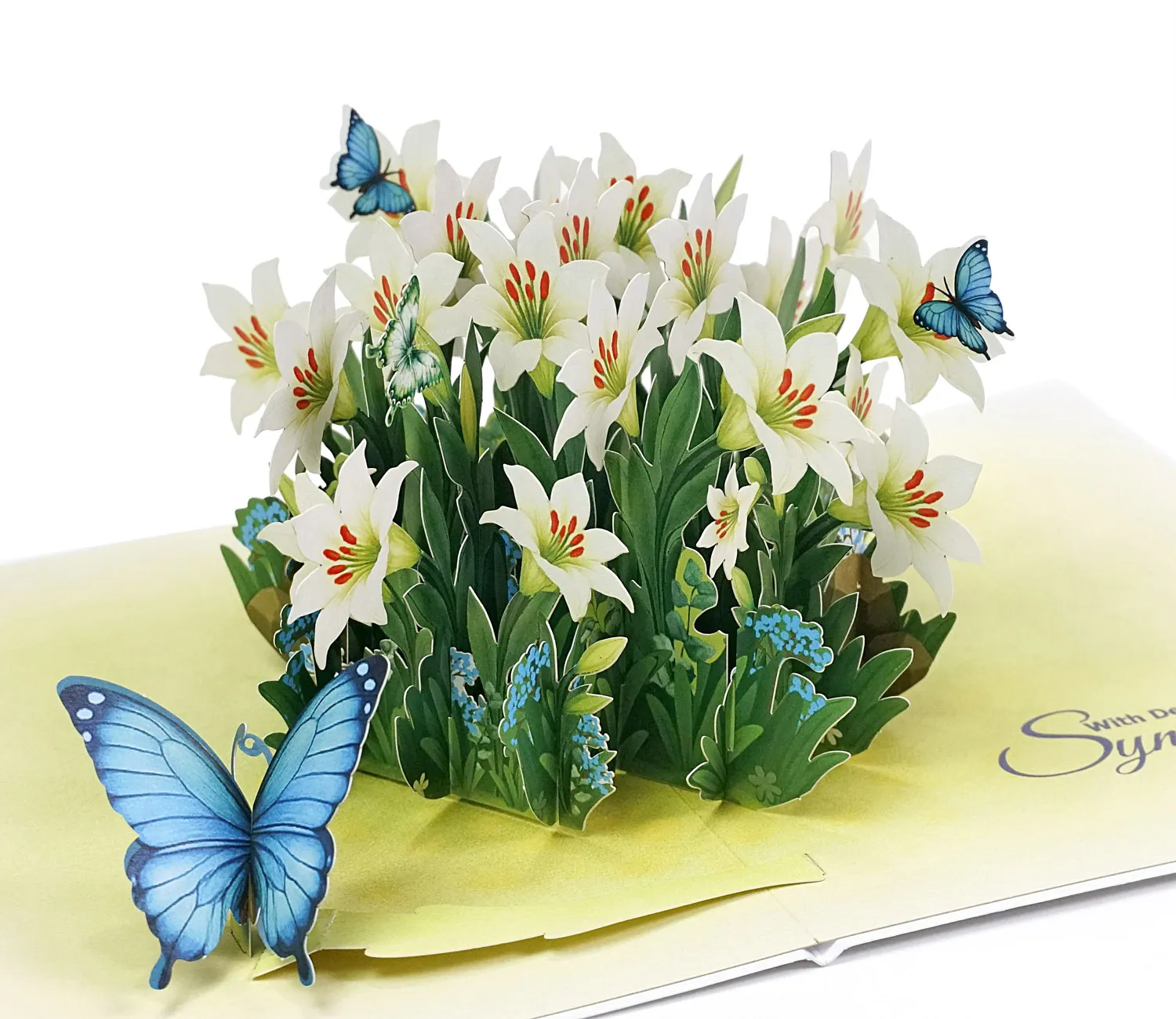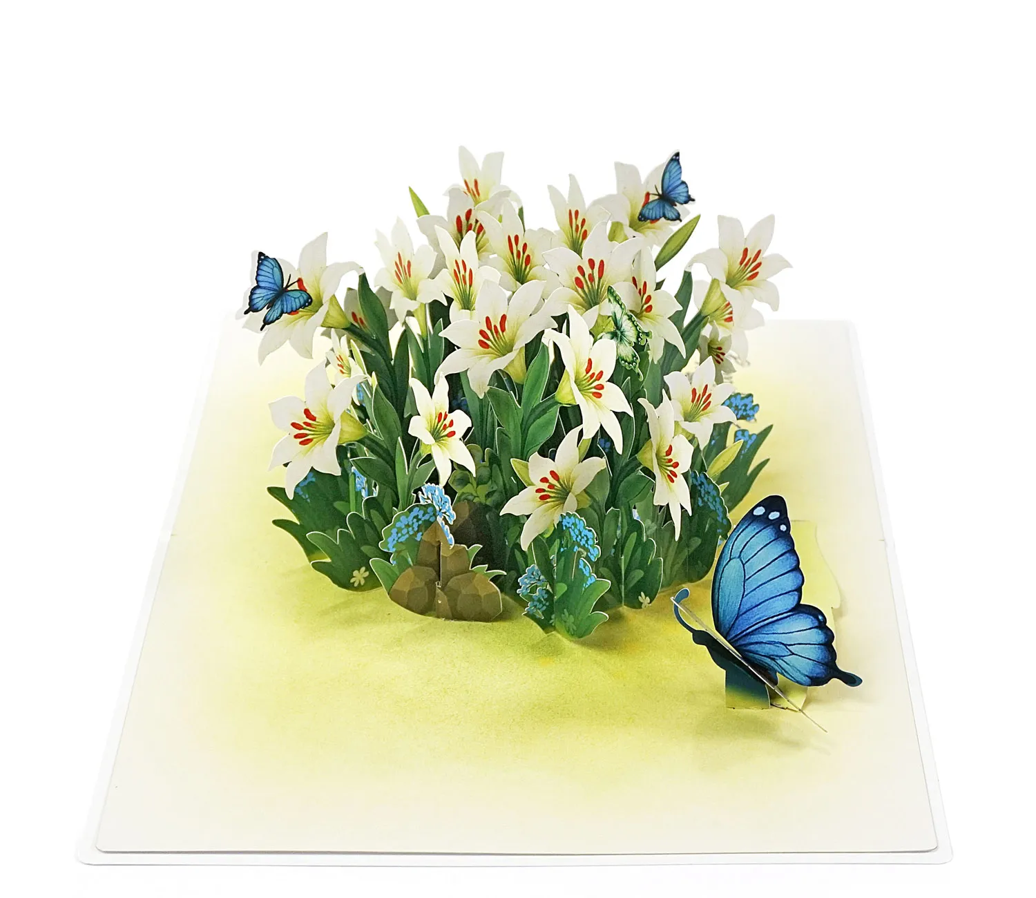 Lily Flower 3D Model Paper Craft displays a beautiful 3D pop-up card featuring a lush arrangement of white lilies and several blue butterflies. The lilies are intricately cut and layered, creating a vibrant, three-dimensional bouquet with green leaves and small blue filler flowers, popping up from a light yellow base. The overall effect is striking and celebratory.
