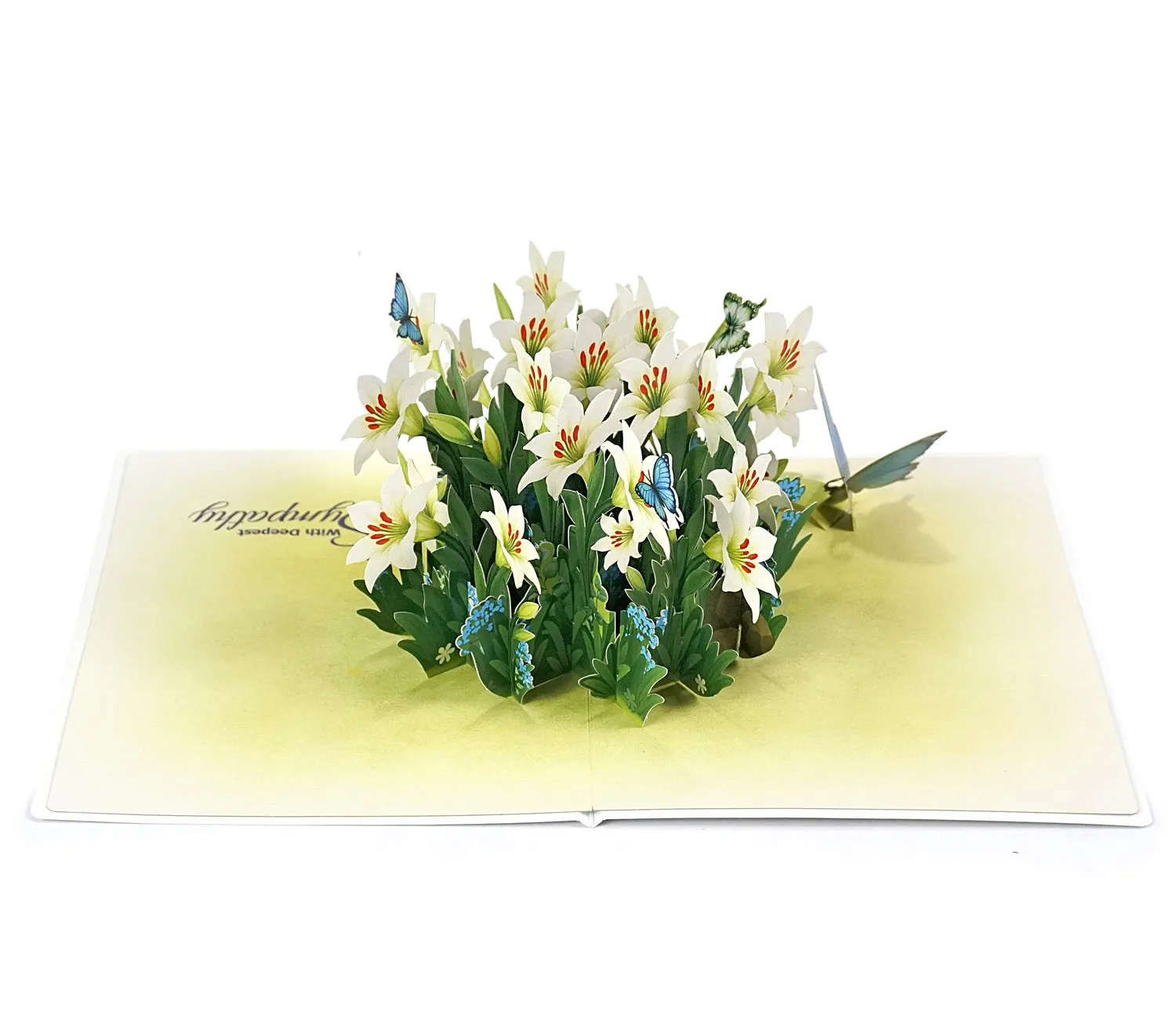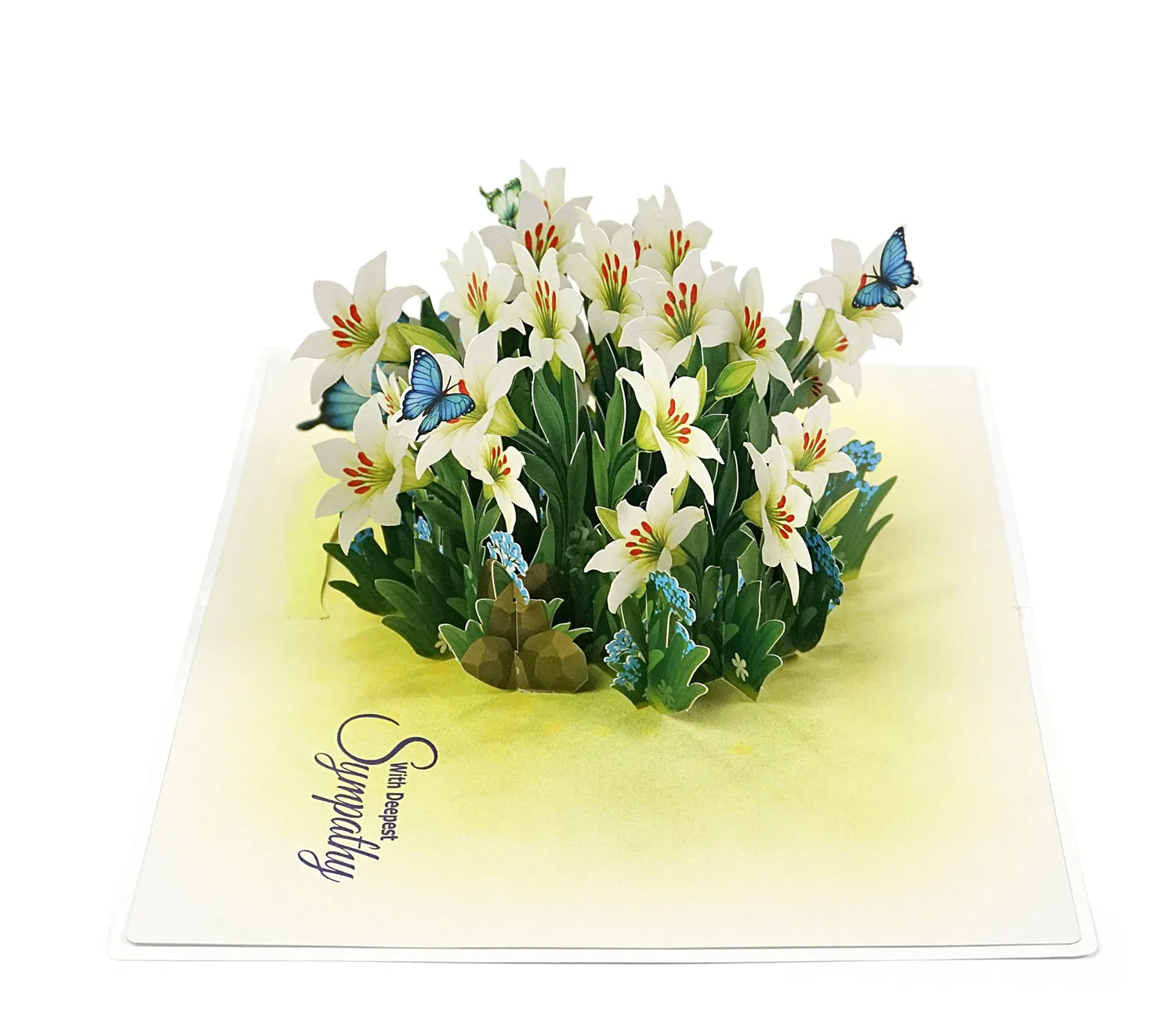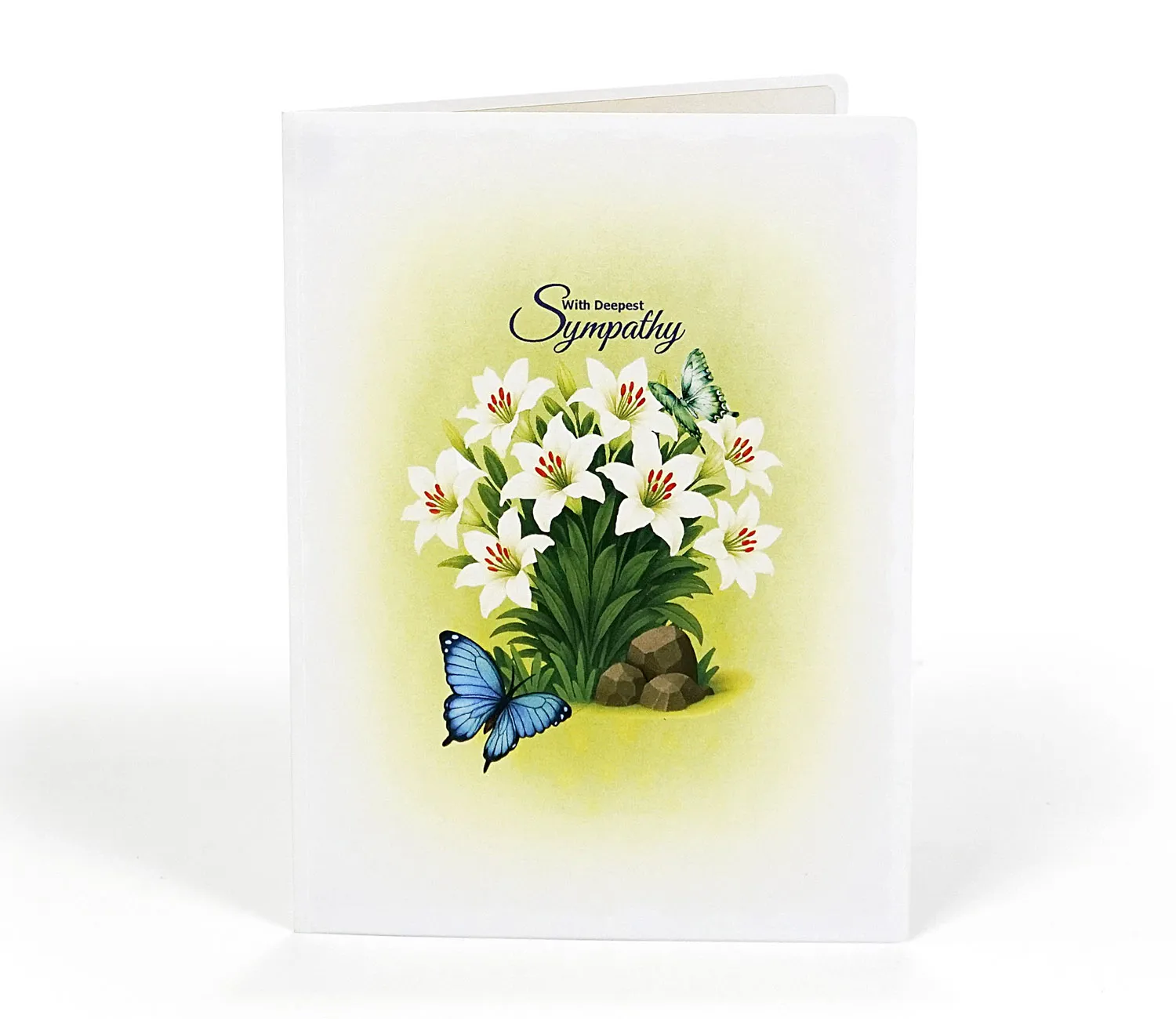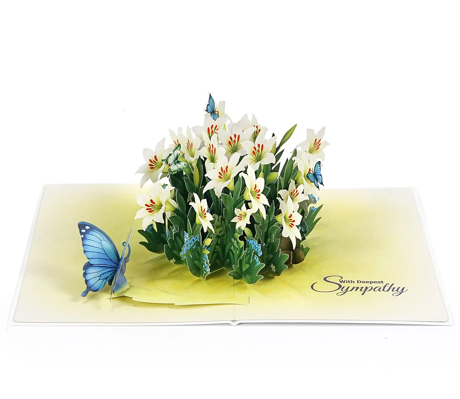 The symbolism of this card is rich and meaningful. White lilies traditionally represent purity, sympathy, majesty, and renewal or rebirth, making the card suitable for various occasions like a celebration of a new beginning, an anniversary, or even to offer heartfelt condolences. The addition of the blue butterflies further enhances the meaning, as they are strong symbols of transformation, hope, spiritual awakening, and good fortune.
