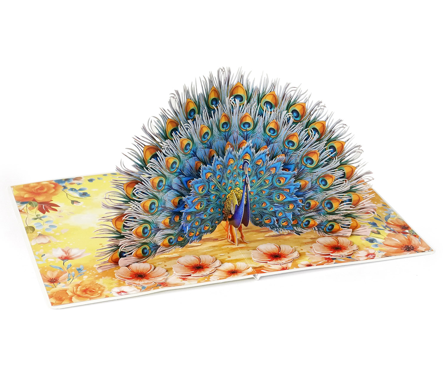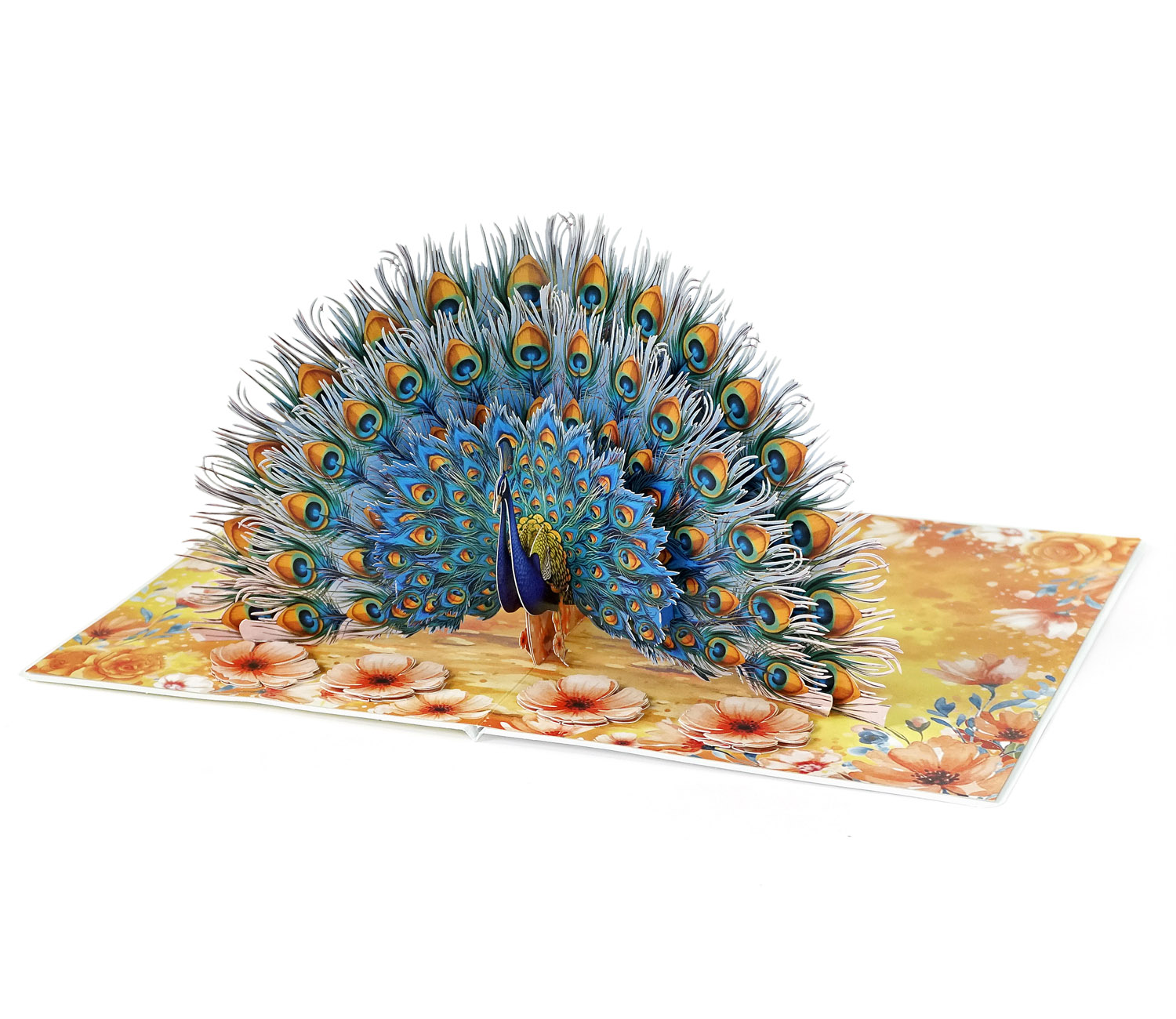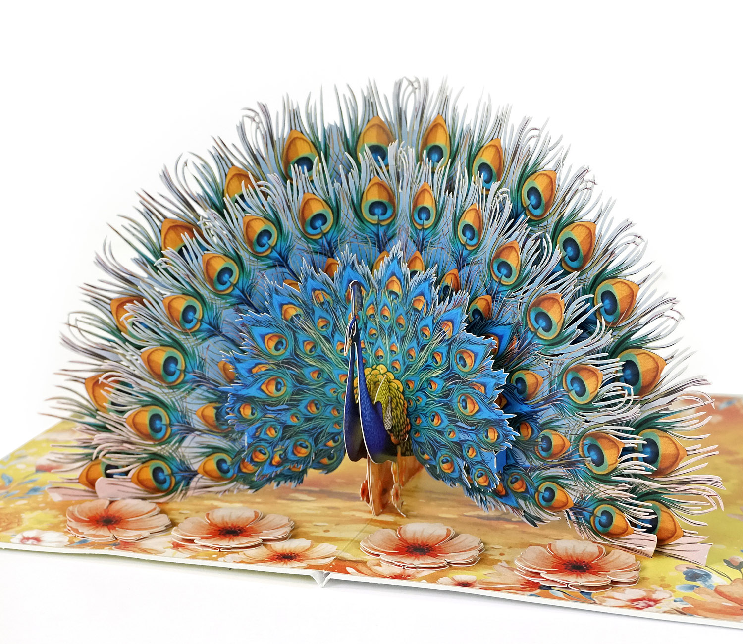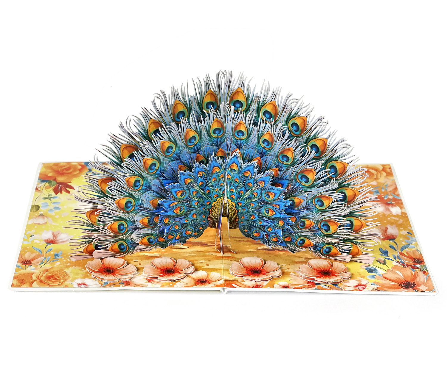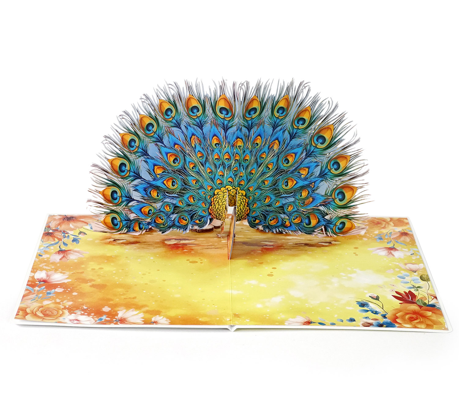 The Luxury Peacock 3D Pop-Up Greeting Card is at its most magnificent moment when it fully spreads its tail. As the card opens, an intricate fan of feathers rises gracefully, revealing dozens of delicately laser-cut “eye” patterns. The vibrant gradient of turquoise, deep blue, and golden orange creates a sense of depth and realism, making the peacock appear almost alive. The floral-printed base adds a soft, elegant contrast, enhancing the overall luxurious and artistic feel of the design.