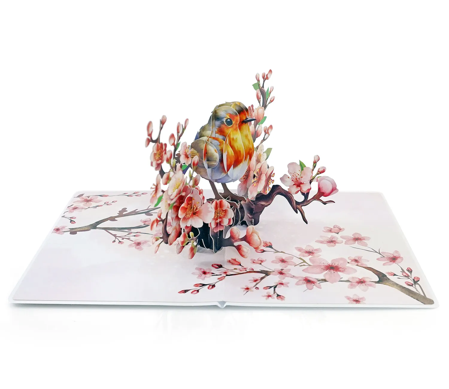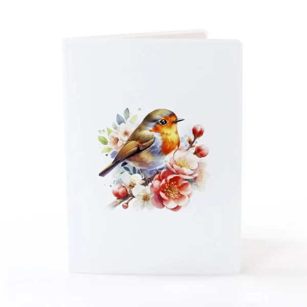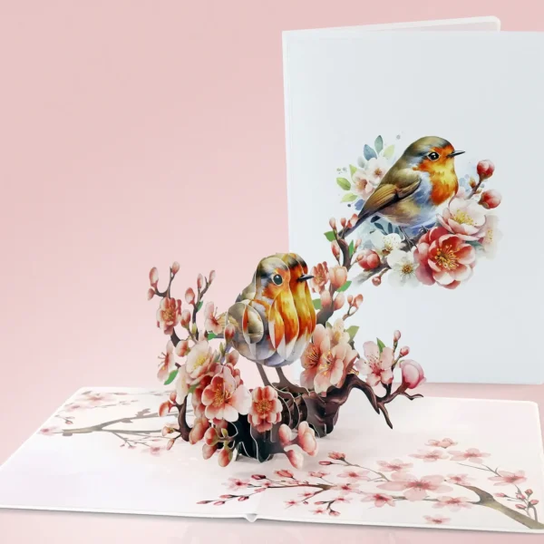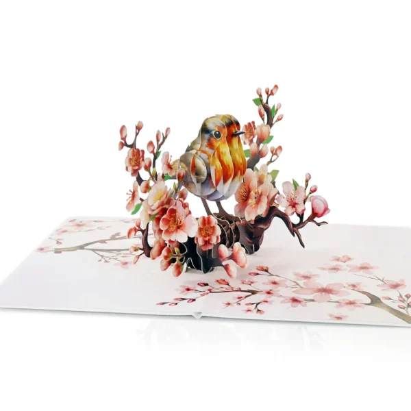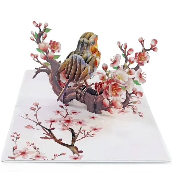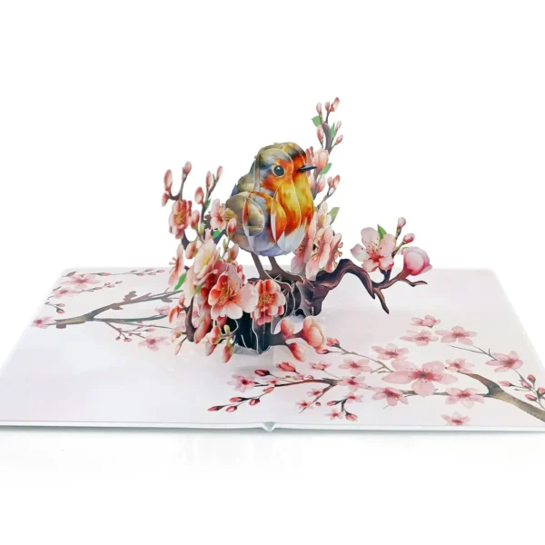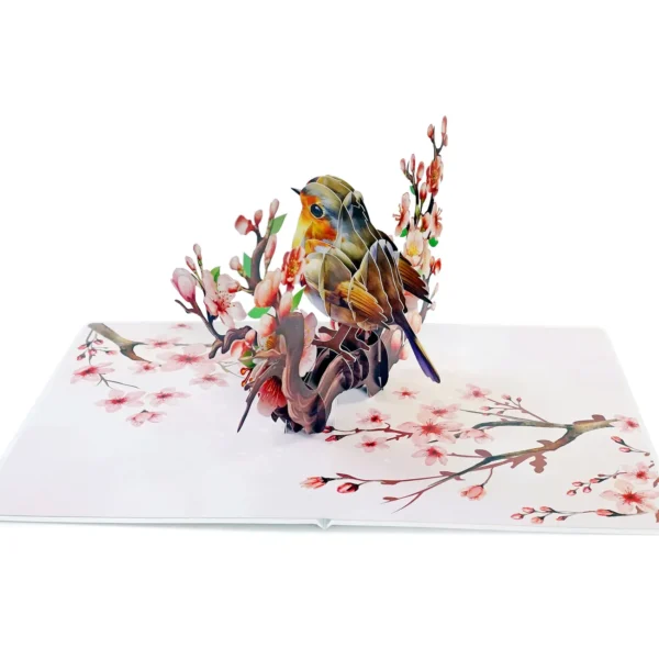 A Robin Birthday Greeting 3D Card Pop Up showcases a delicate and elegant greeting card featuring a 3D design of a bird perched on a blossoming branch. The bird, with its warm tones of brown, orange, and white, appears lifelike, sitting among beautiful cherry blossoms.