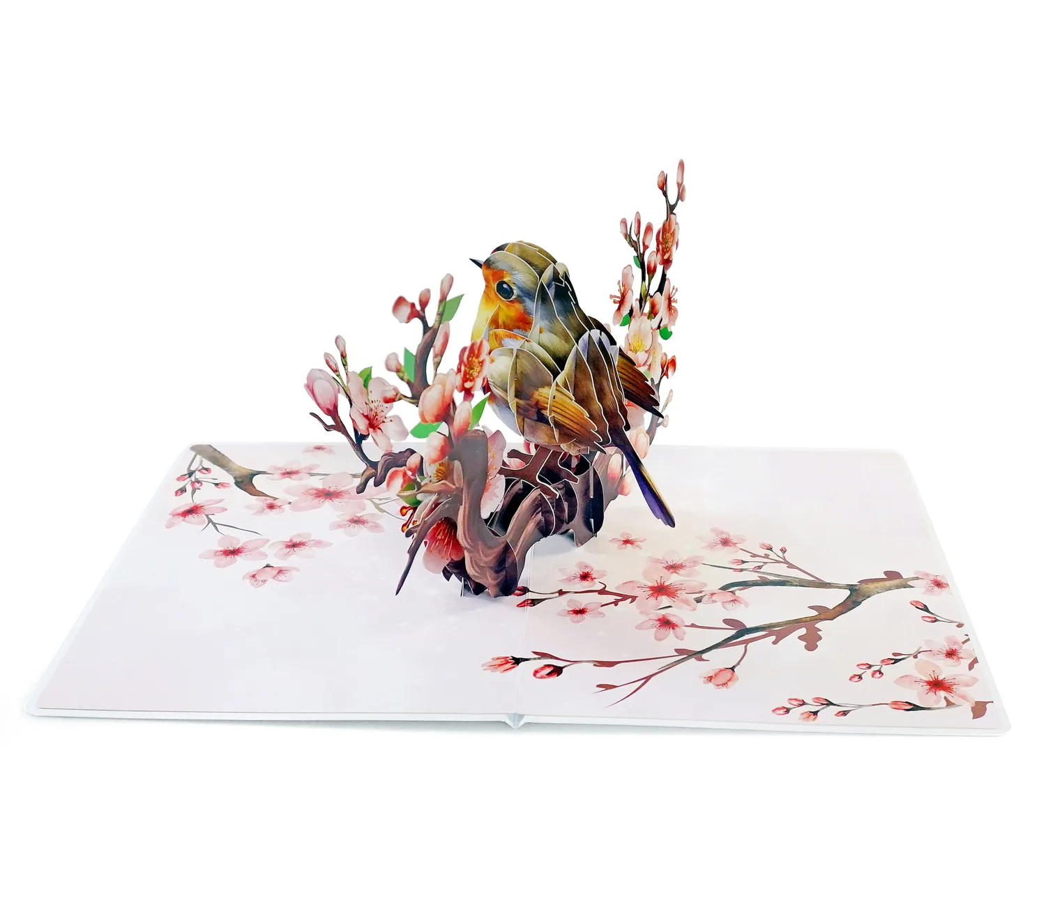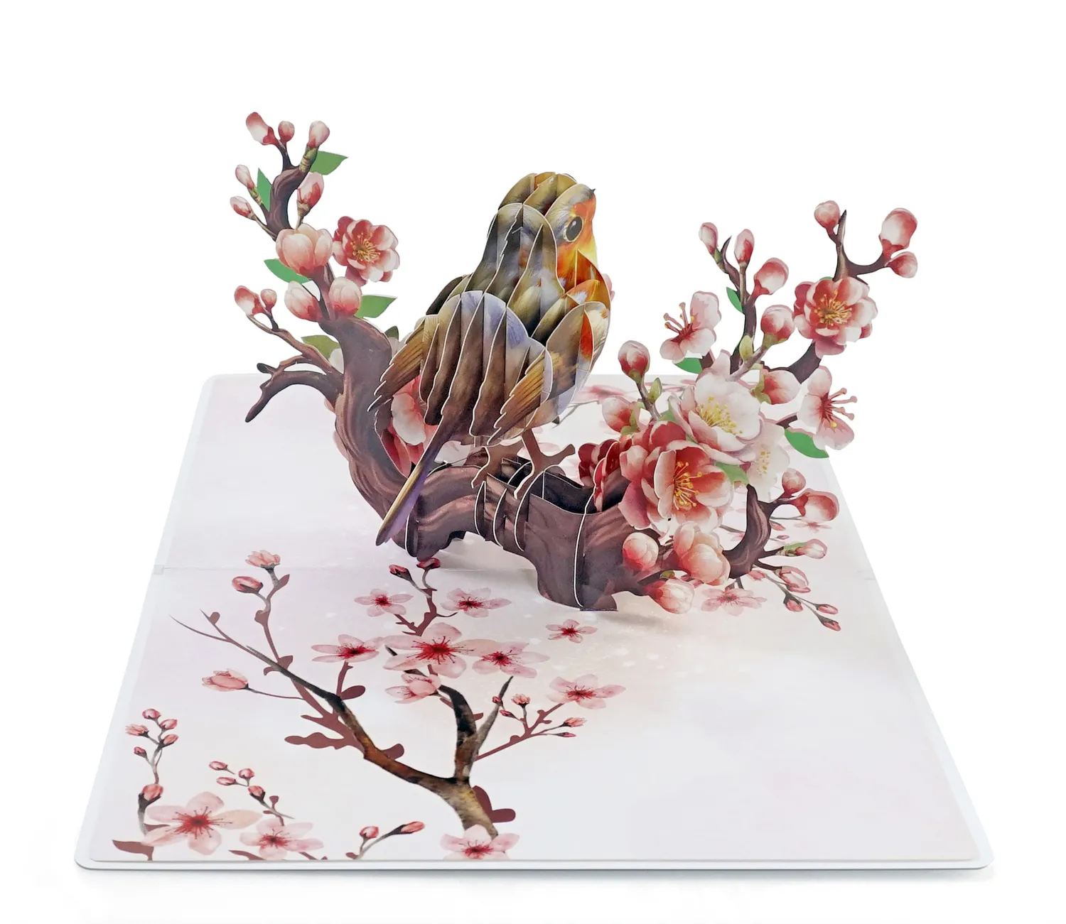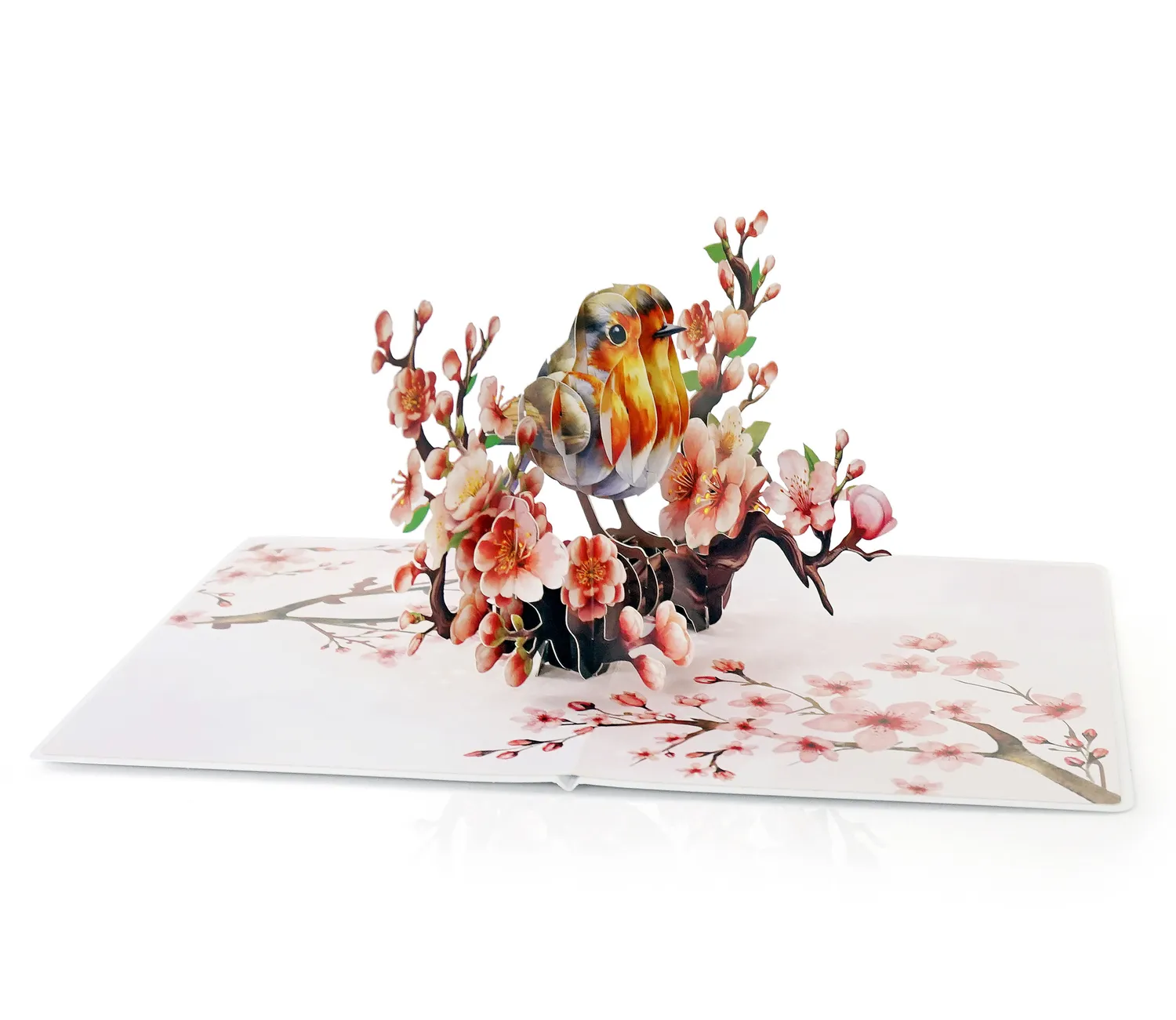 A Robin Birthday Greeting 3D Card Pop Up showcases a delicate and elegant greeting card featuring a 3D design of a bird perched on a blossoming branch. The bird, with its warm tones of brown, orange, and white, appears lifelike, sitting among beautiful cherry blossoms.