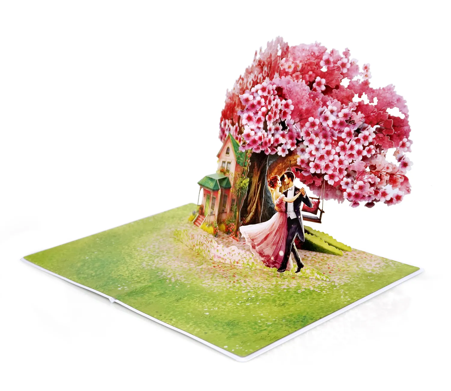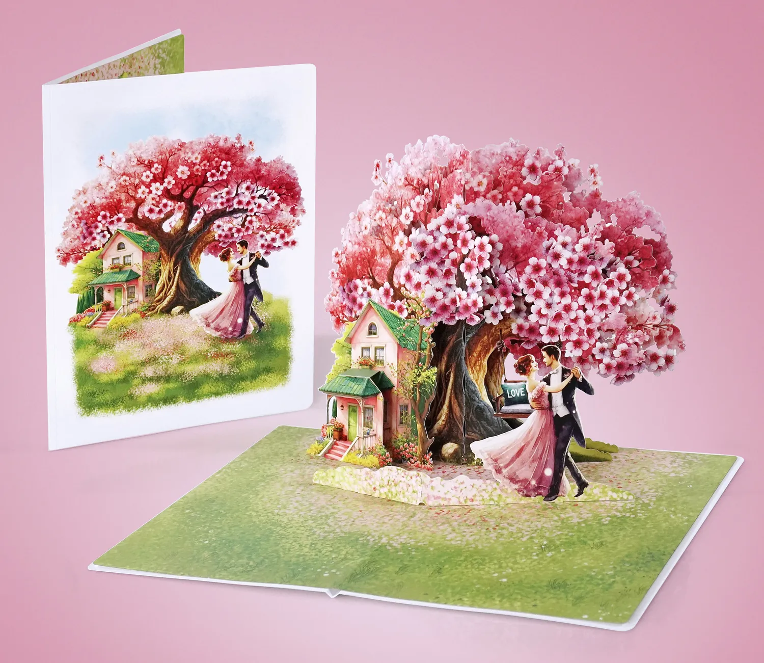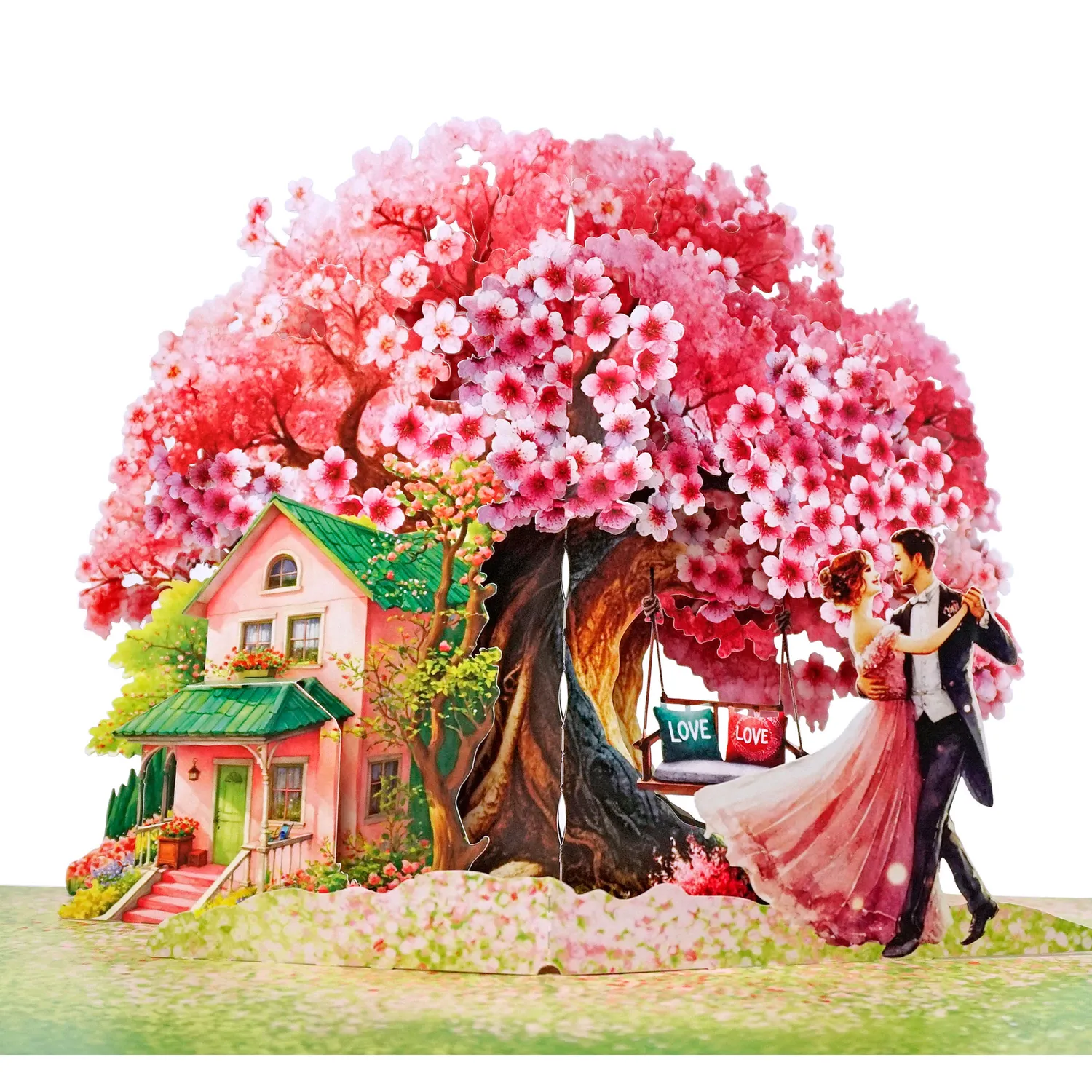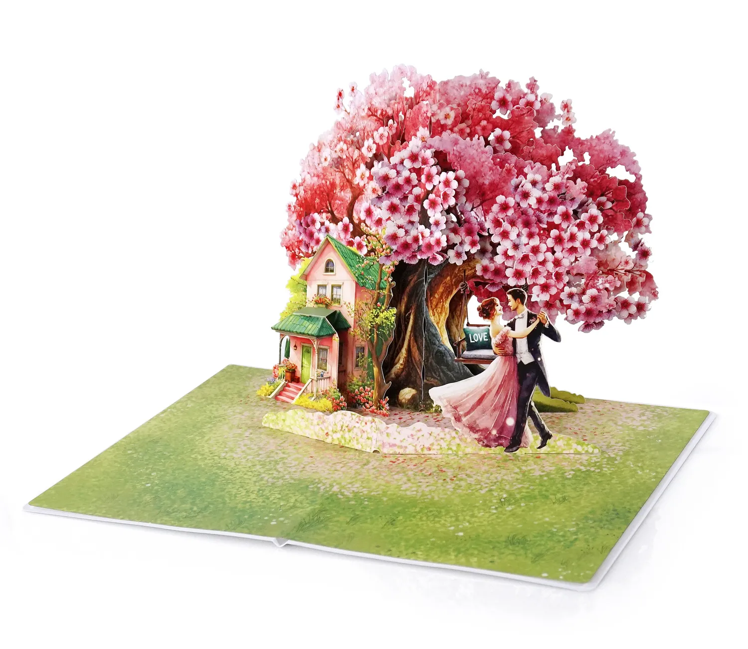 A romantic 3D pop-up-card dancing couple simulate there is a large, vibrant cherry blossom tree with pink and white flowers in full bloom. The tree’s branches spread widely, creating a picturesque setting. Beneath the tree, there is a charming pink house with a green roof, surrounded by lush greenery and flowers, giving it a cozy and inviting appearance.