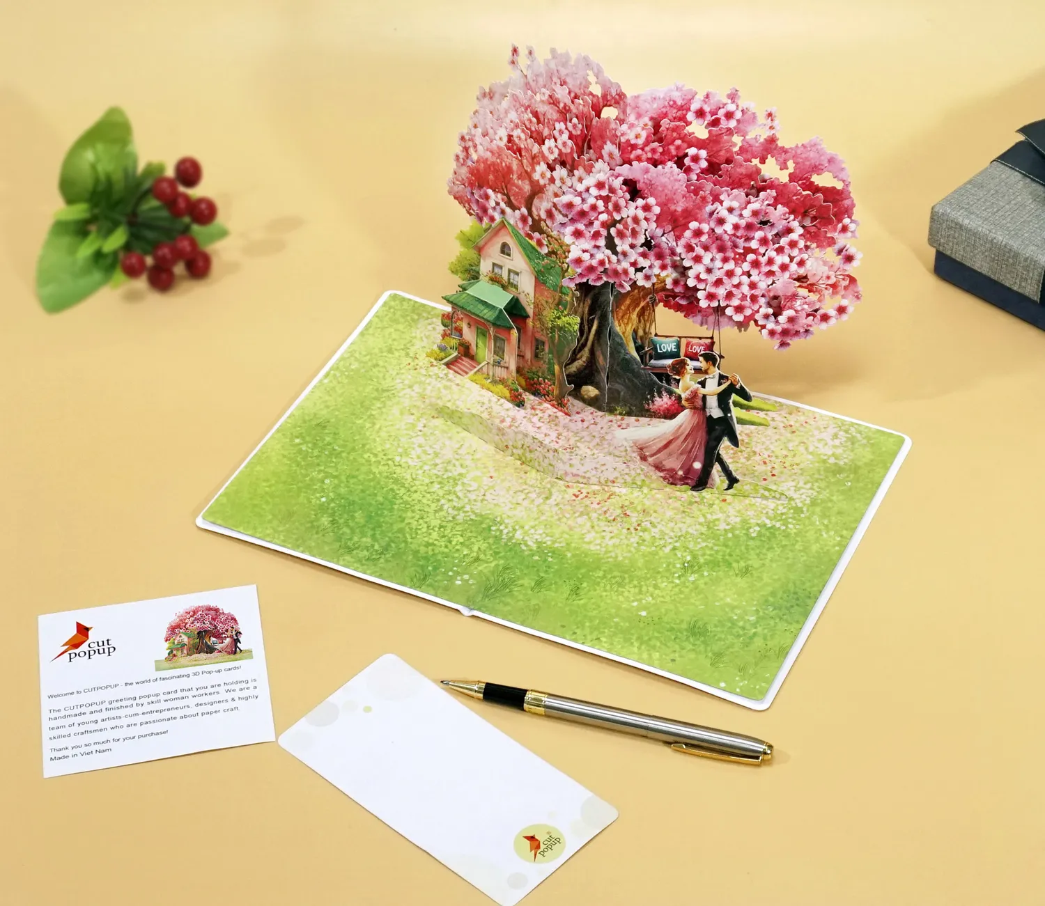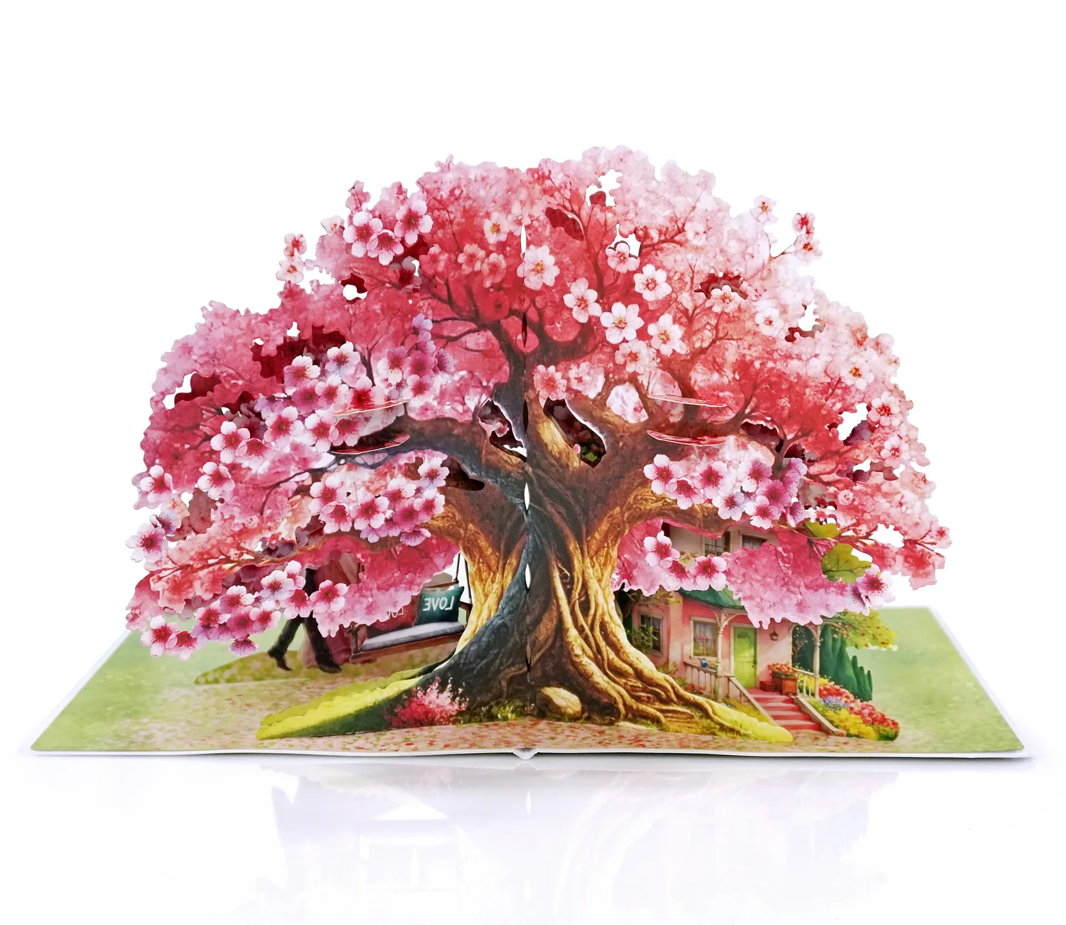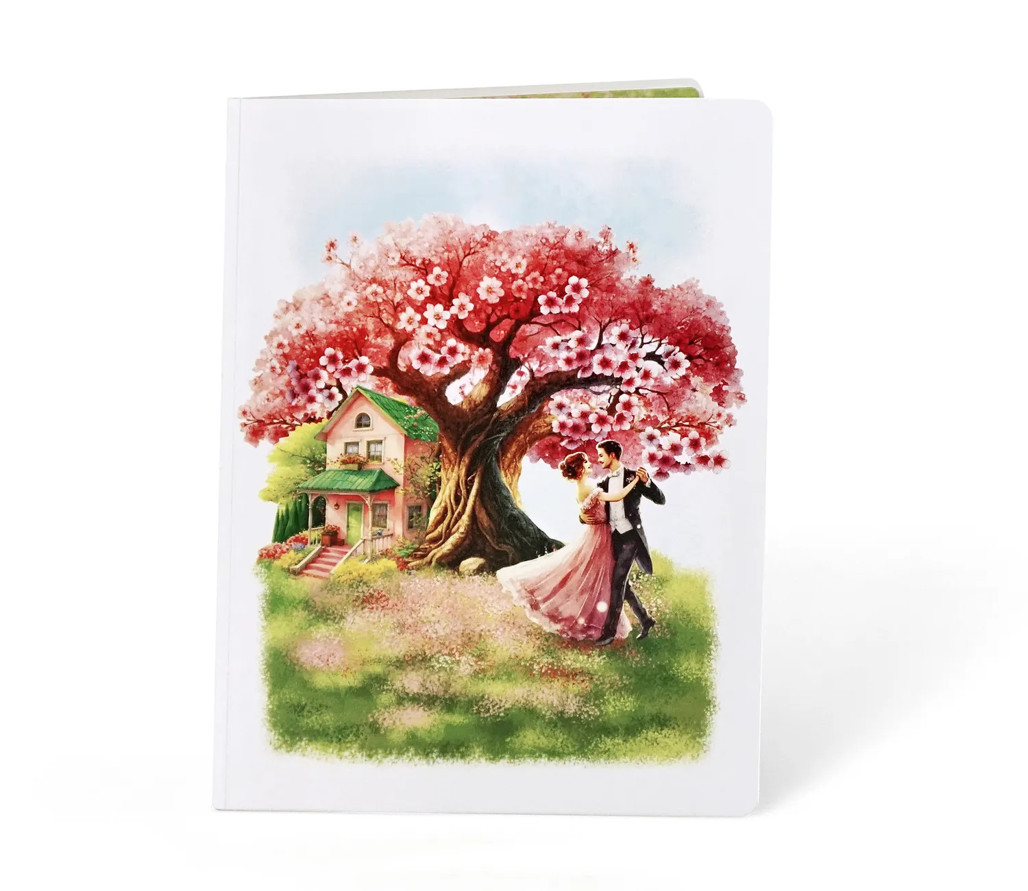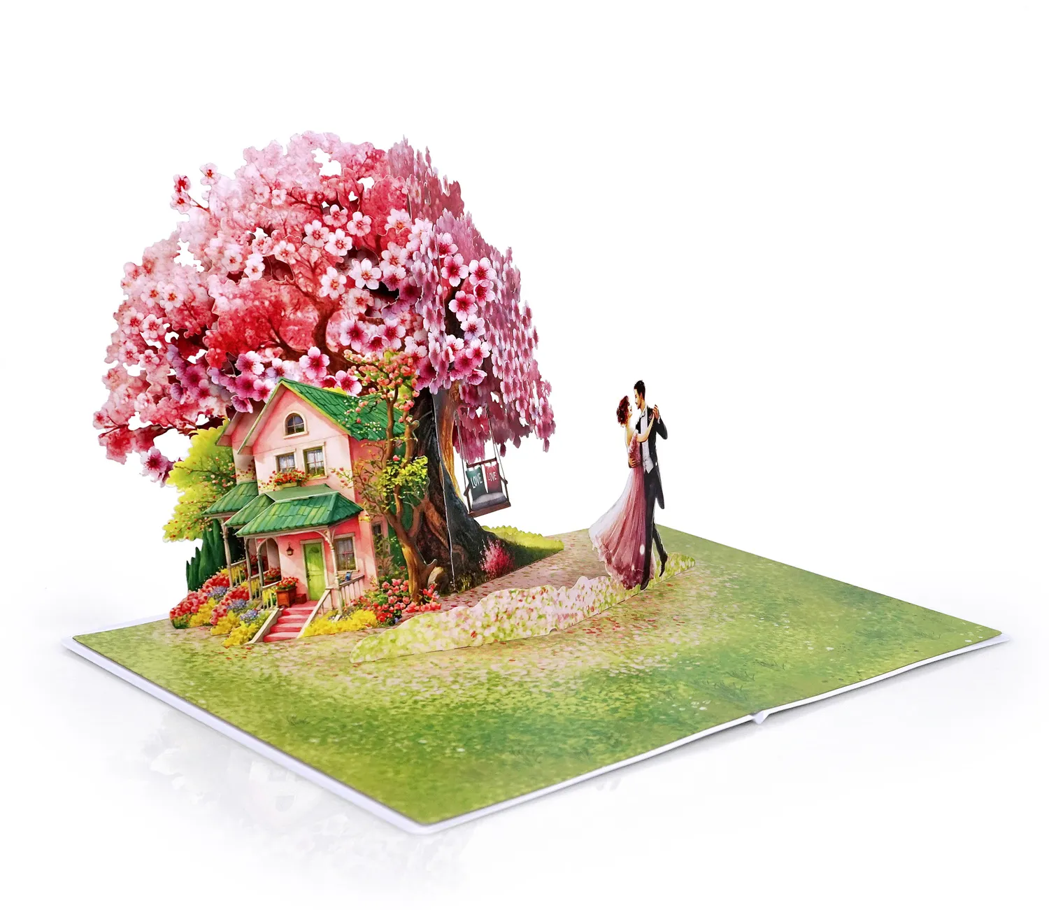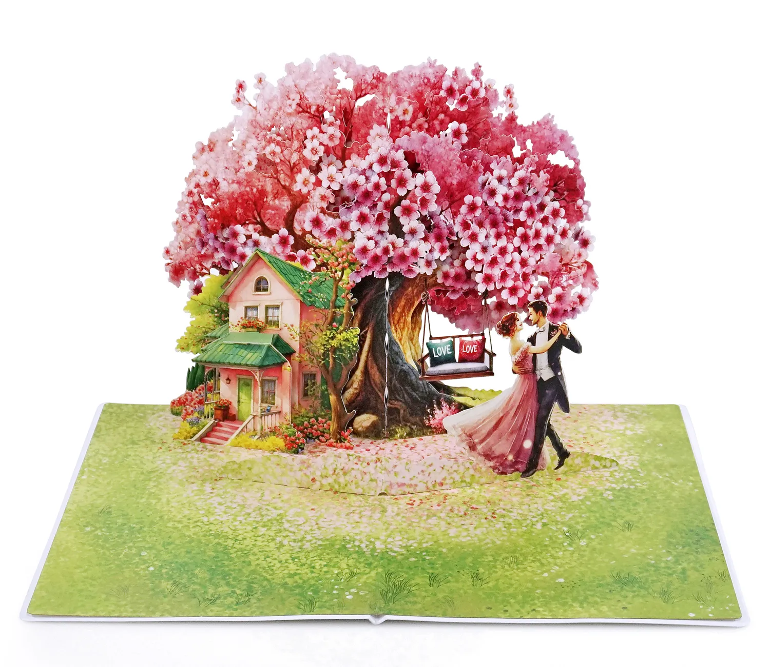 A romantic 3D pop-up-card dancing couple simulate there is a large, vibrant cherry blossom tree with pink and white flowers in full bloom. The tree’s branches spread widely, creating a picturesque setting. Beneath the tree, there is a charming pink house with a green roof, surrounded by lush greenery and flowers, giving it a cozy and inviting appearance.