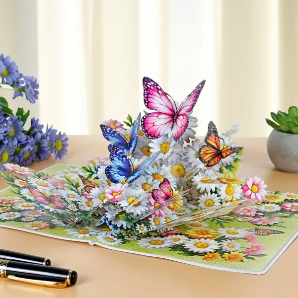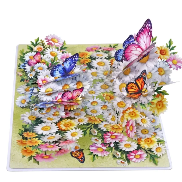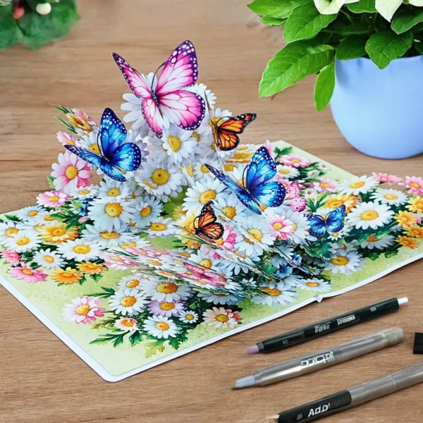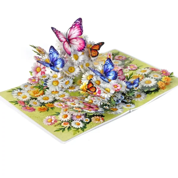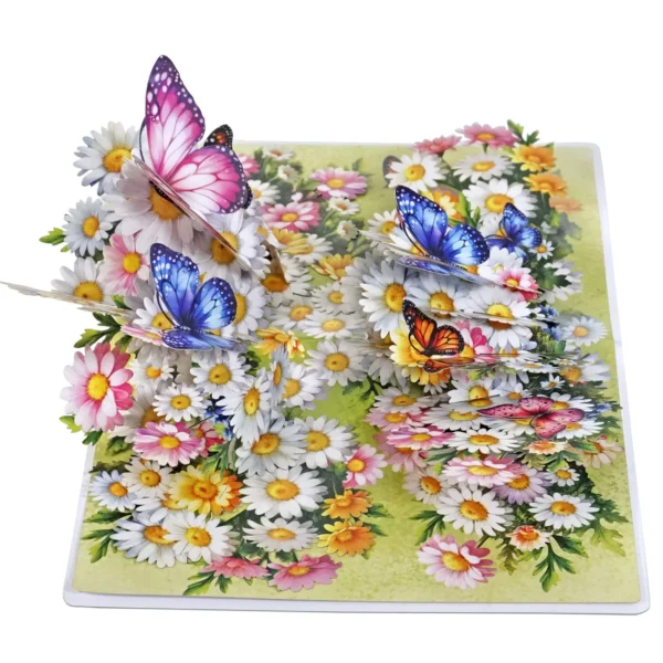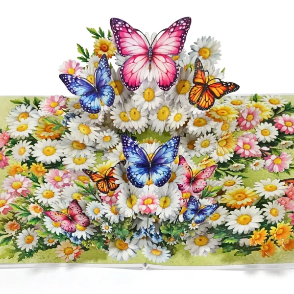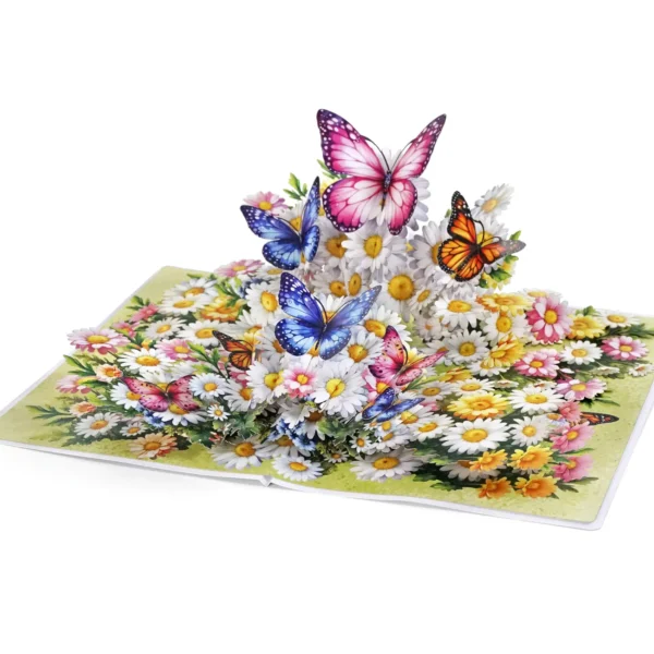 Thank you 3D pop up card for Mother’s Day or Birthday designed with the centerpiece features a vibrant bouquet of white daisies and colorful flowers, including pink, yellow, and orange blossoms. Surrounding and perched on the flowers are several large, intricately detailed butterflies in various colors, such as pink, blue, orange, and purple. The butterflies appear to be fluttering above the bouquet, adding a lively and whimsical touch to the card. The background is a soft green, enhancing the fresh, springtime feel of the design.