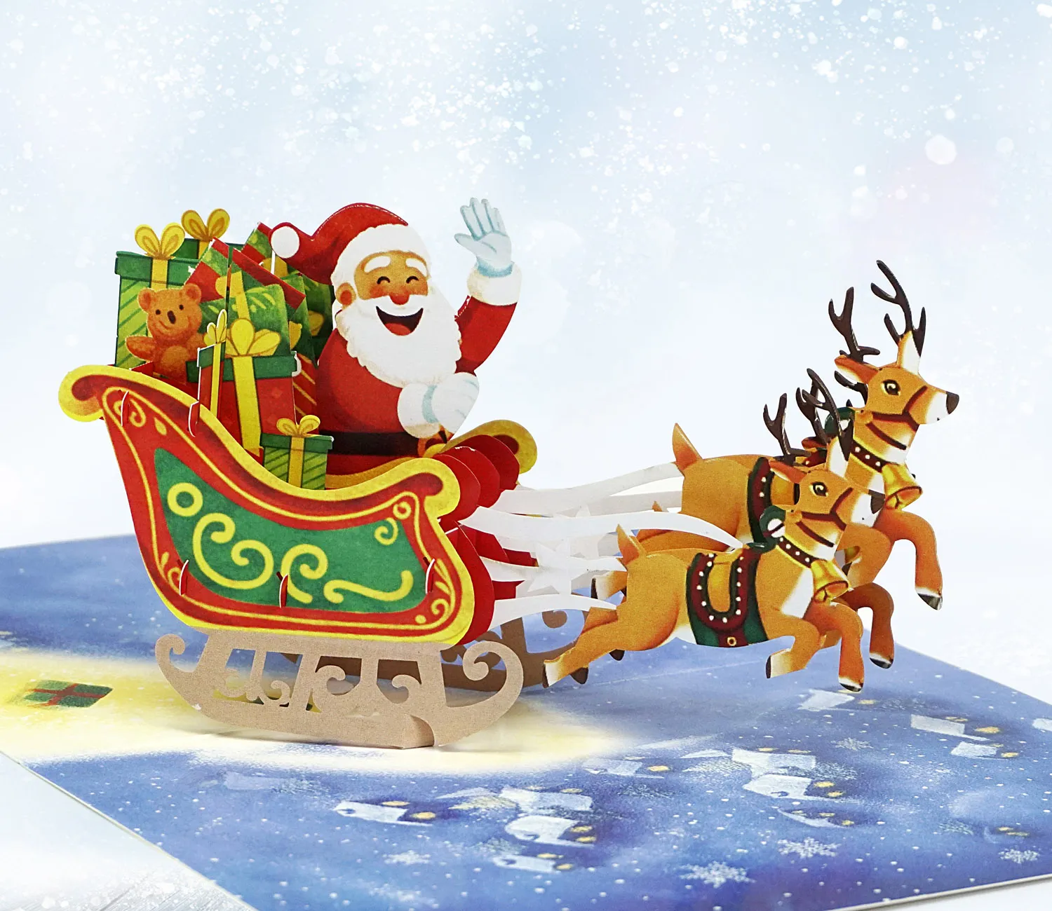 Nothing says “Christmas is here” quite like Santa gliding through the snowy sky. The Santa & Sleigh pop-up card captures this iconic moment with incredible detail. When the card opens, Santa waves joyfully, seated in a beautifully decorated sleigh pulled by reindeer mid-flight. The 3D sculpture bursts with color and motion, making it a favorite among children, parents, and anyone who cherishes childhood memories of waiting for Santa. This design is ideal for sending to families with young kids, or to spread festive fun to friends and colleagues. It’s a little slice of Christmas adventure tucked neatly inside an envelope.